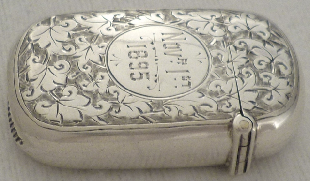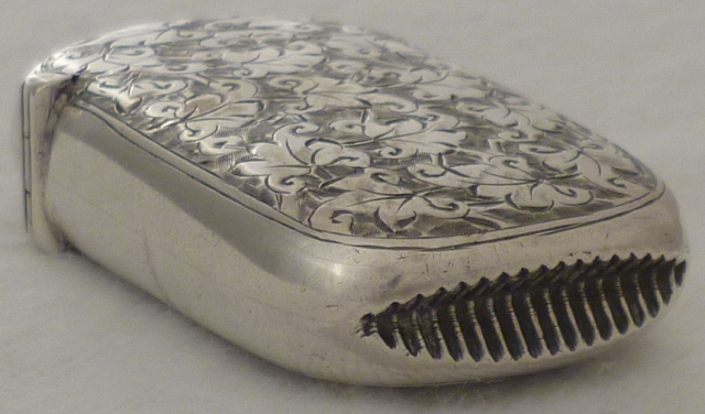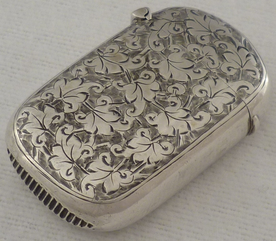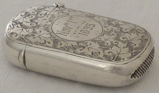 DESCRIPTION | Left handed, rounded Victorian silver vesta case with foliate engraved decoration, date engraved cartouche and a silver strike. |
