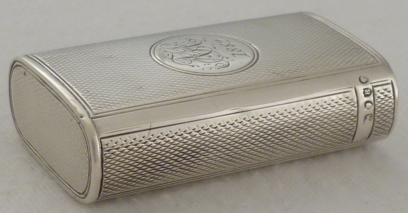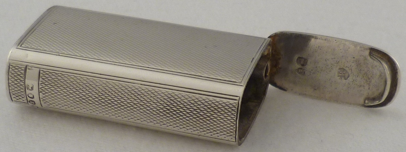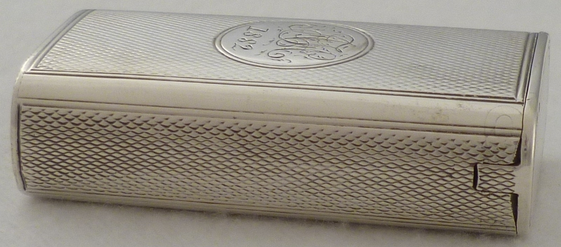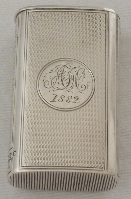 DESCRIPTION | Large and unusual Victorian silver vesta case with engine turned decoration and circular cartouche engraved with monogram and date. |