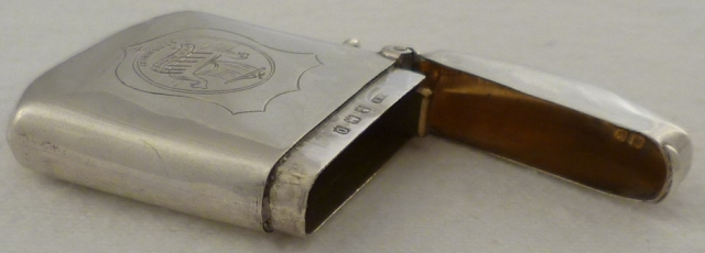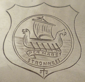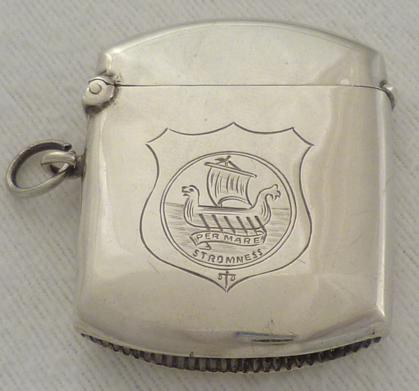 DESCRIPTION | Unusually shaped vesta case with a silver strike, gilded interior and an unusual engraving. Stromness is in the Orkney Islands, Scotland and the image of the Viking ship above the motto 'per mare' meaning 'by sea' is taken from the old seal of the Burgh. |