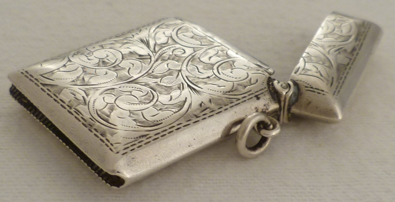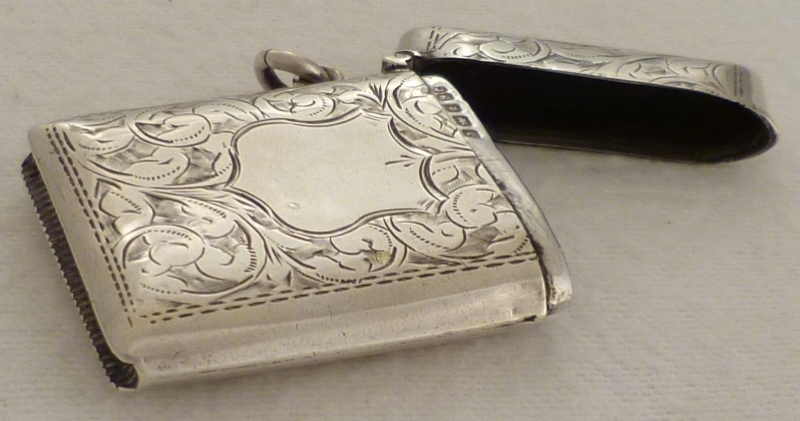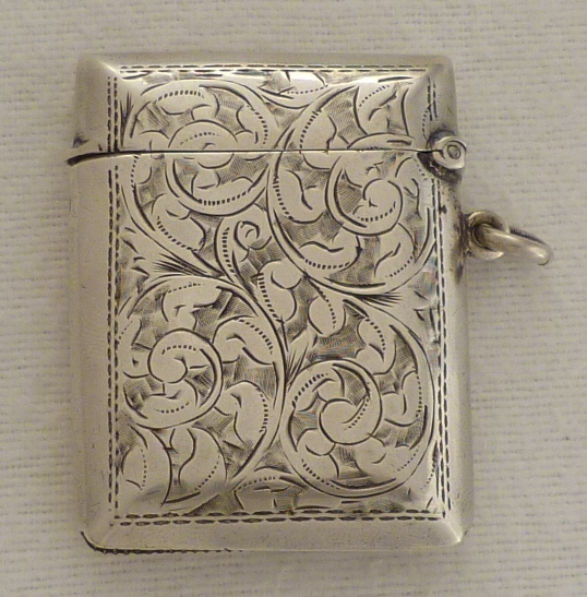 DESCRIPTION | Edwardian silver vesta case with engraved foliate decoration, a blank shield shaped cartouche, silver strike and suspension ring. |