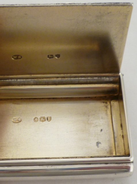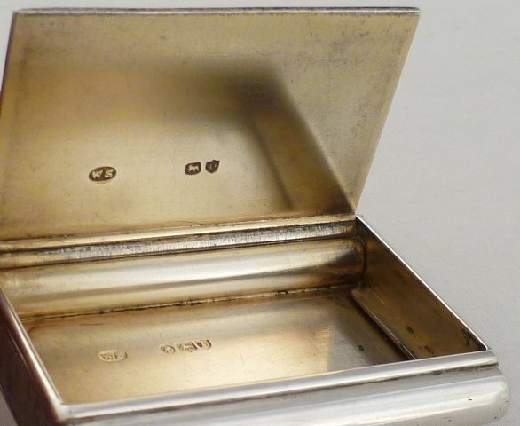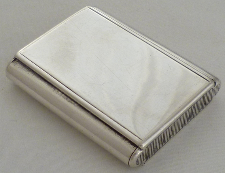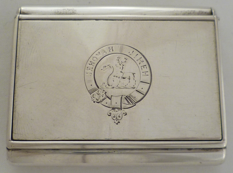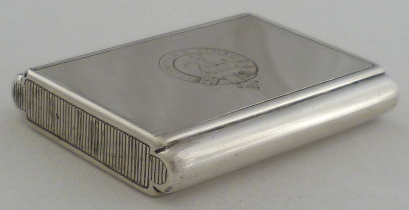 DESCRIPTION | Victorian silver vesta case with a gilded interior and silver strike to each end. The spring loaded lid is operated by pressing inwards one of the cushion sides. The lid is engraved with a motto encircling a double crest. |