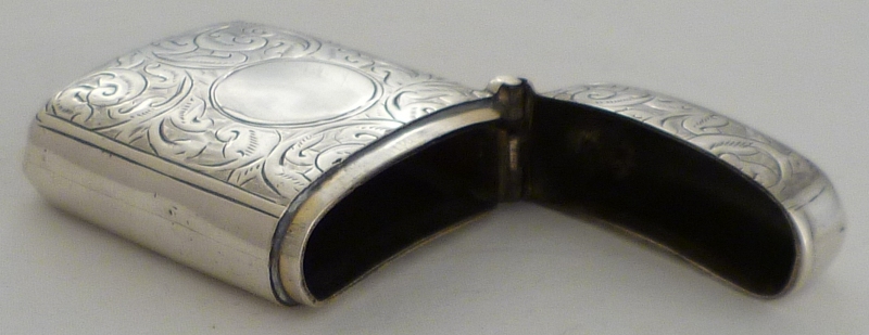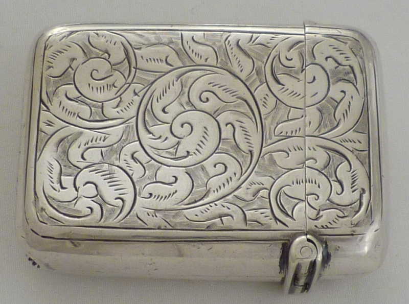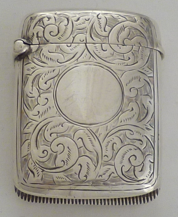 DESCRIPTION | Larger Victorian silver vesta case with engraved foliate decoration and a blank circular cartouche. |