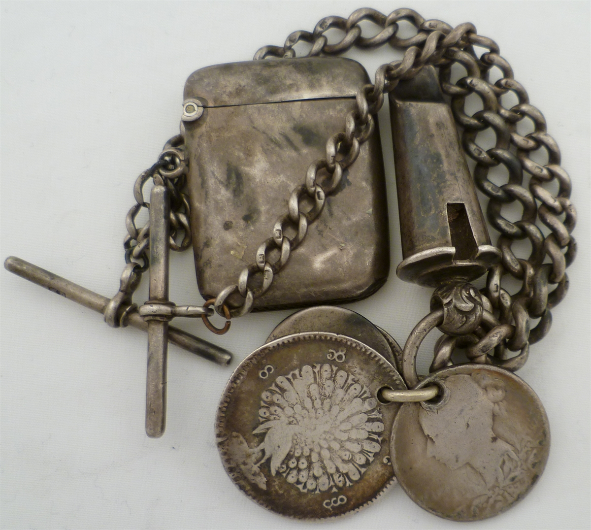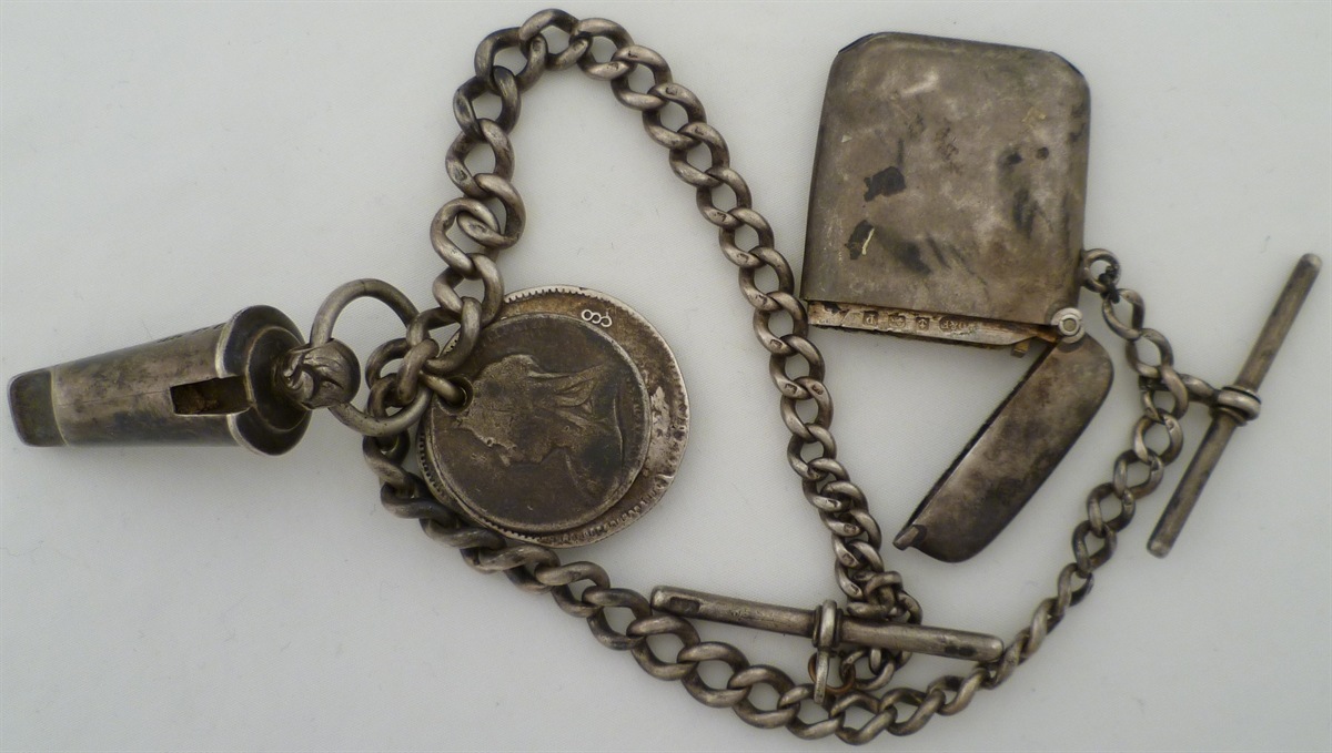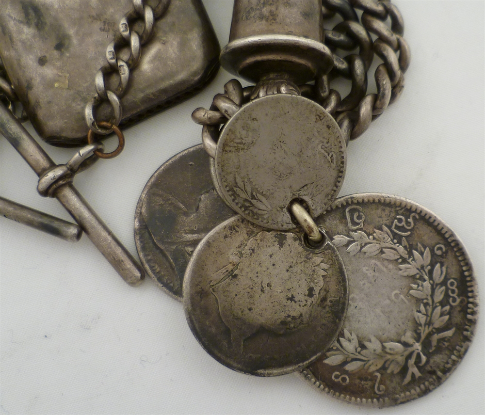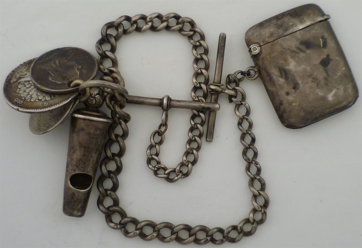 Edwardian solid silver Albert chain with various attachments. Each link is hallmarked with a lion passant for sterling silver, one T-bar is by Joseph Rogers, Sheffield 1904, the other is marked differently and