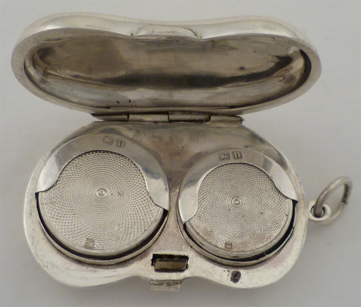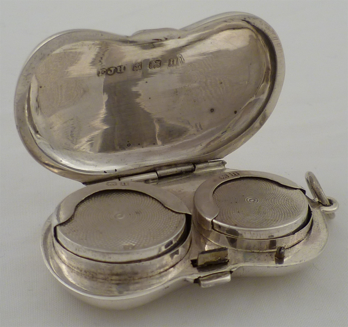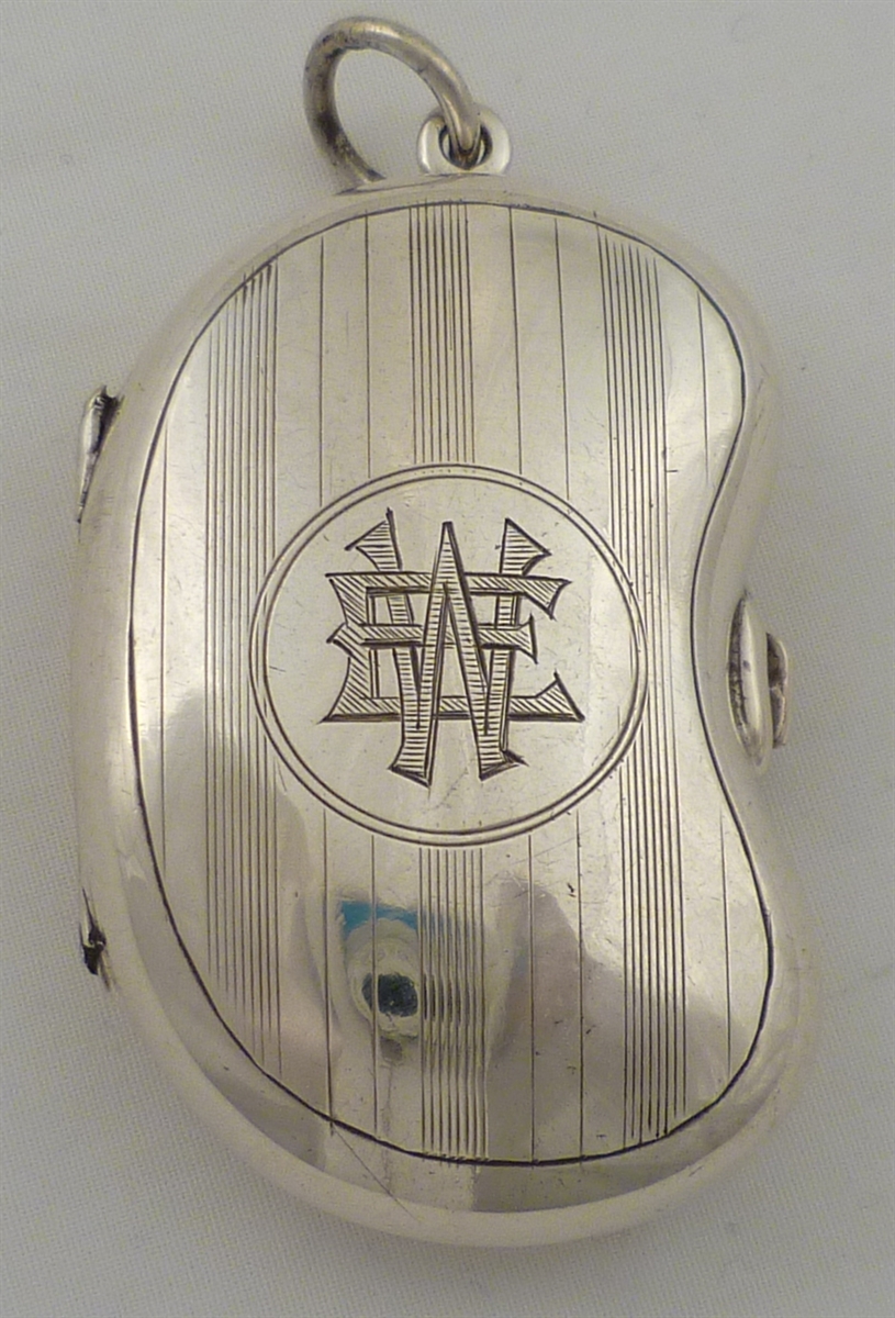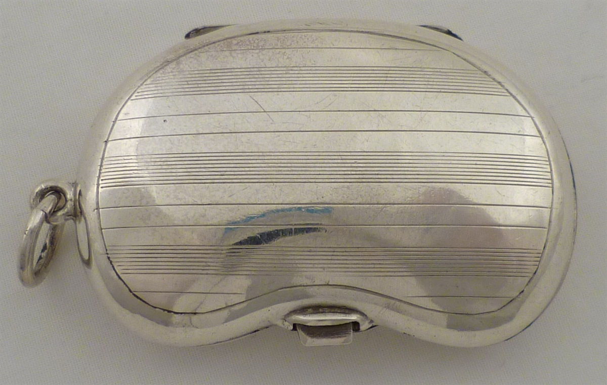 DESCRIPTION | Unusual silver kidney shaped sovereign case with two spring loaded tables, one for full and one for half sovereigns. Case with engraved decoration and a monogram engraved cartouche. |