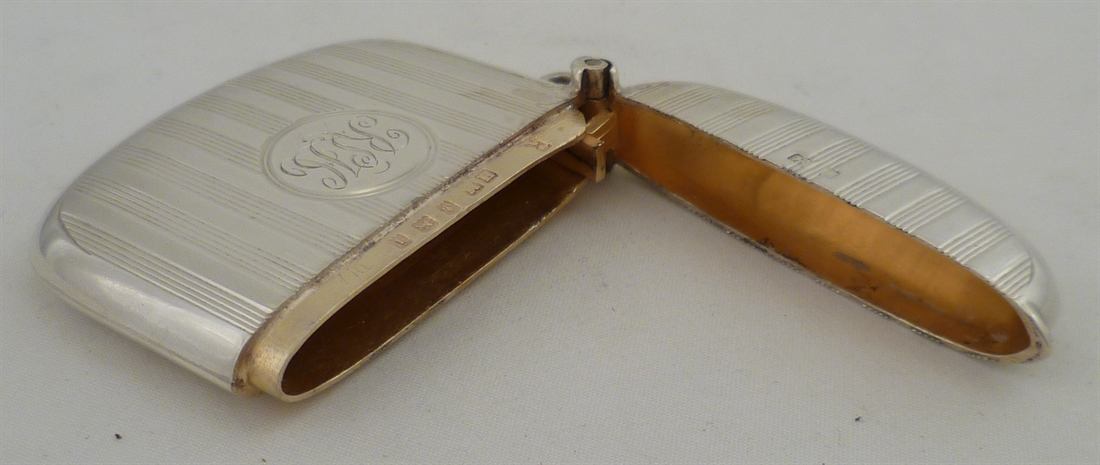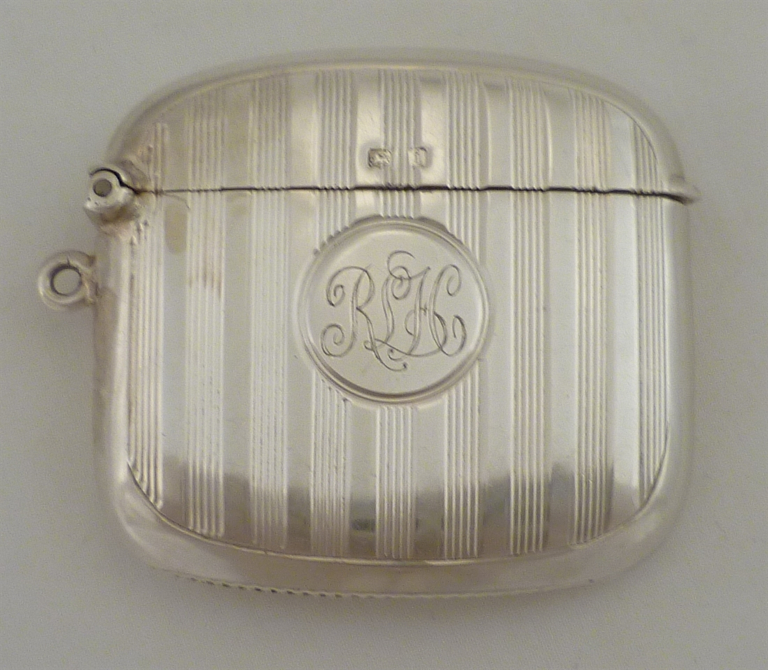 DESCRIPTION | Superb Edwardian solid sterling silver vesta case with engine turned decoration, monogram engraved cartouche, brightly gilded interior and a silver strike. |