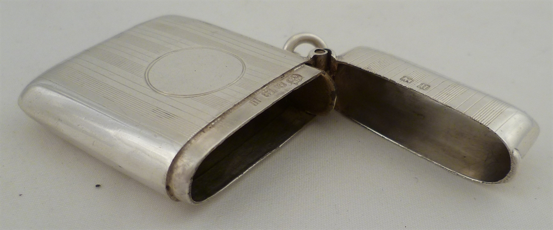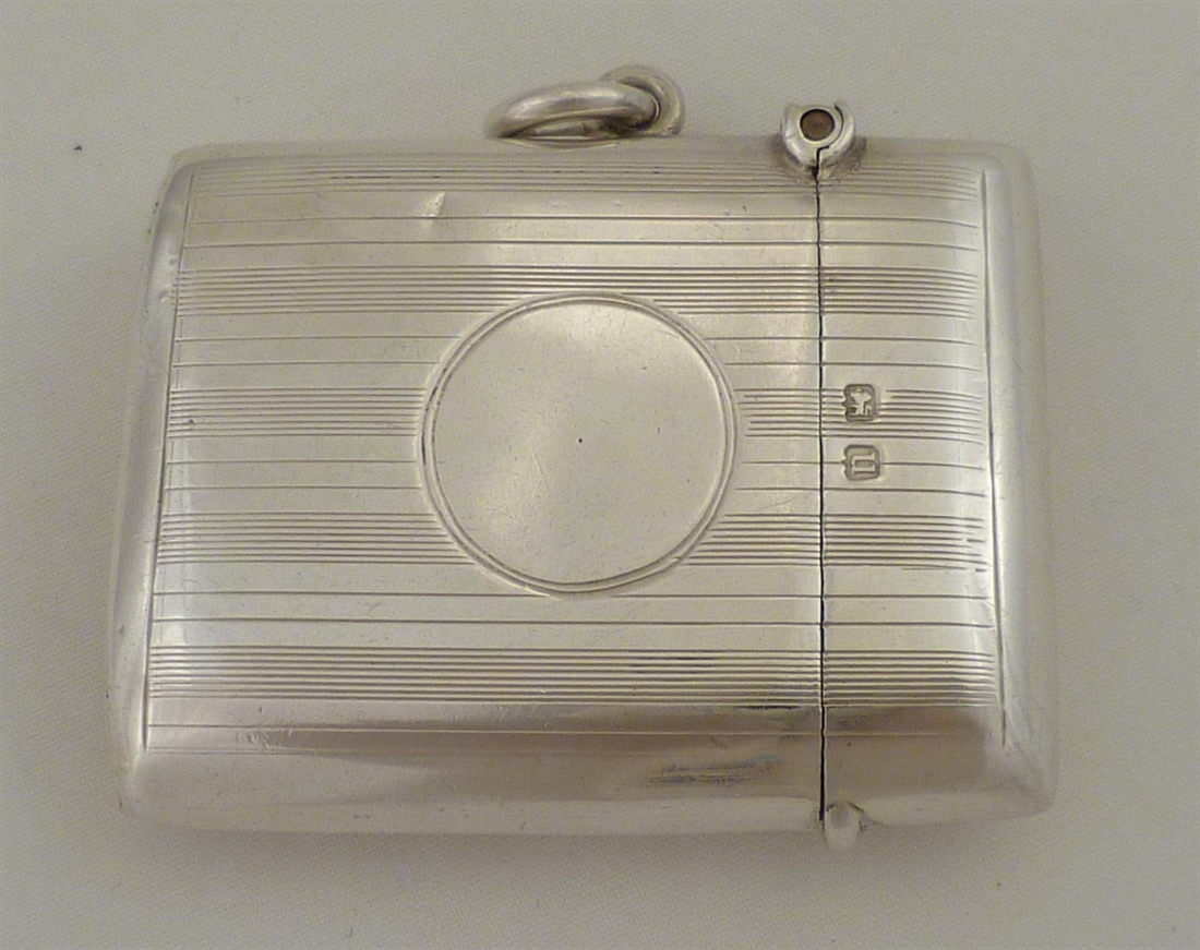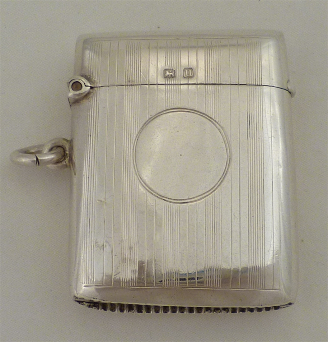 DESCRIPTION | Good solid sterling silver vesta case with engine turned decoration, blank cartouche and a silver strike. |