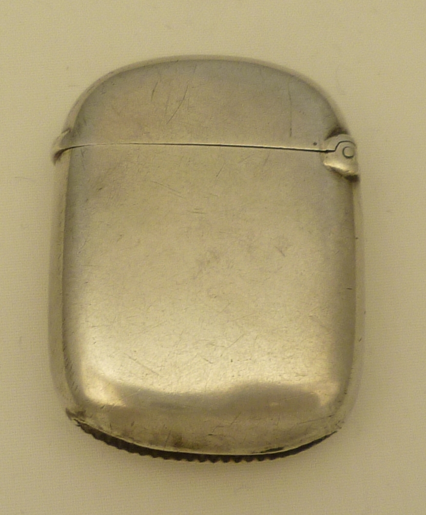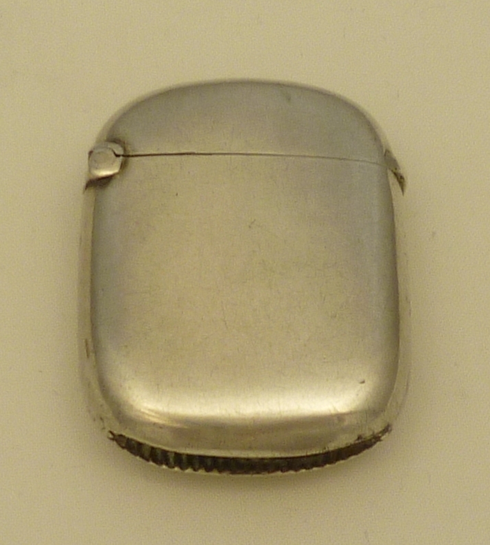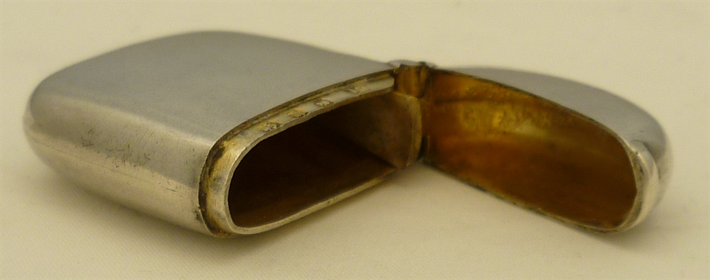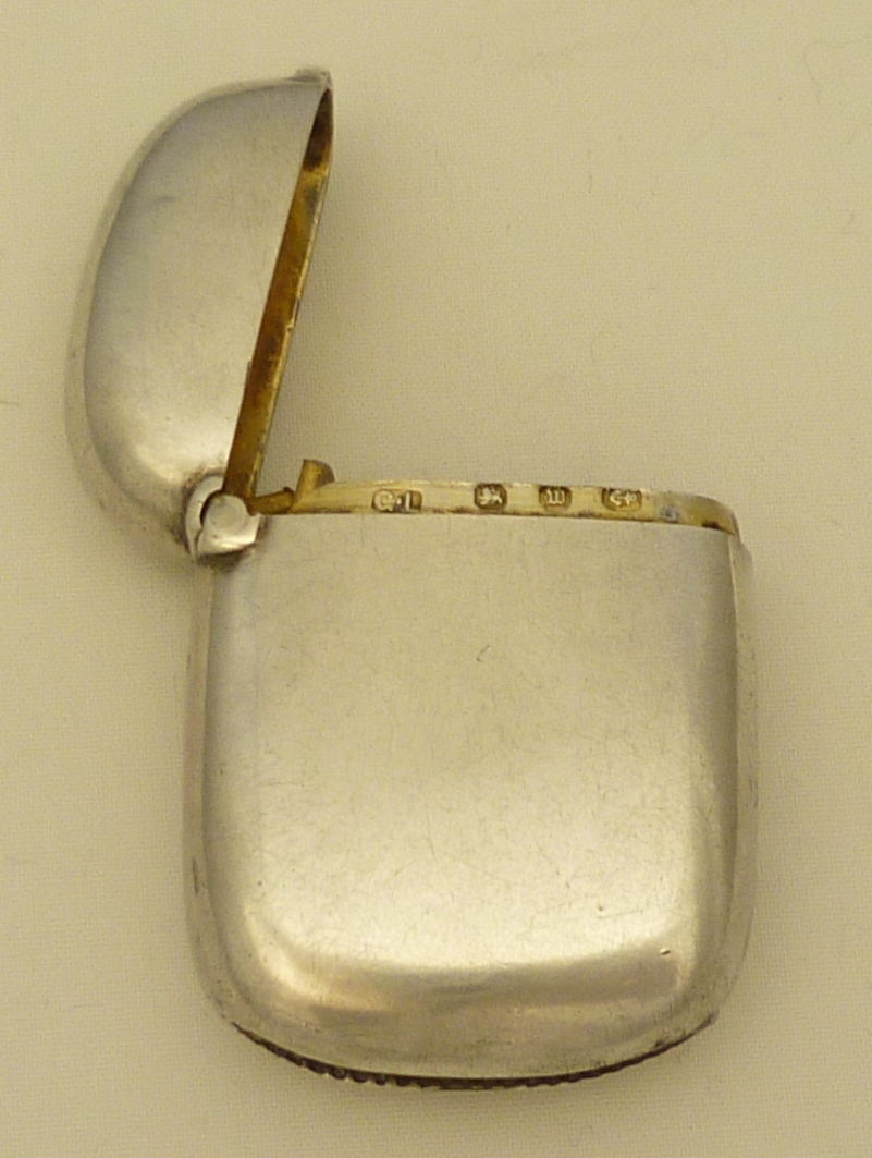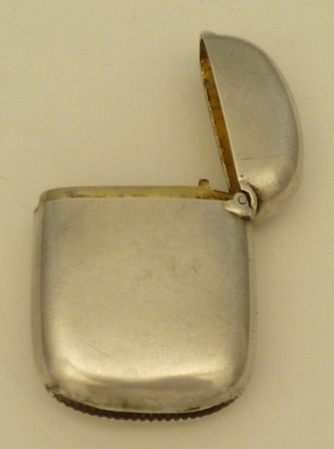 DESCRIPTION | Exceptionally good and original Victorian solid sterling silver gilt small vesta case with a silver strike and unusually no suspension ring. Early date, totally plain, no engraving or erasure. |