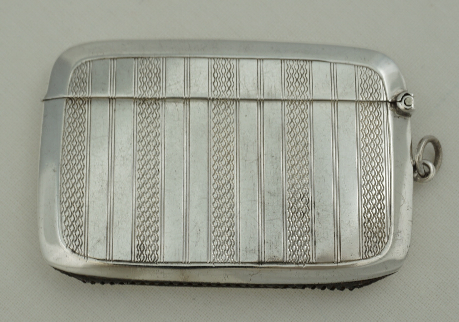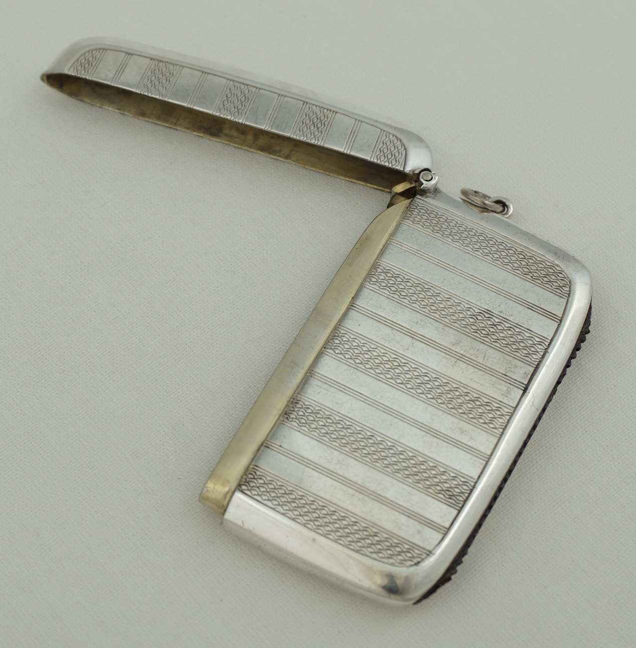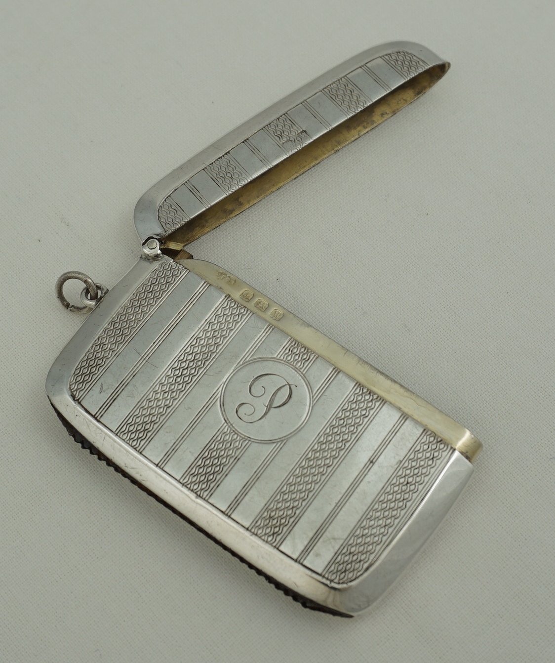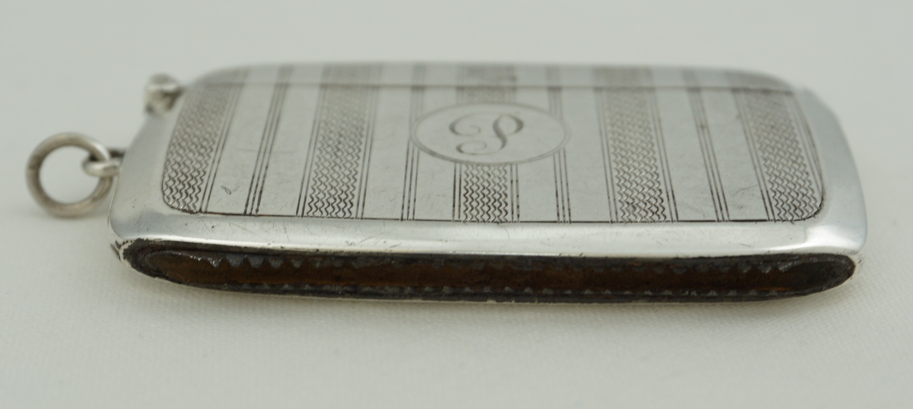 DESCRIPTION | Very good antique solid sterling silver vesta case of unusually wide form with engine turned engraved decoration and initial engraving to the frontal circular cartouche. |