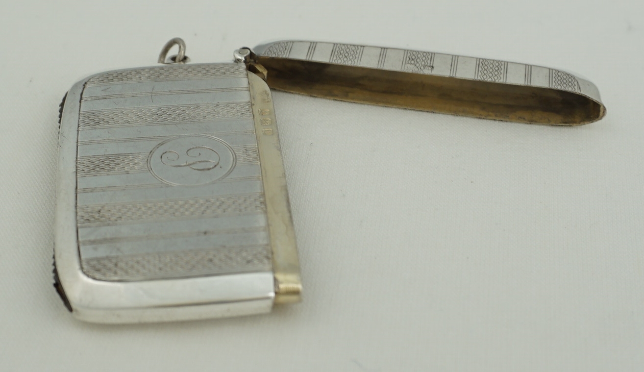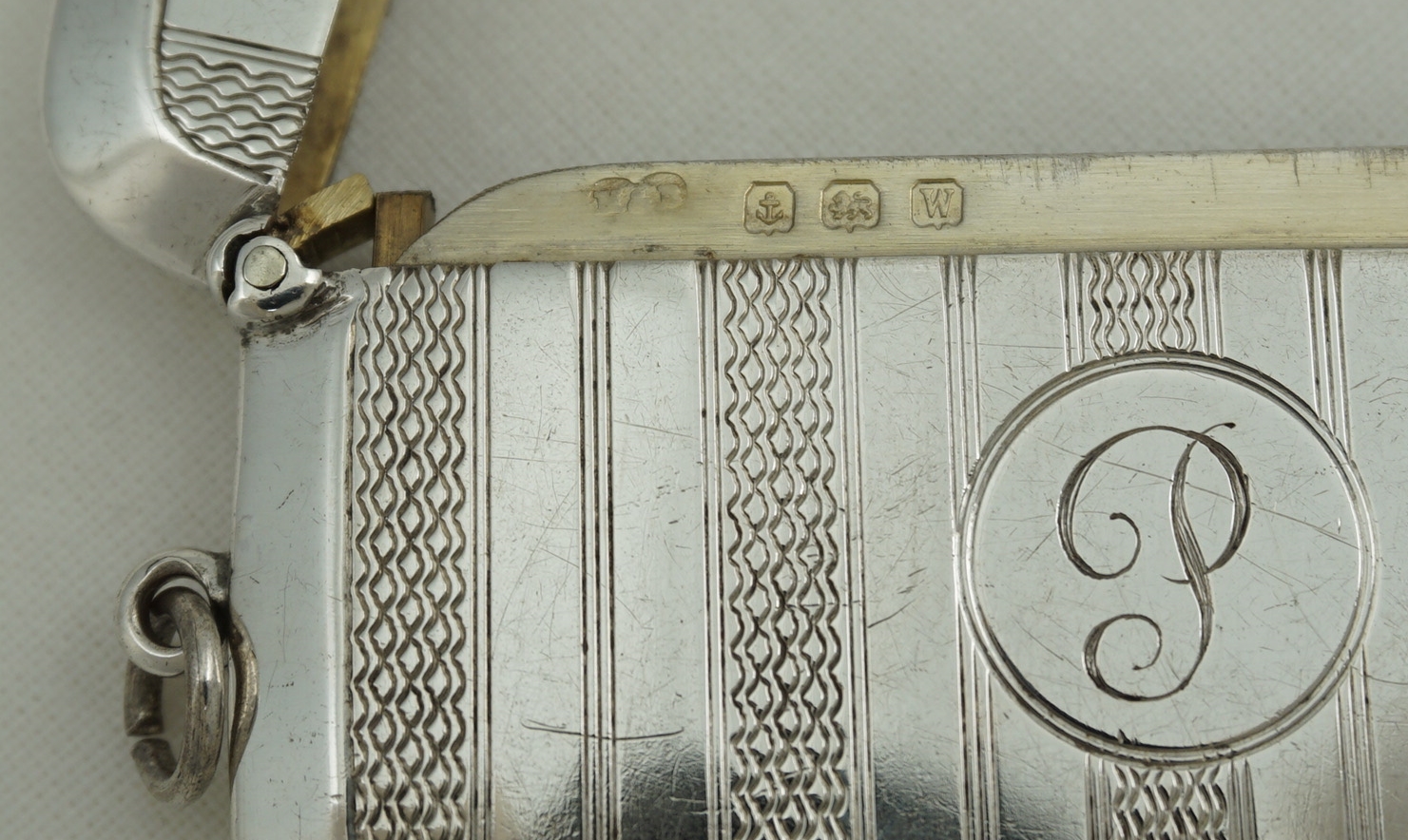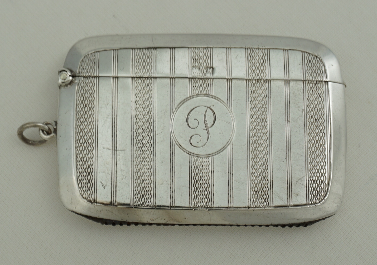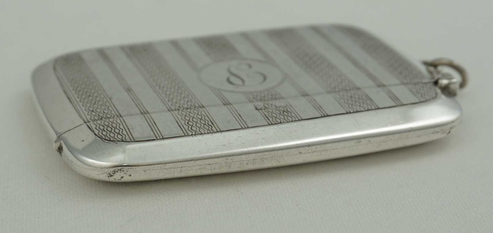 DESCRIPTION | Very good antique solid sterling silver vesta case of unusually wide form with engine turned engraved decoration and initial engraving to the frontal circular cartouche. |