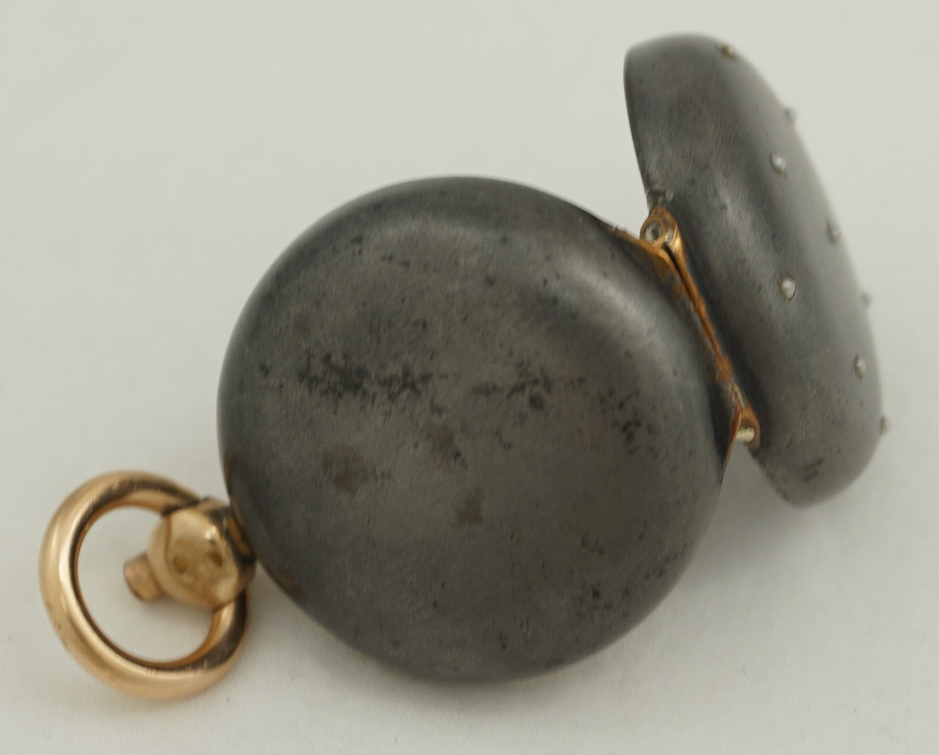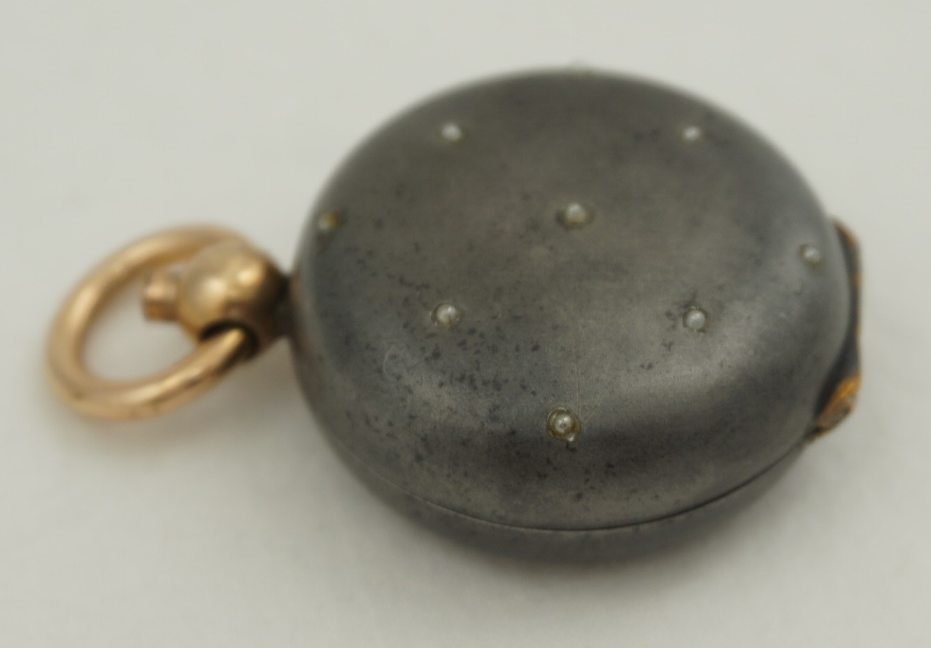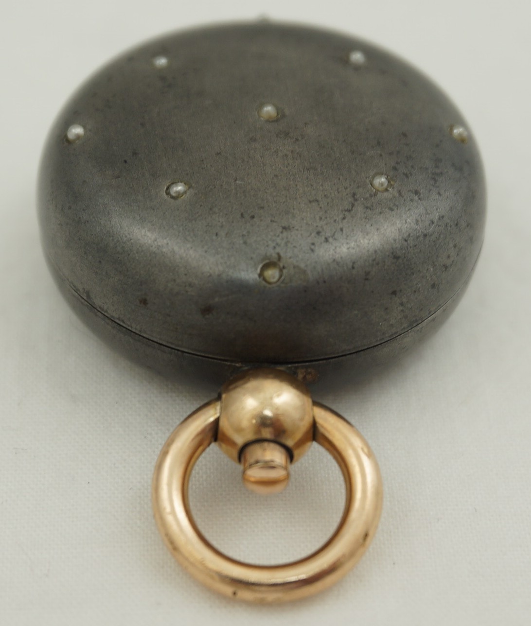 | DESCRIPTION | Unusual sovereign case made of steel, gold, gold plated white metal and set with imitation seed pearls. |