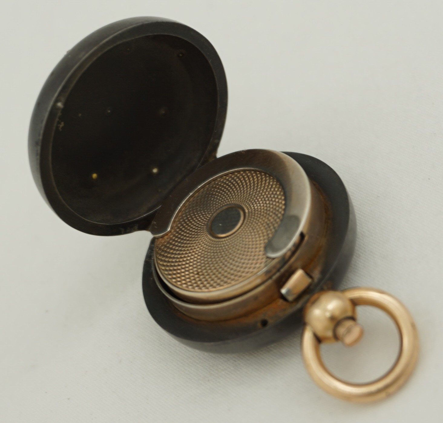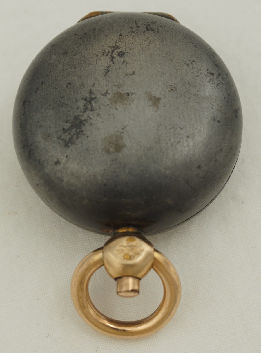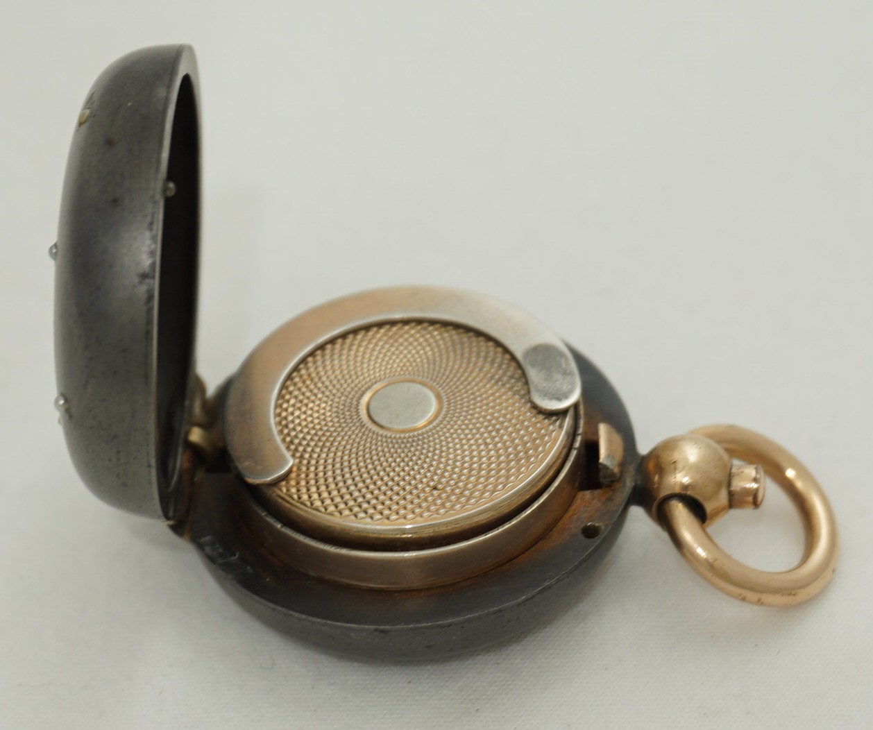 | DESCRIPTION | Unusual sovereign case made of steel, gold, gold plated white metal and set with imitation seed pearls. |