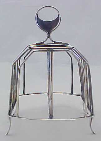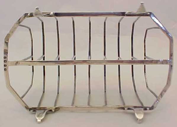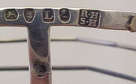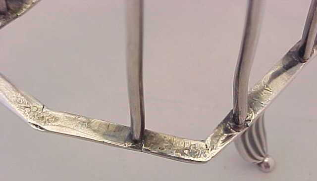 Few of the bars are perfectly straight and some have been re-soldered onto the base. There is also a repair to the base rim about 1 cm to the right of the hallmarks. |