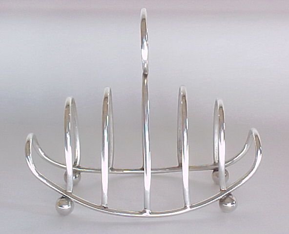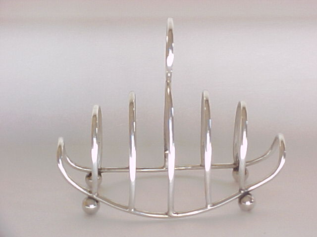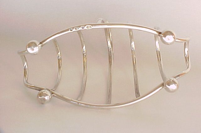 Edwardian silver 5-bar toast rack with central circular carrying handle, two passing handles and a wide smile. Full of character with most parts bent one way or another. The silver bars move quite easily just using fingers and so if you enjoyed doing Rubik's cube you may enjoy playing with this one. |