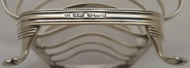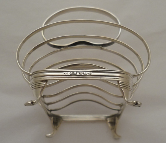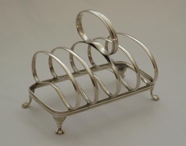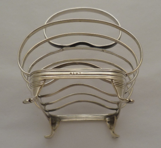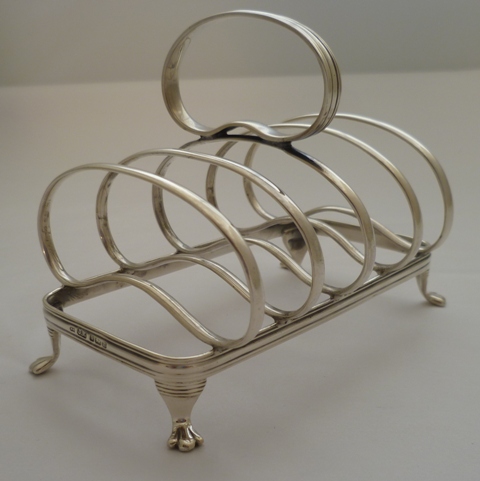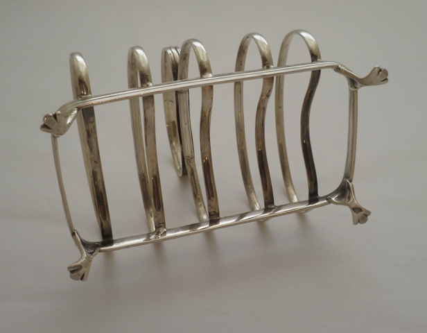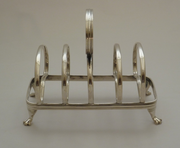 Elegant Edwardian silver 5-bar toast rack with thread decoration and paw feet. |