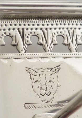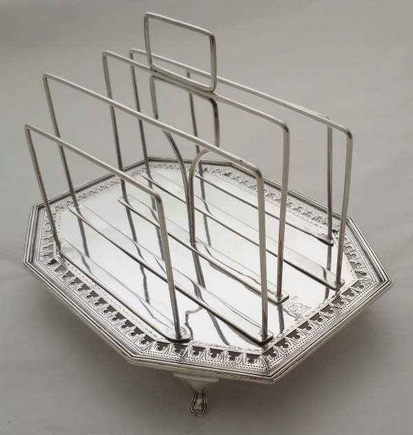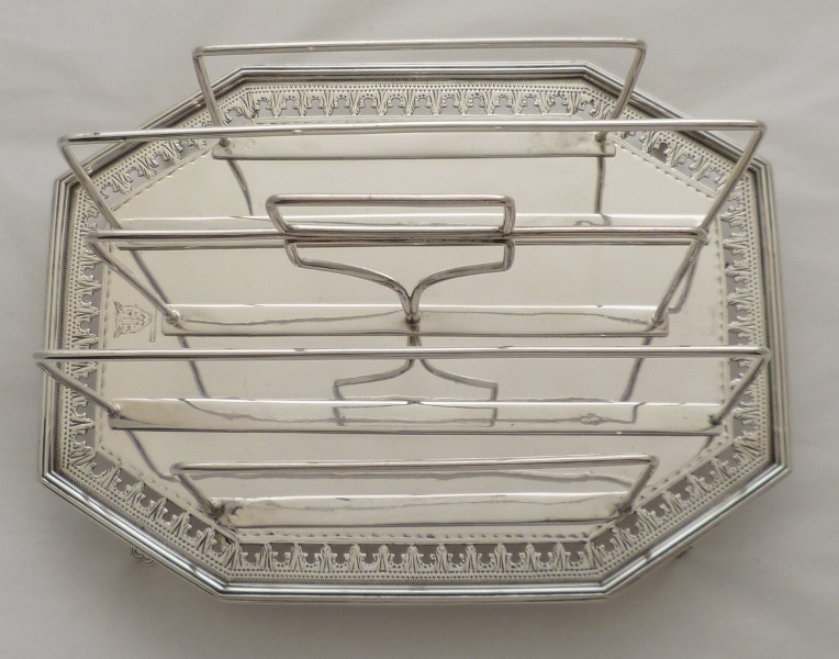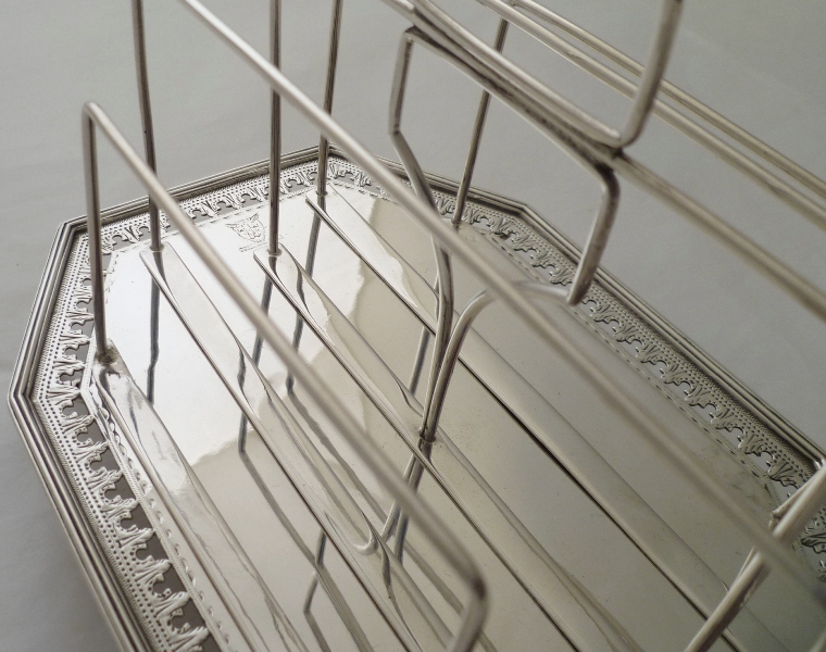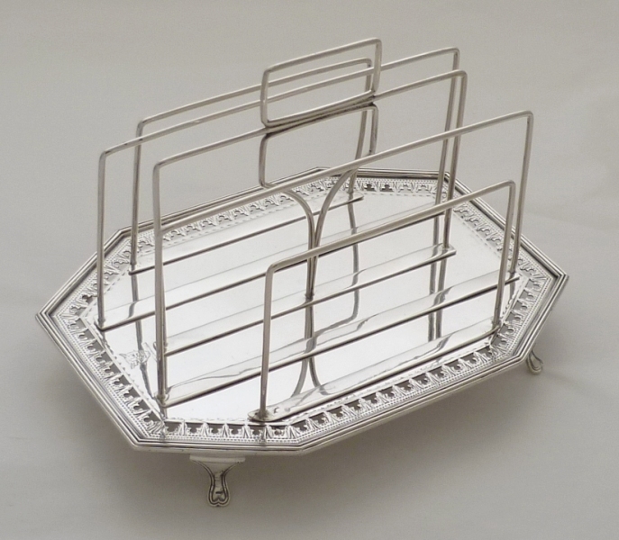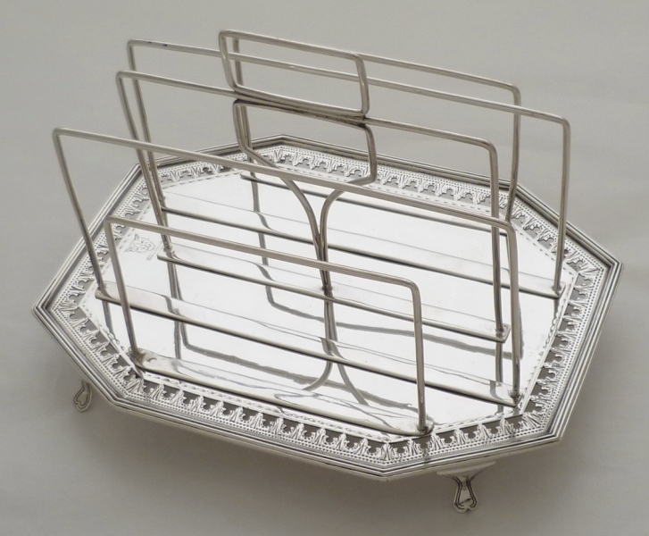 A very large Georgian silver 5-bar toast rack with thread decorated and pierced borders, four heart decorated feet and a lion's head crest. Probable conversion from a tea pot stand. |