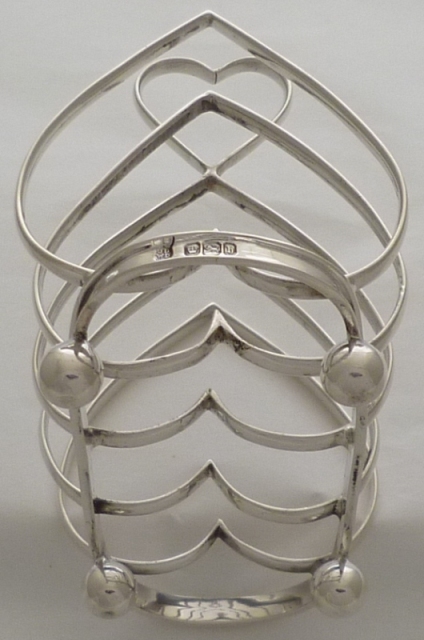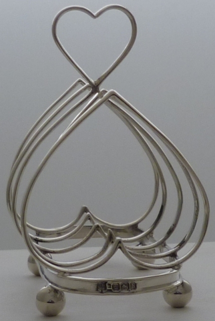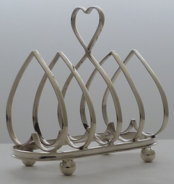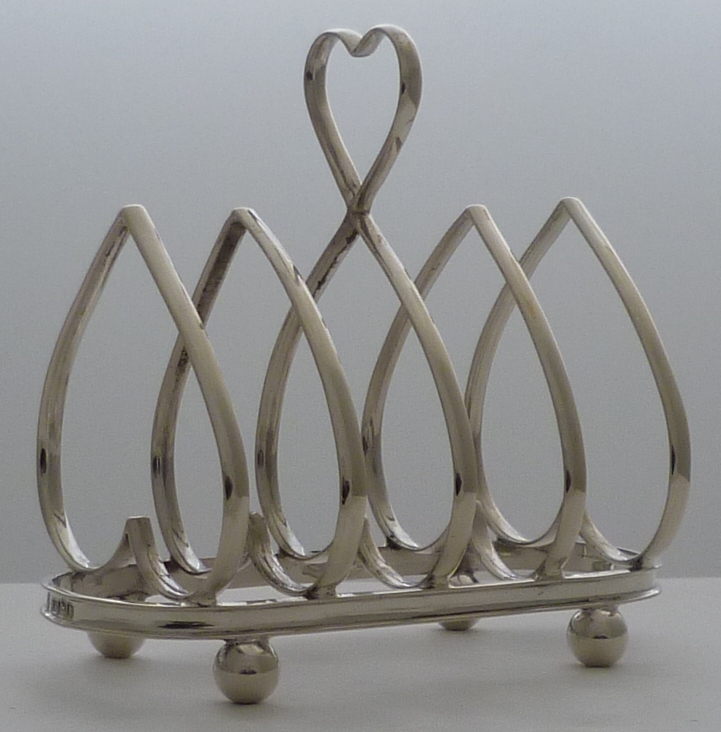 Victorian silver hearts 5-bar toast rack with a heart shaped handle and four ball feet. |