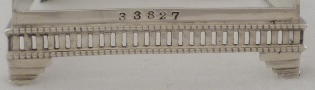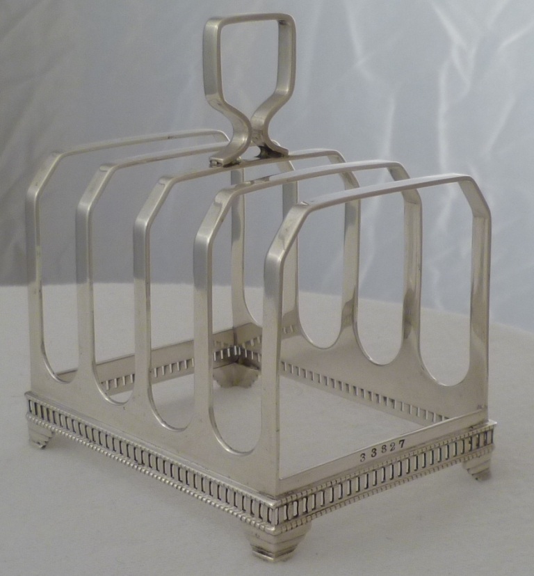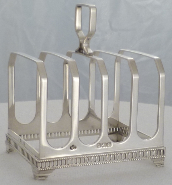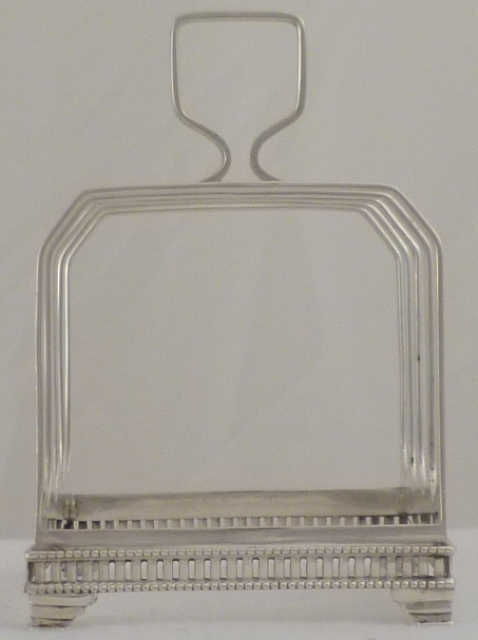 DESCRIPTION | Pretty 5-bar silver toast rack with a slat pierced and bead edged base rim atop four bracket feet. |