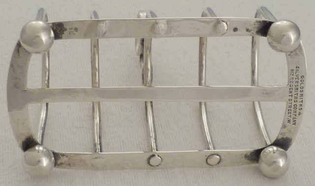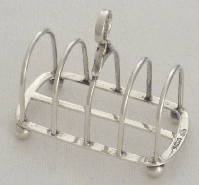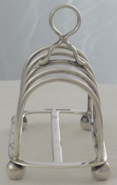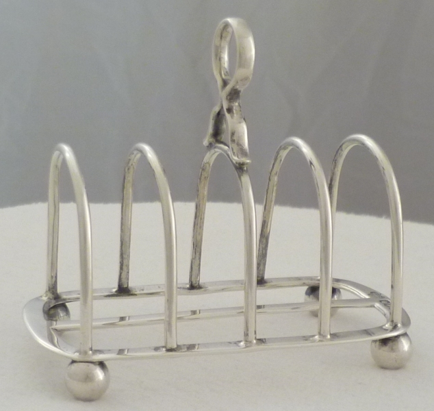 DESCRIPTION | Nice quality and solid 5-bar silver toast rack on four ball feet and with a carrying handle. |