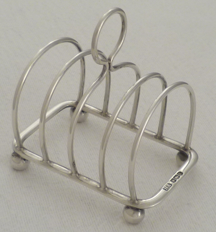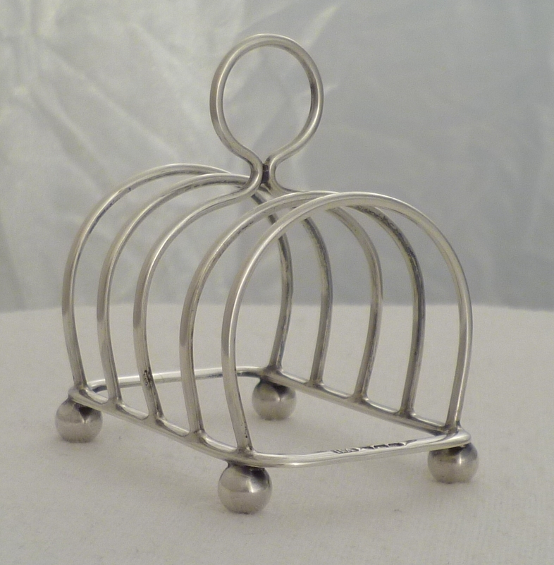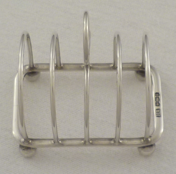 DESCRIPTION | Smaller 5-bar silver toast rack on four ball feet and with a carrying handle. |
