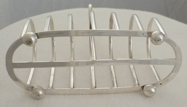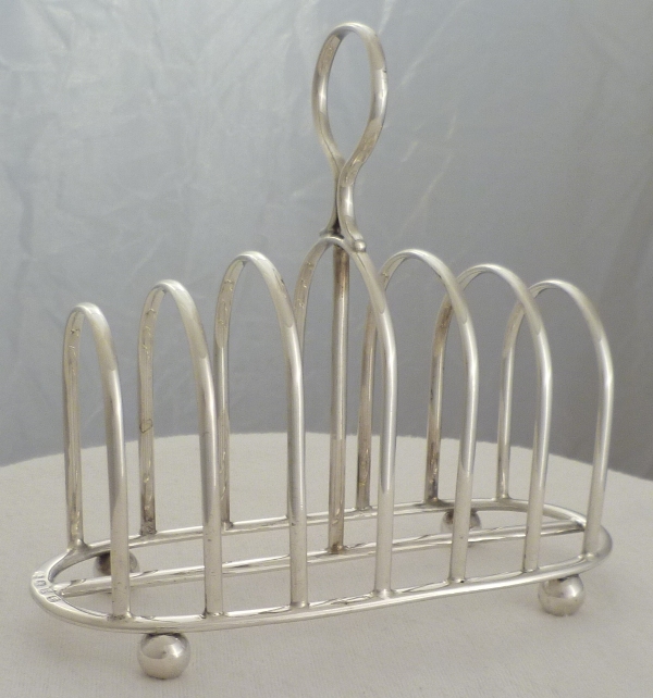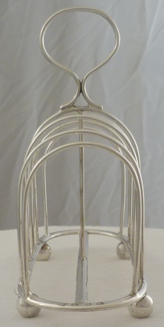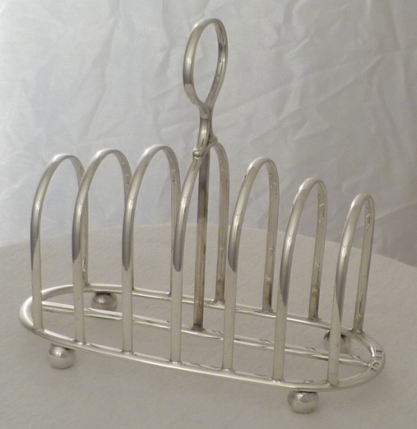 DESCRIPTION | Long and tall 7-bar Victorian silver toast rack with a ring handle and four ball feet. |