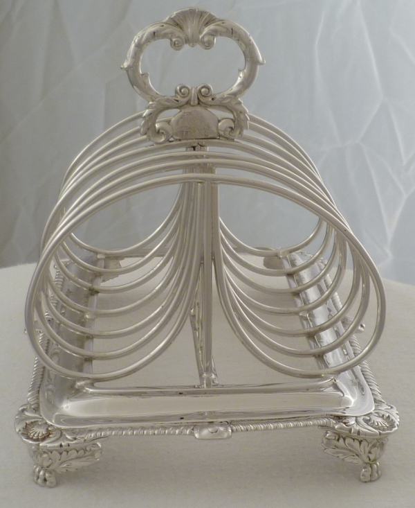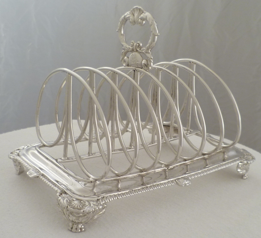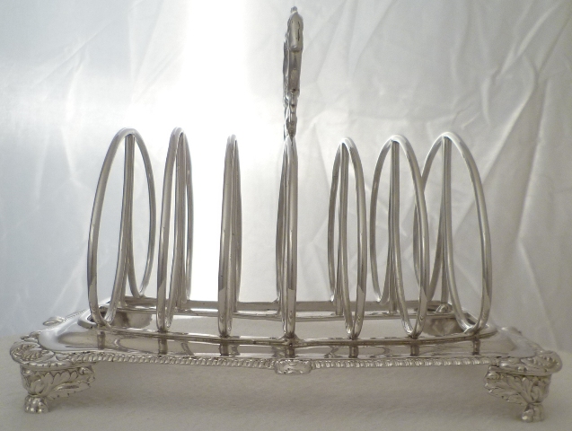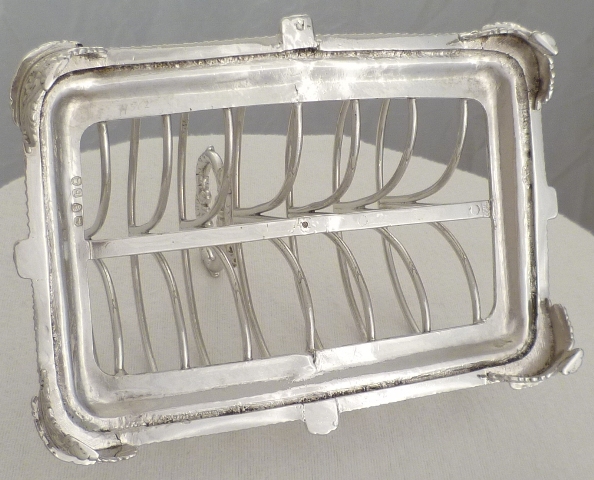 DESCRIPTION | Massive Georgian silver 7-bar toast rack with gadroon and shell decoration, a crested handle and later rhodium plating. Rhodium is a very precious metal of a bright silver colour that will not tarnish. The process was available during the 1960s and 1970s for larger items such as this toast rack but was extremely expensive. Today I think it is only small items such as rings that are rhodium plated as anything else would cost too much. Personally I find the colour a bit too bright but can appreciate the benefits of plating an item for food use and it will never need polishing. |