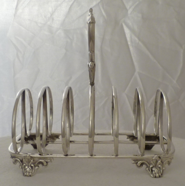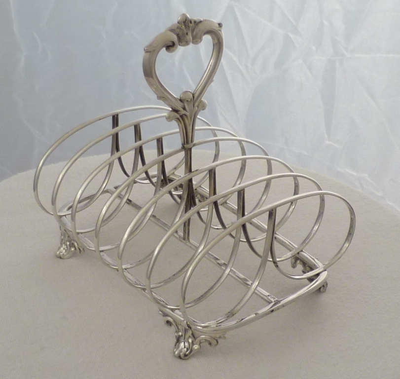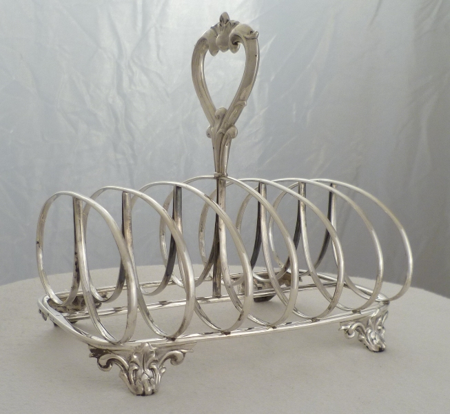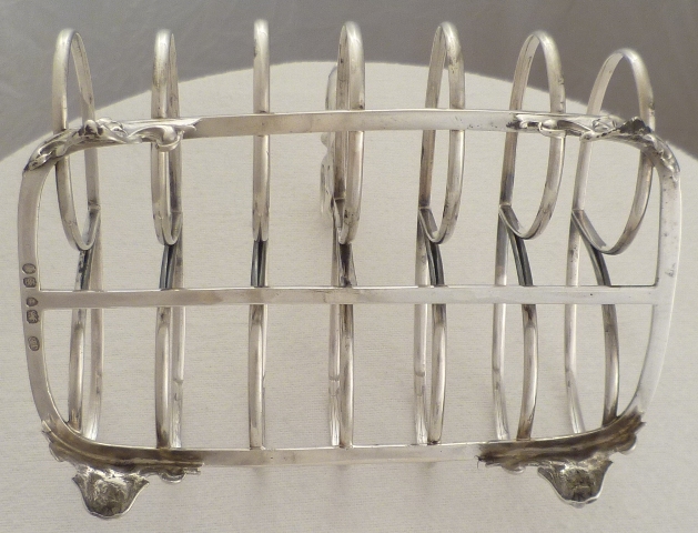 DESCRIPTION | Larger Victorian silver 7-bar toast rack with ring loop dividers, bracket feet and a tiny crest engraving to the central base bar. |