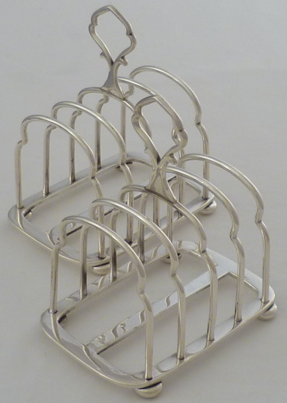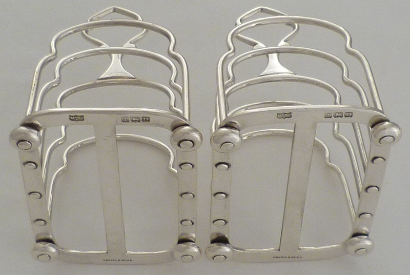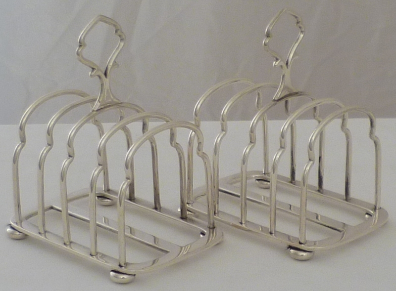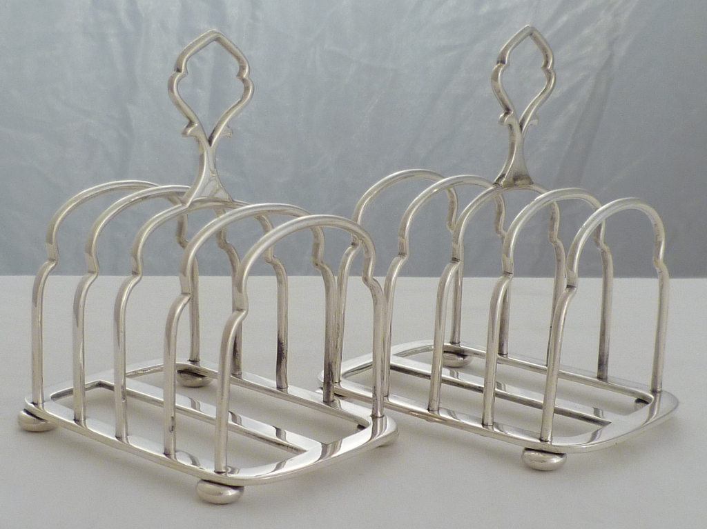 DESCRIPTION | Pair of useful silver 5-bar toast racks with the bars humorously shaped as slices of bread. |