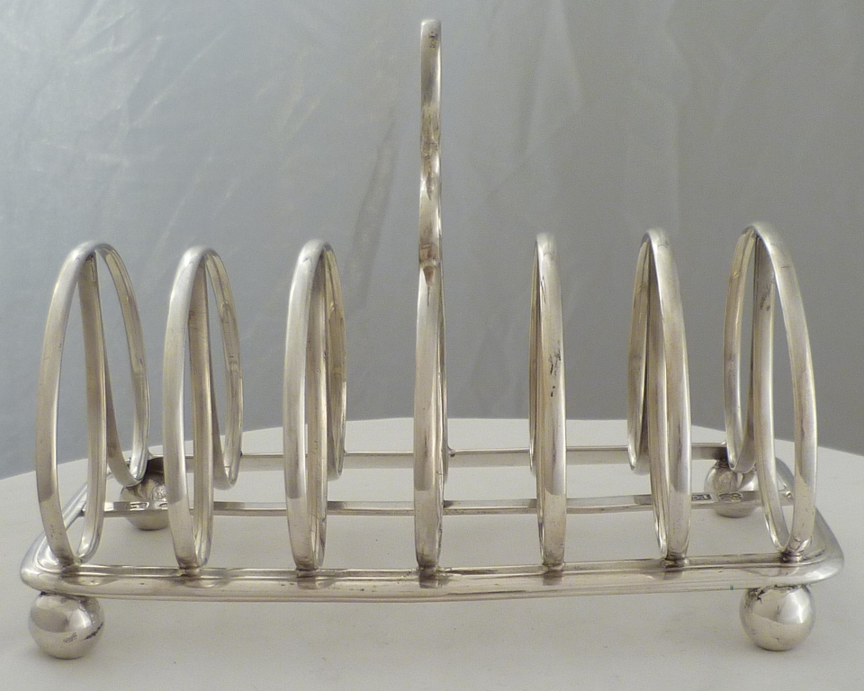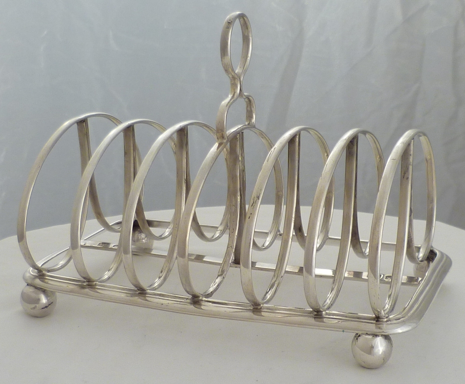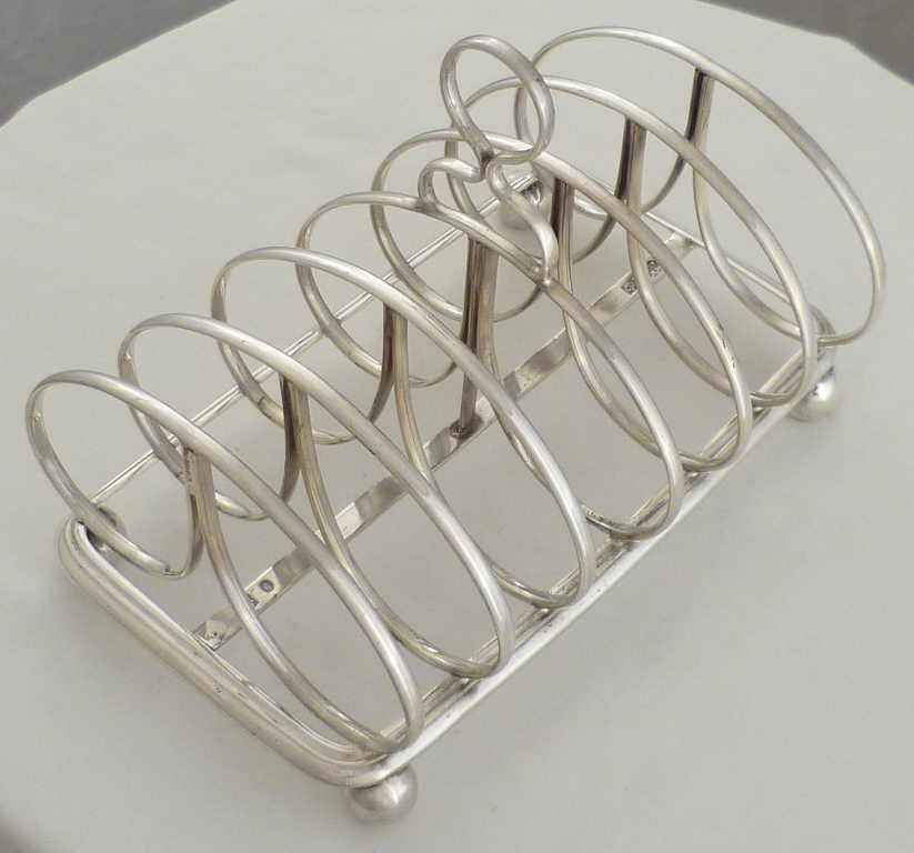 DESCRIPTION | Large William IV silver 7-bar toast rack with a ring handle and ball feet. |