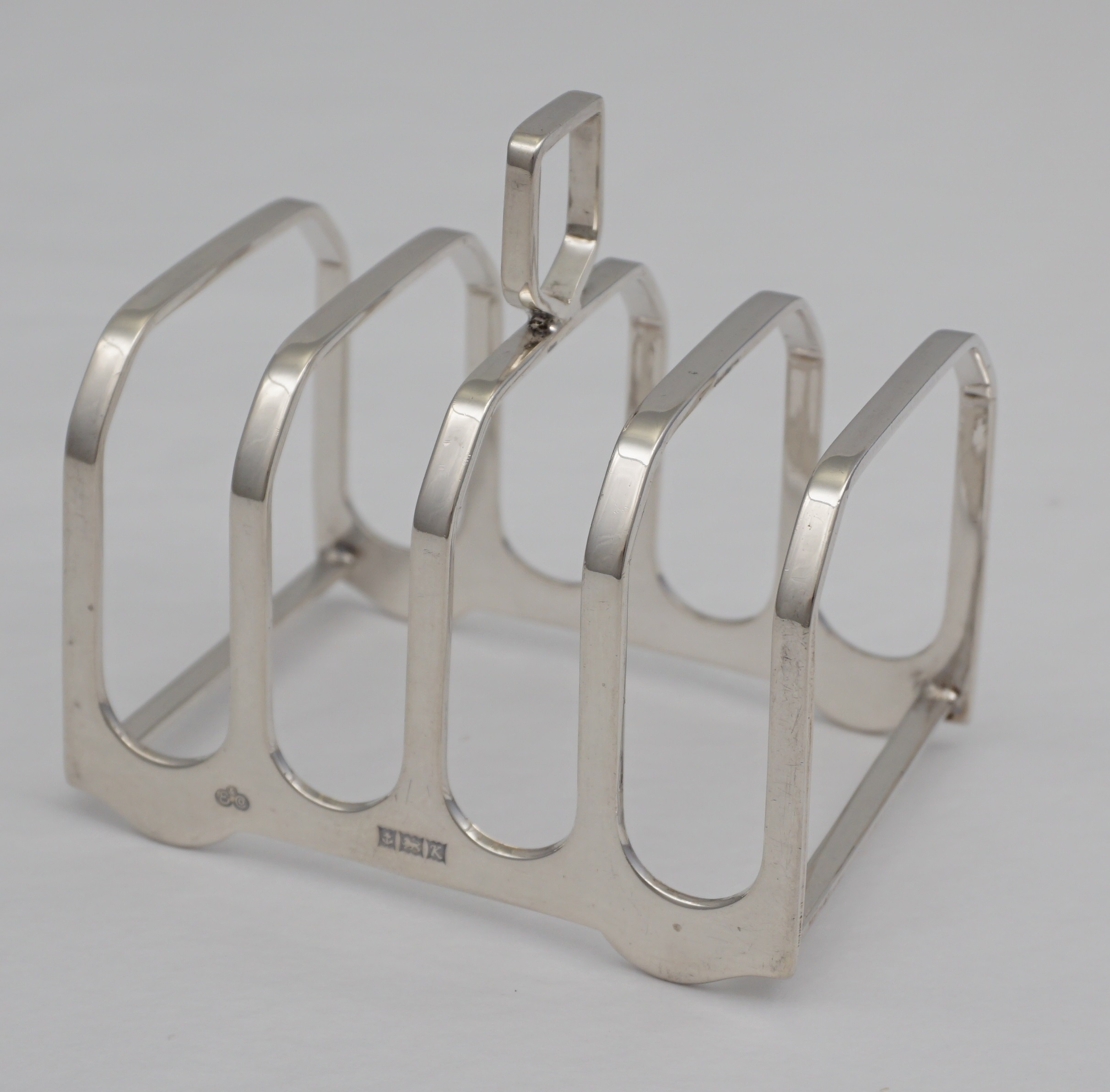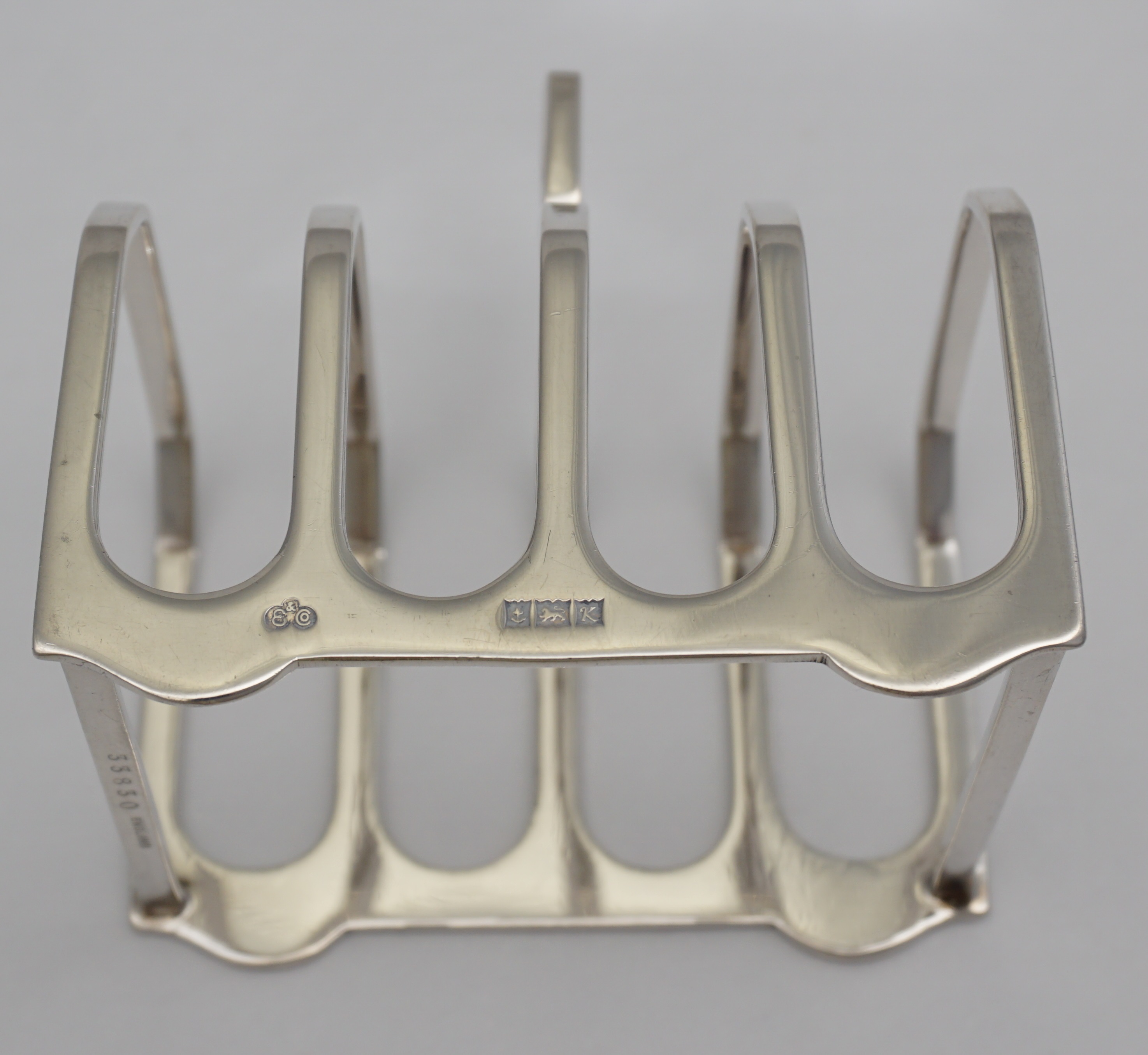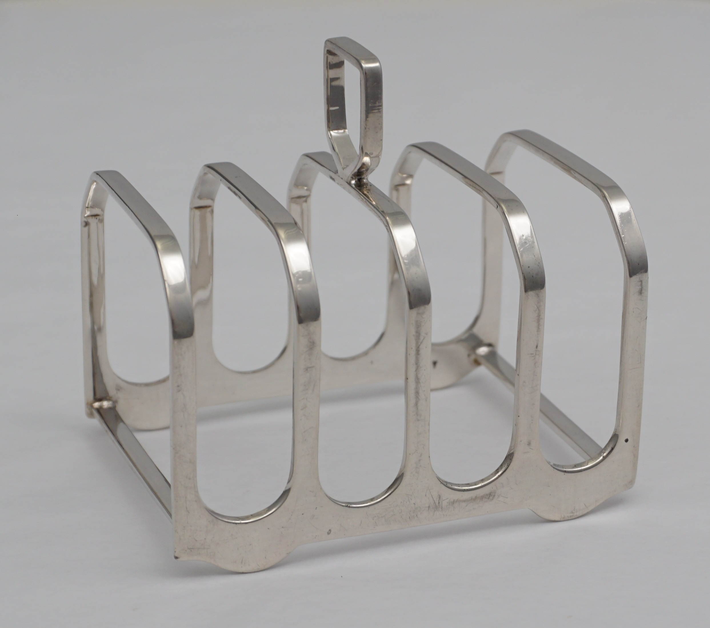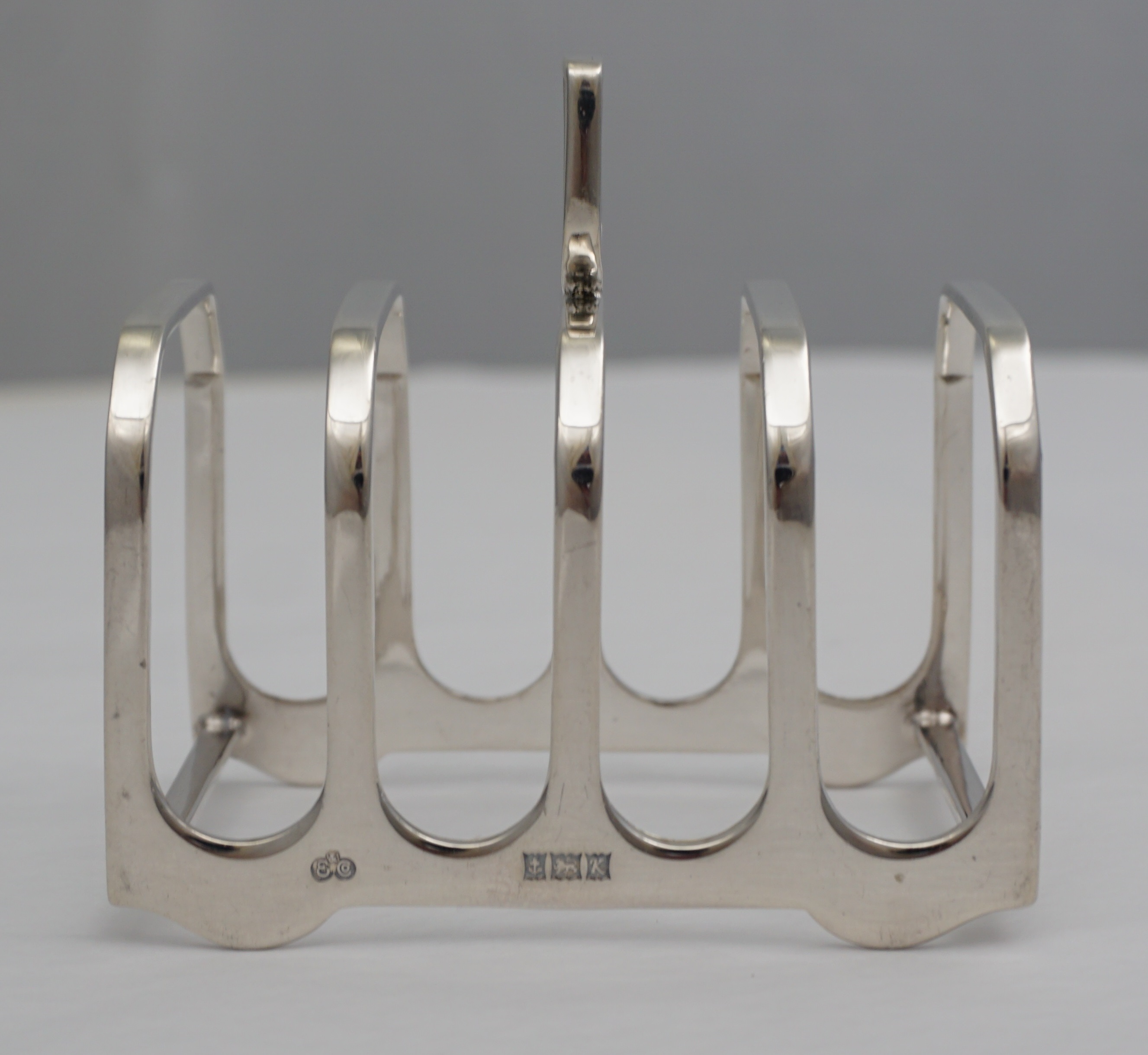 DESCRIPTION | Vintage English solid sterling silver 5-bar toast rack. Smaller toasts racks are often constructed from quite thin metal to keep down the cost but these are not, the silver here is pleasingly thick and robust. |