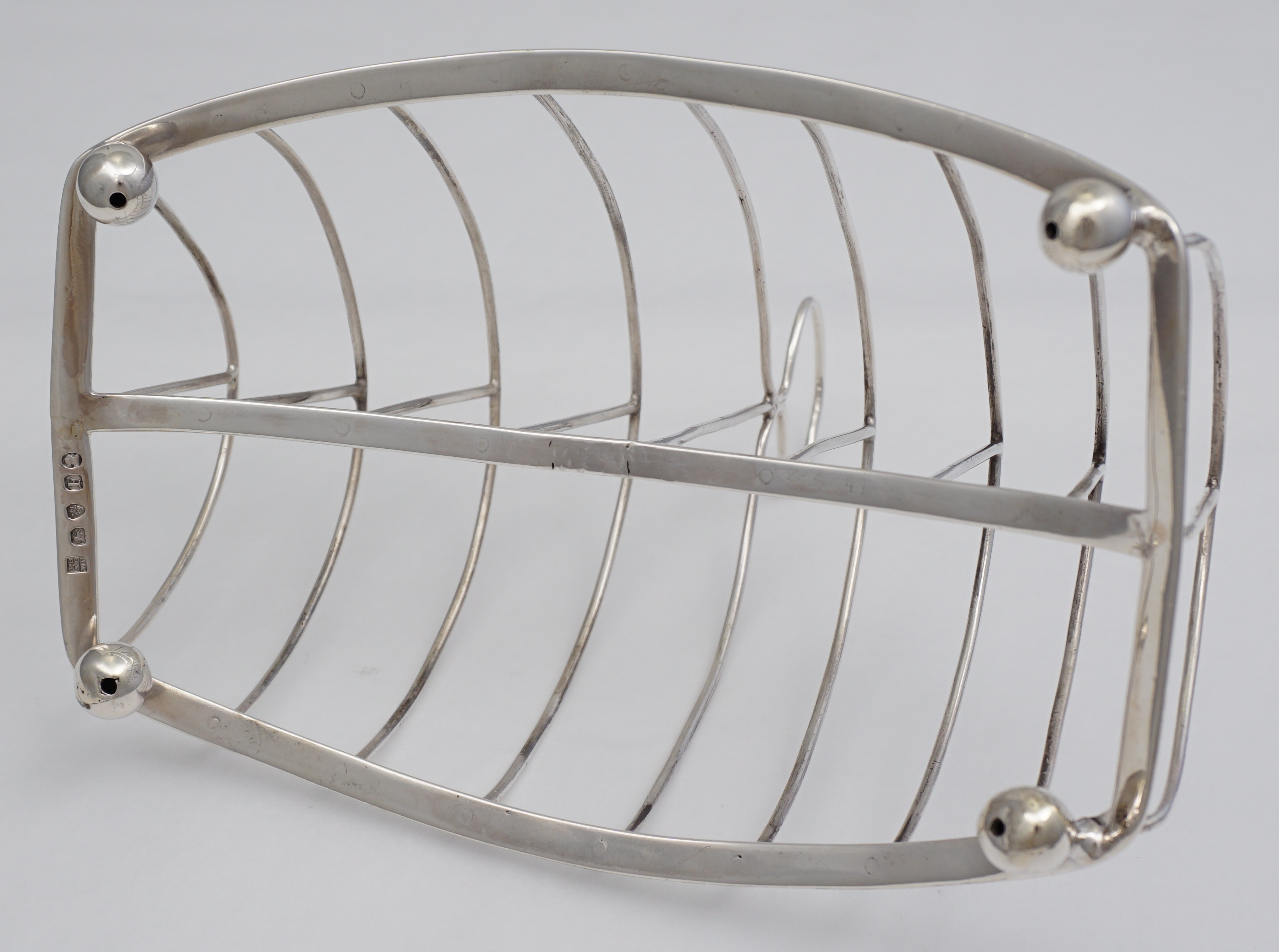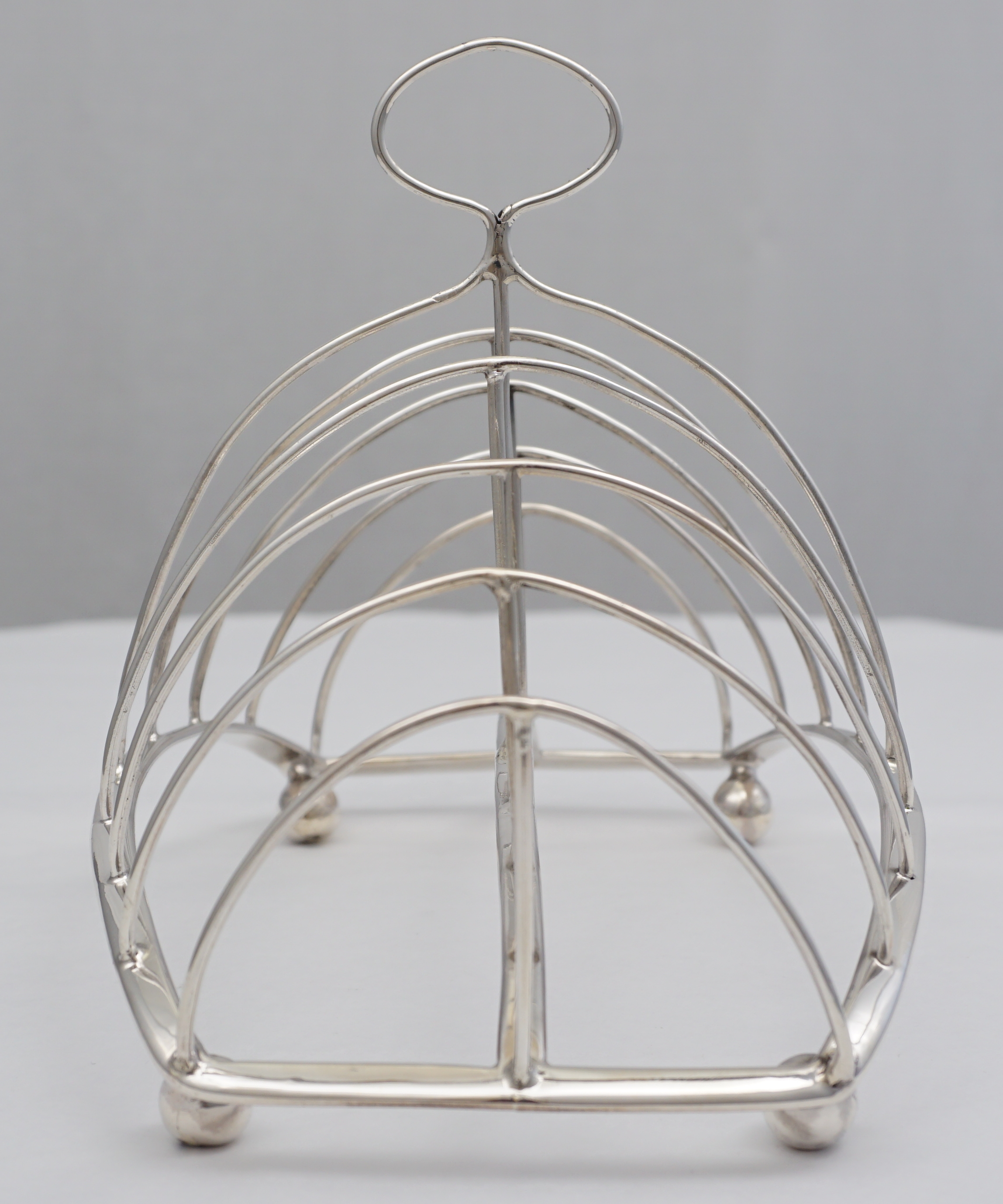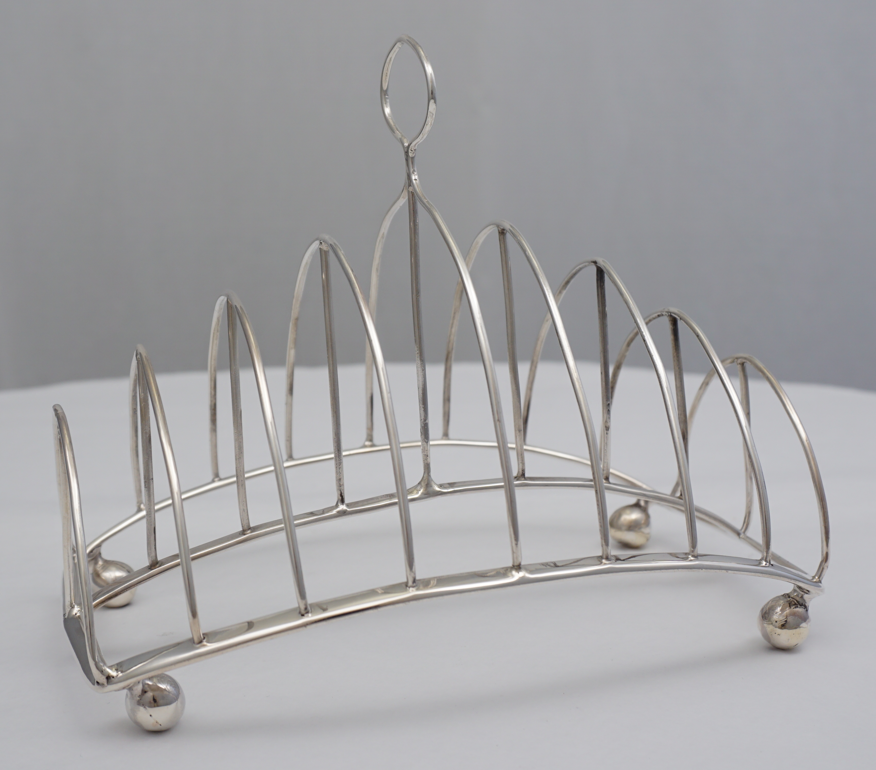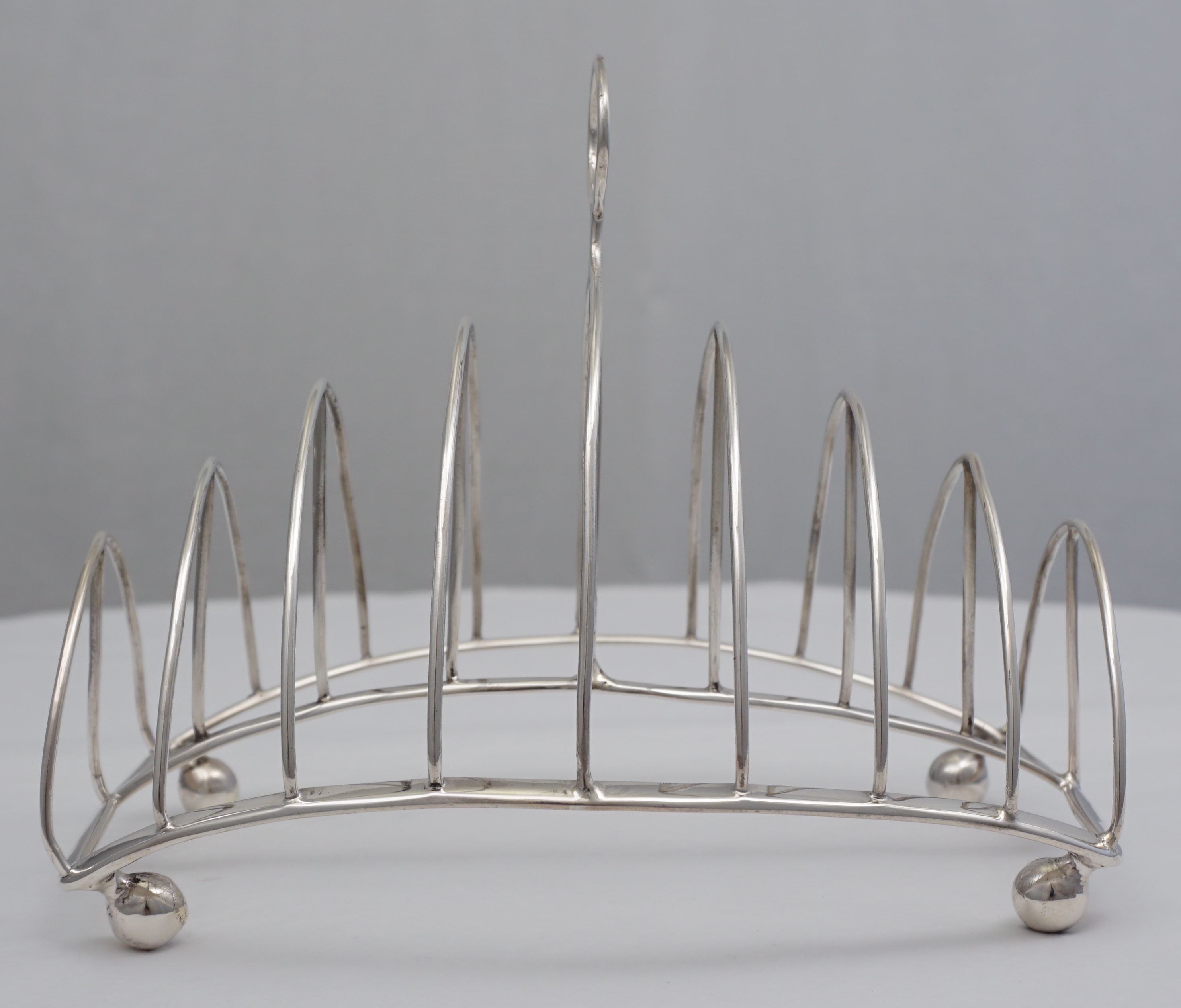 DESCRIPTION | Extremely unusual, perhaps unique, large antique English Georgian solid sterling silver 9-bar toast rack with a curved and bowed base. |