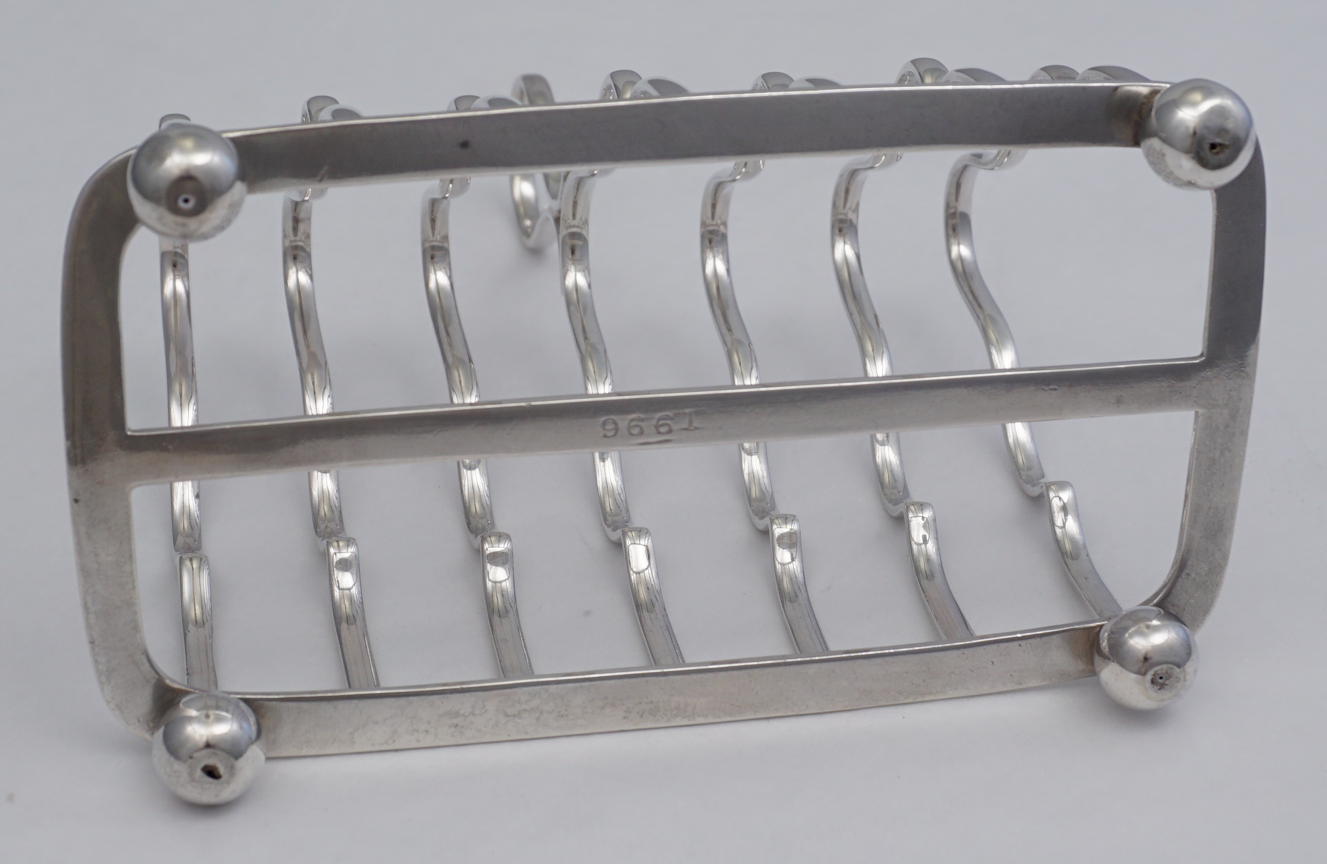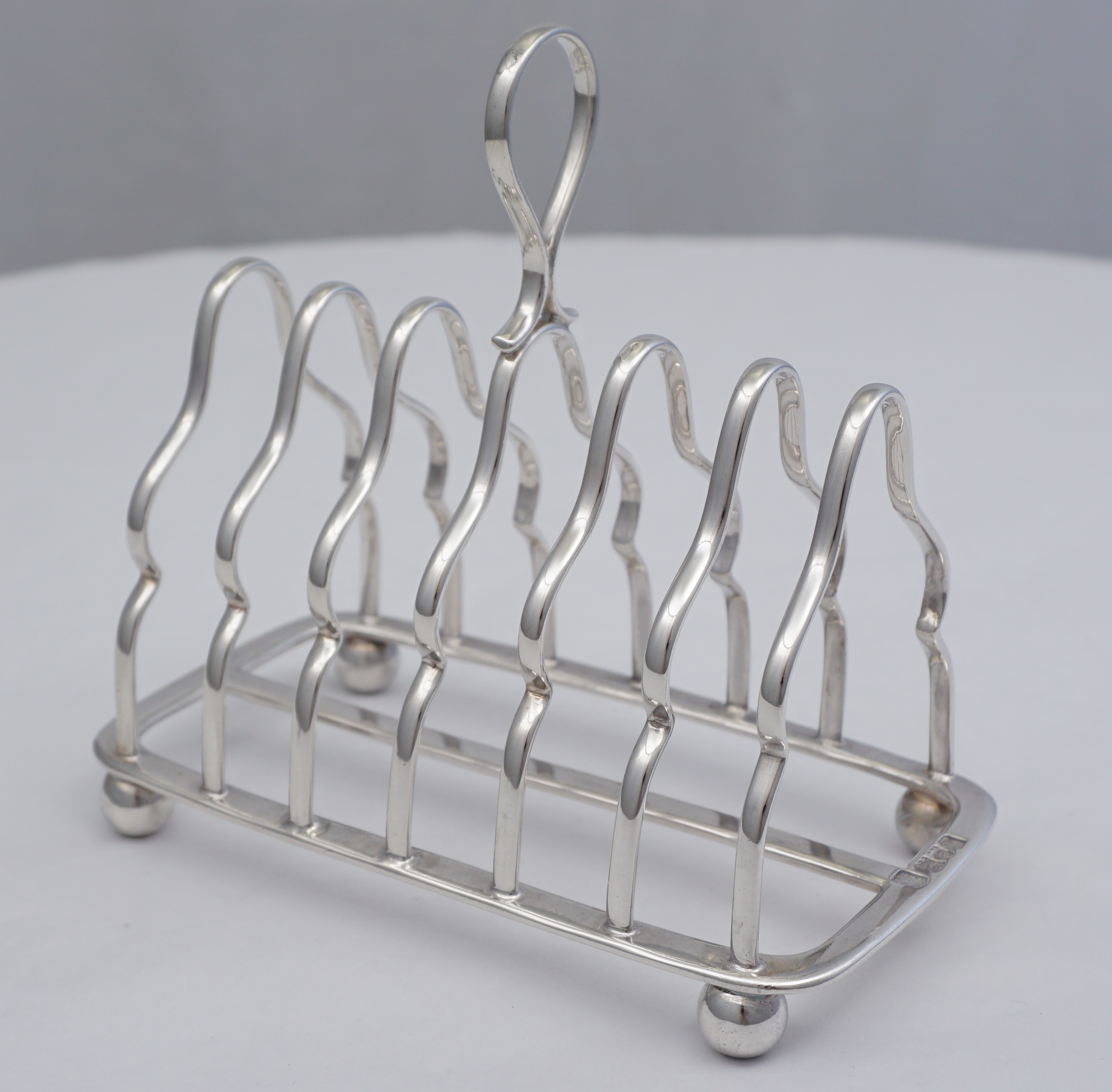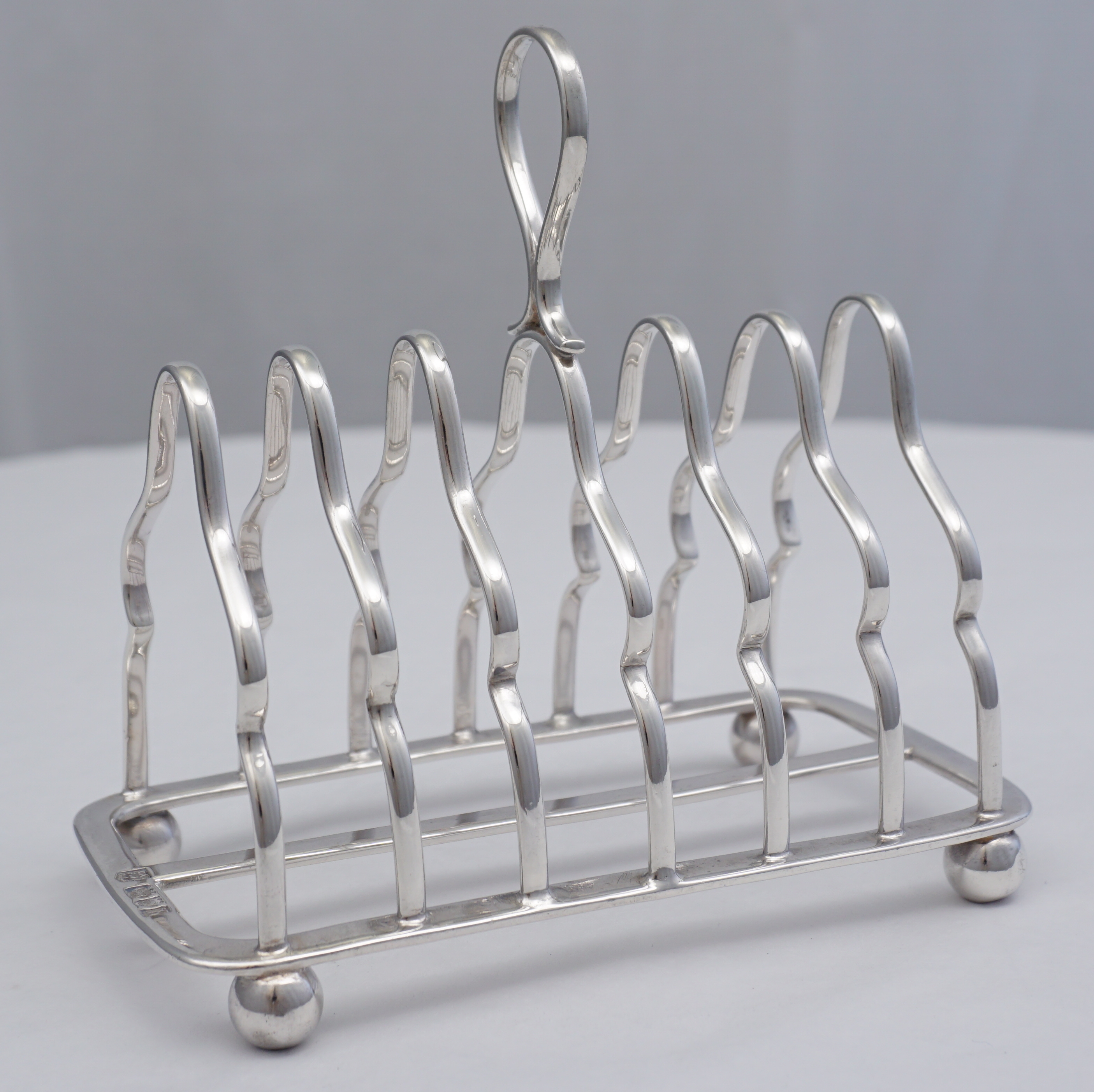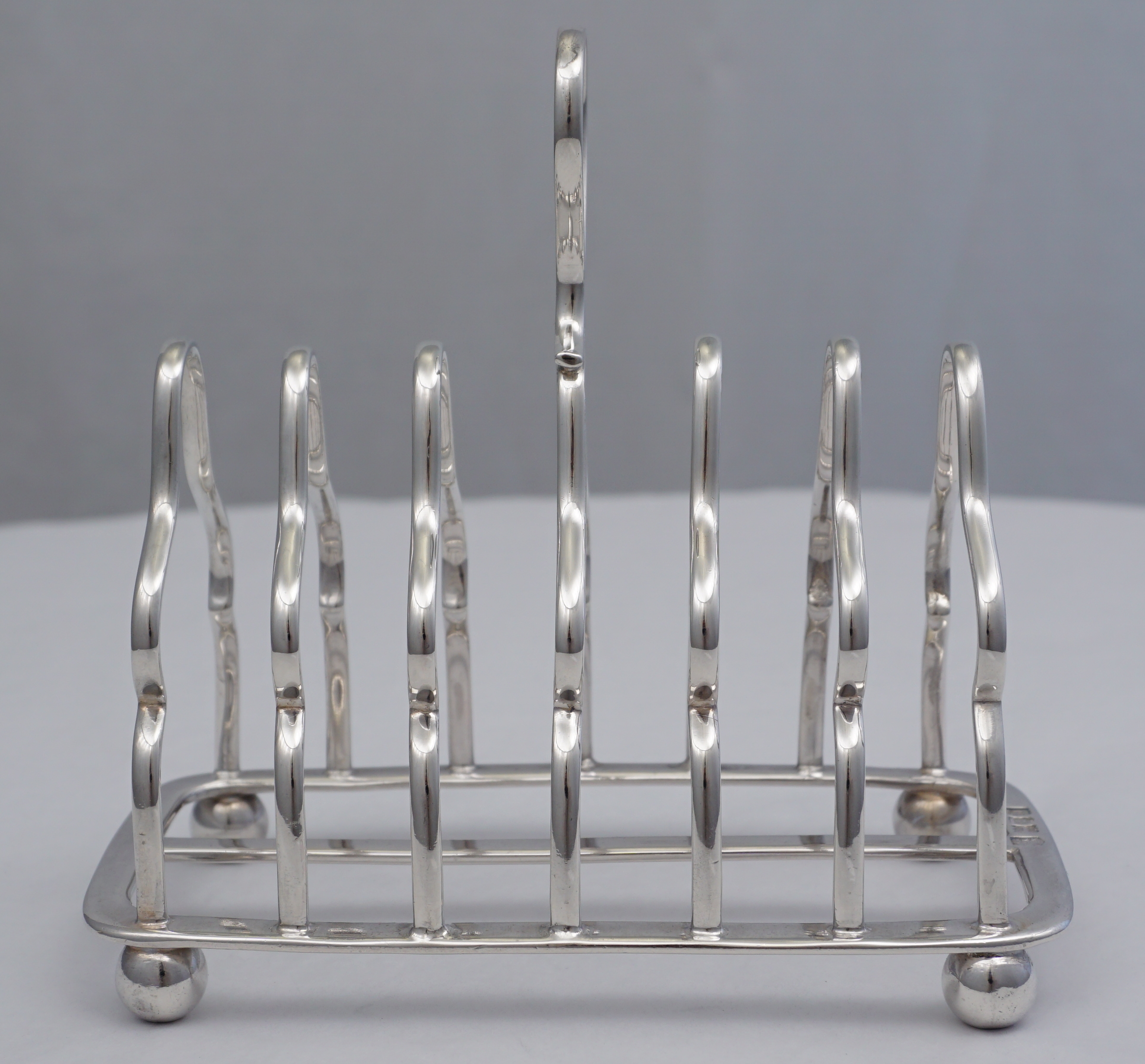 DESCRIPTION | High quality antique English Edwardian solid sterling silver 7-bar toast rack with shaped arches and ball feet. |