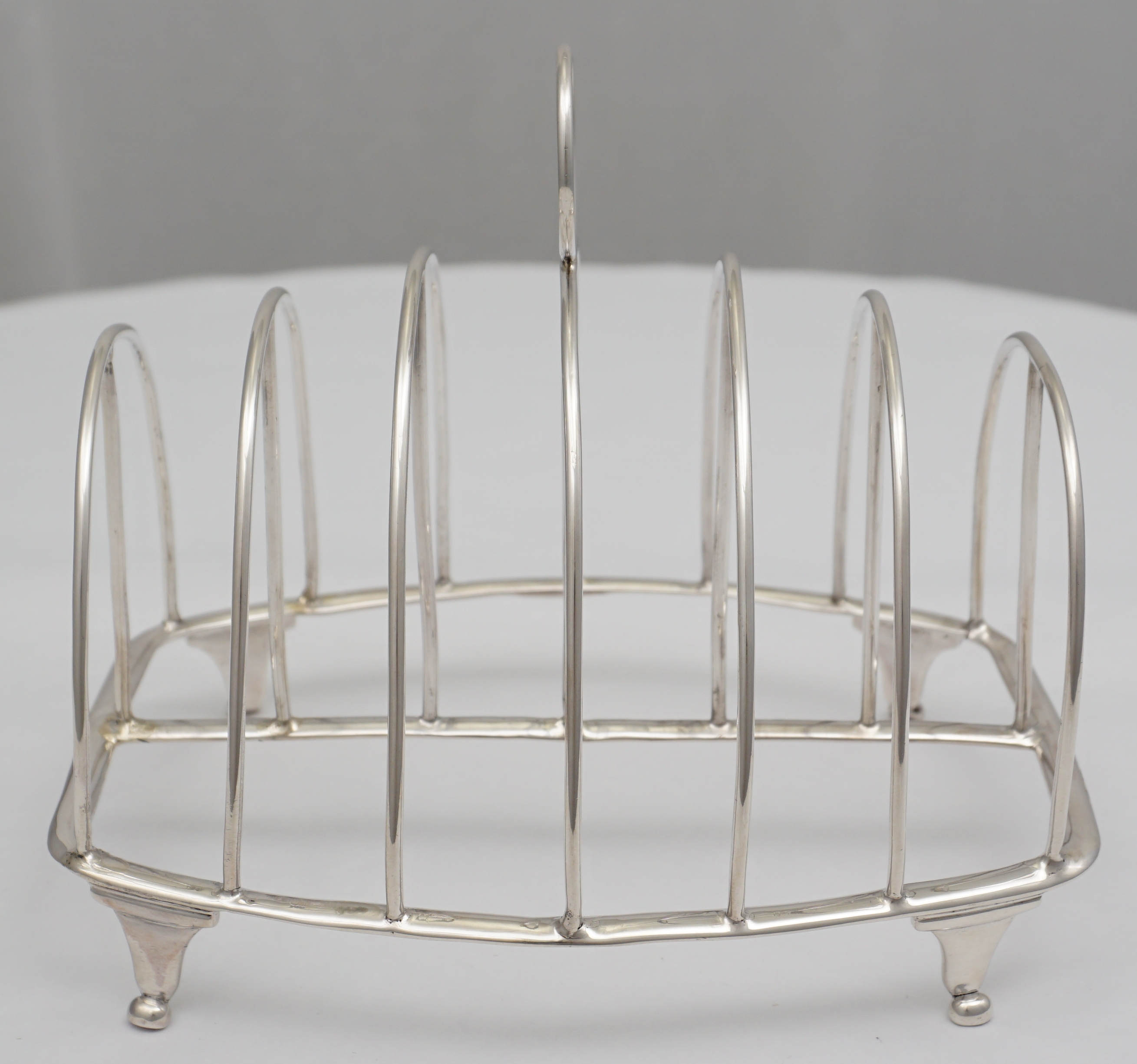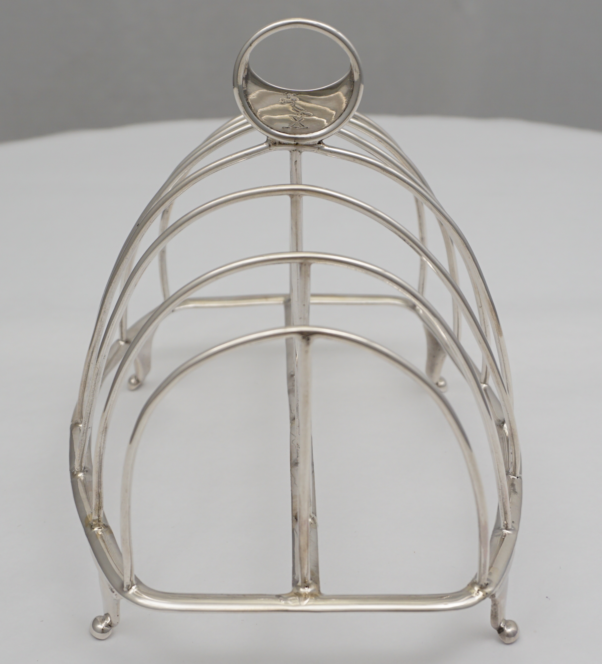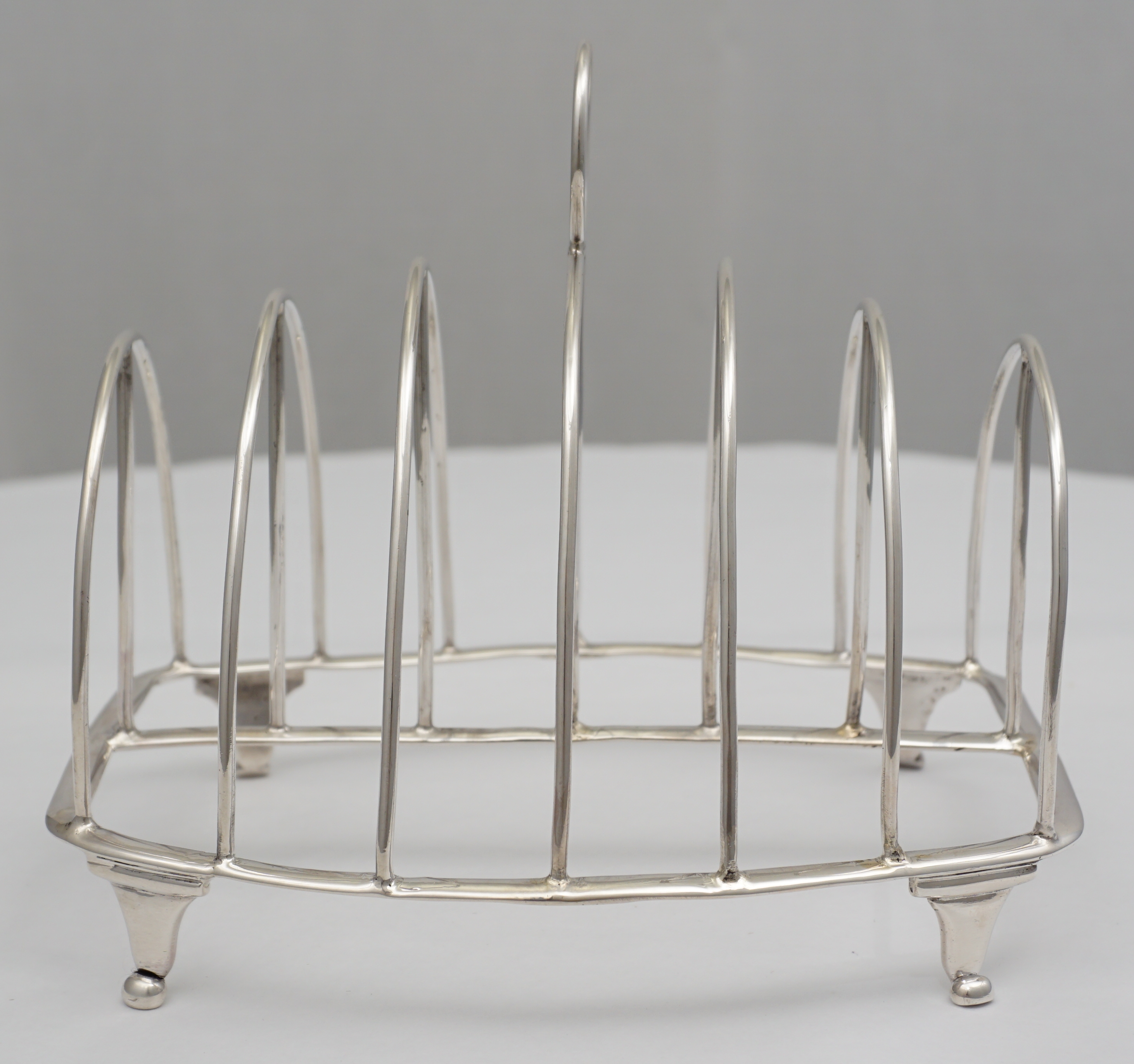 DESCRIPTION | Large antique English Georgian solid sterling silver 7-bar toast rack with a discreet crest engraving to the half moon carrying handle. |