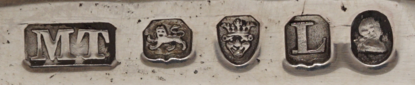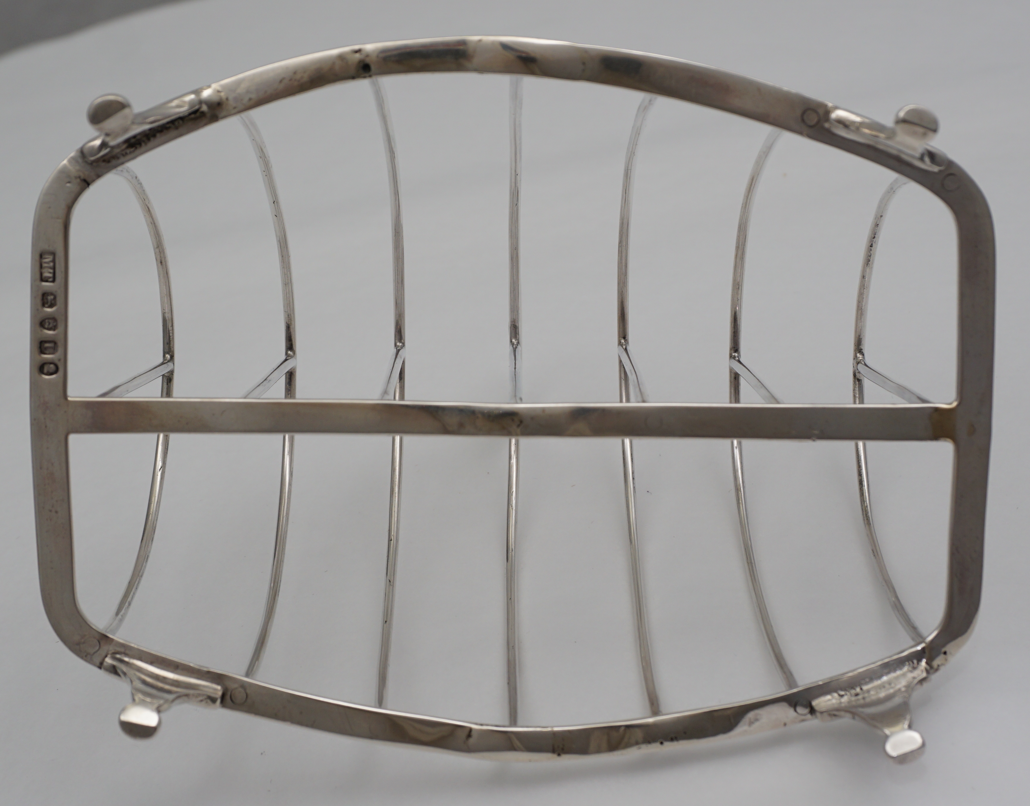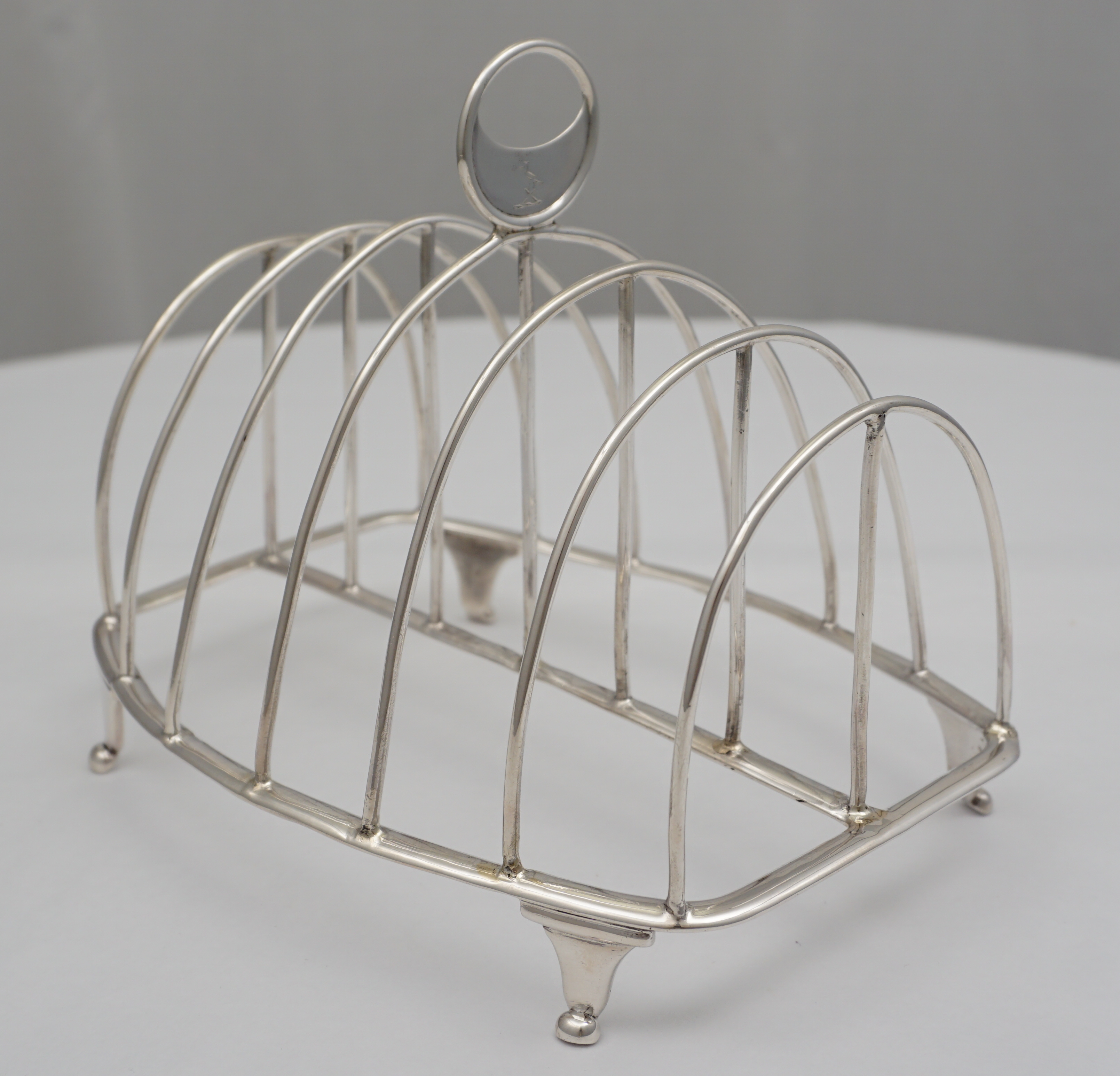 DESCRIPTION | Large antique English Georgian solid sterling silver 7-bar toast rack with a discreet crest engraving to the half moon carrying handle. |