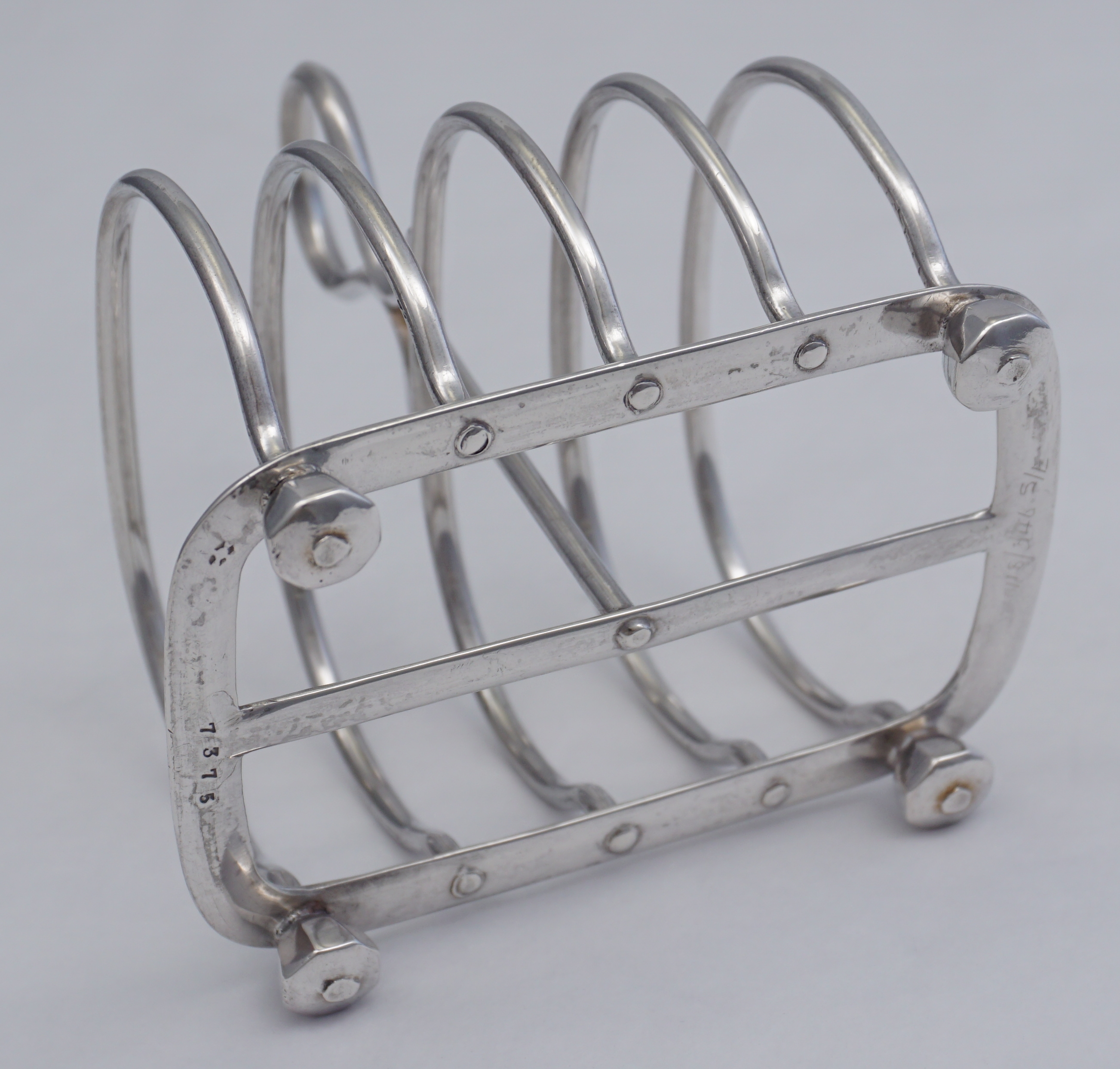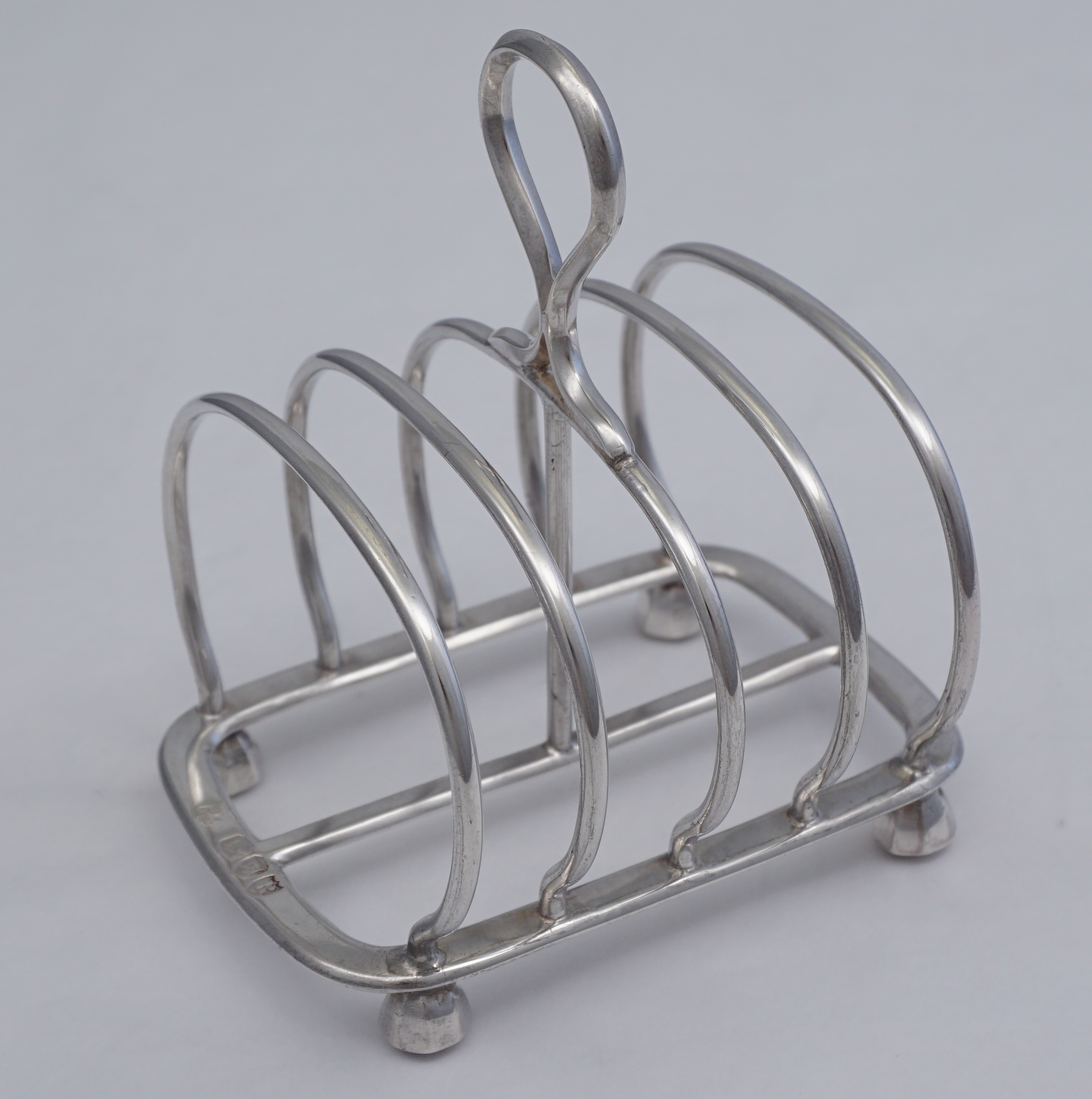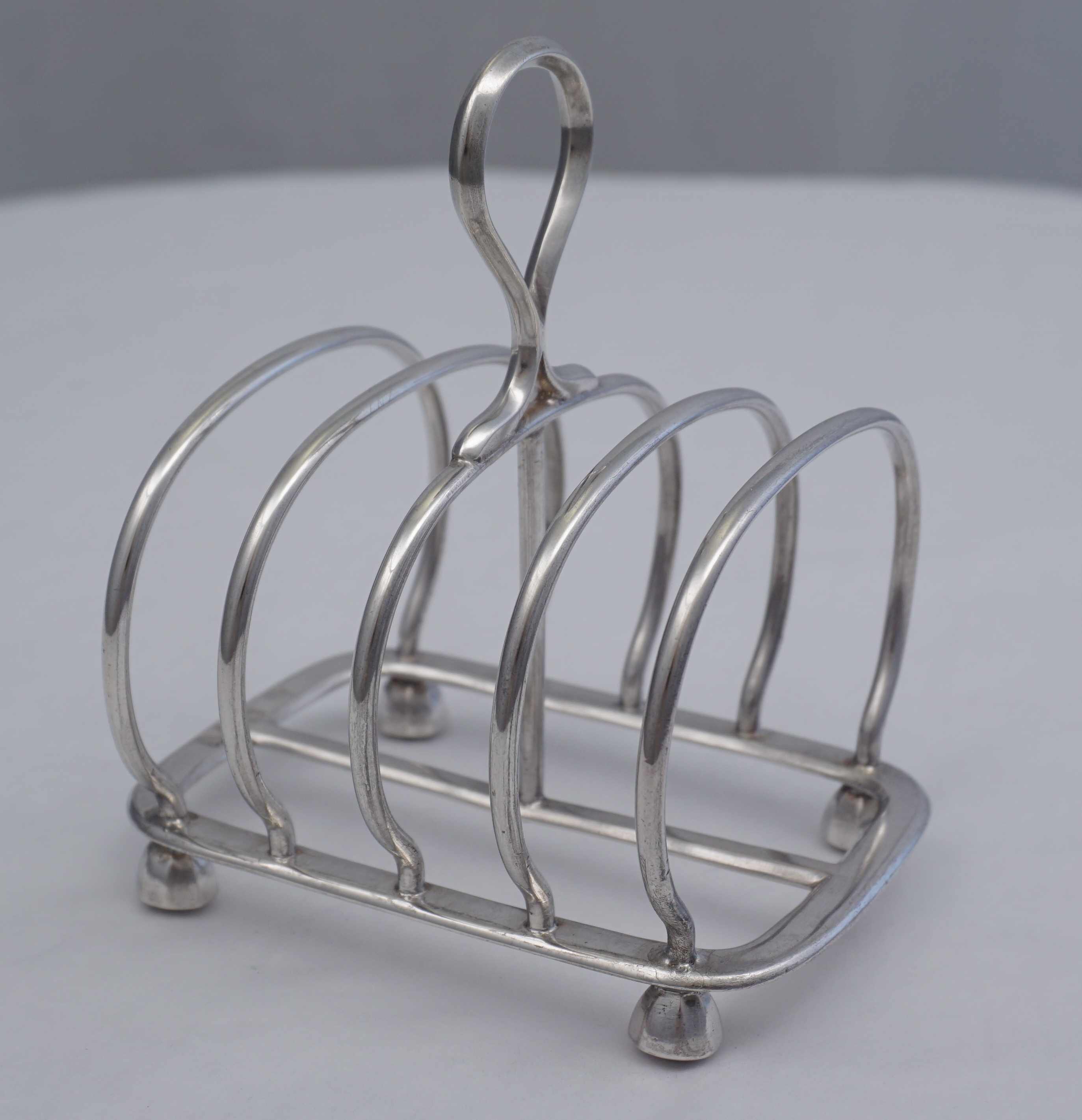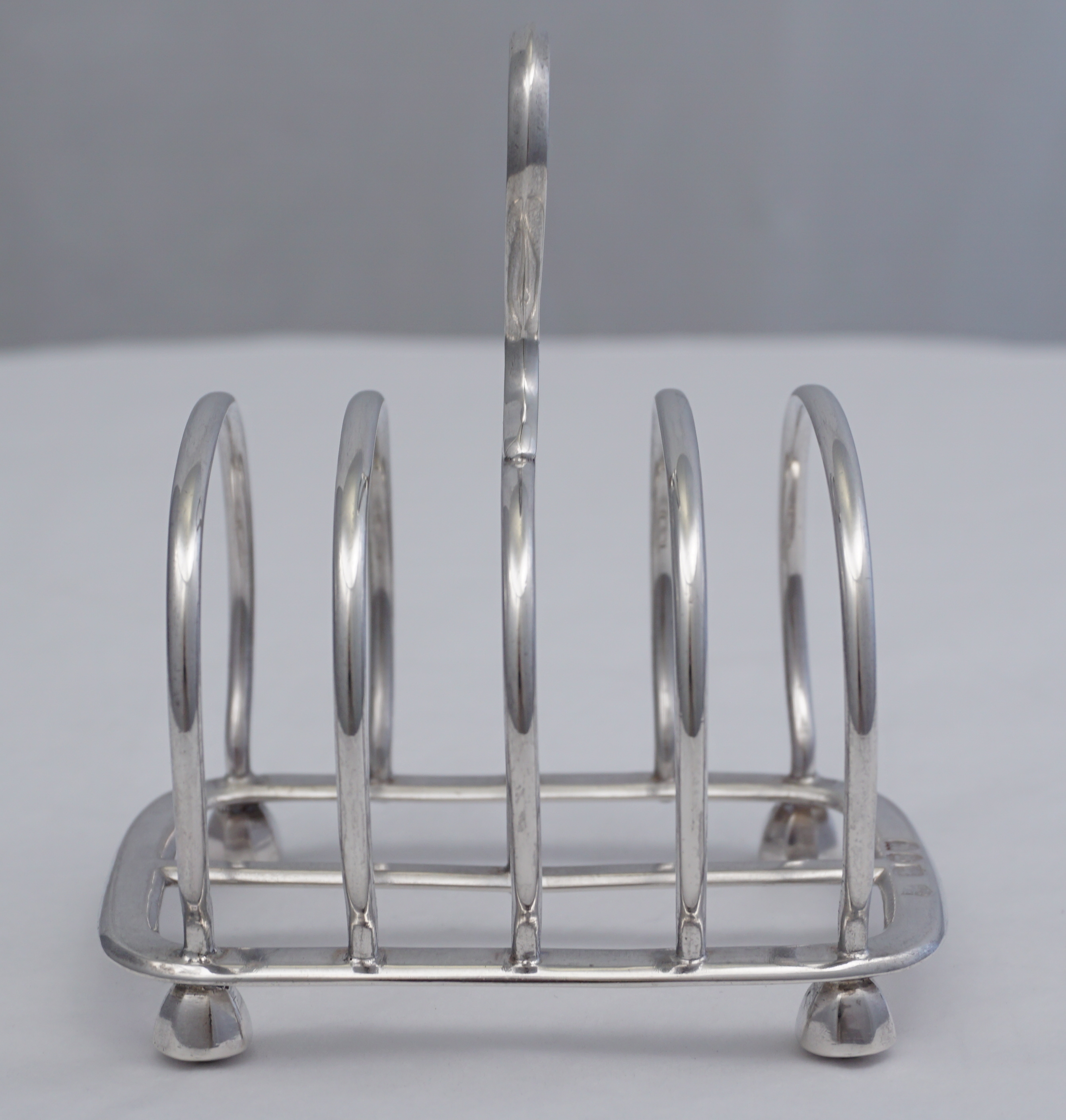 DESCRIPTION | Nice quality, sturdy and well built antique English Victorian solid sterling silver 5-bar toast rack with shaped feet and loop carrying handle. |