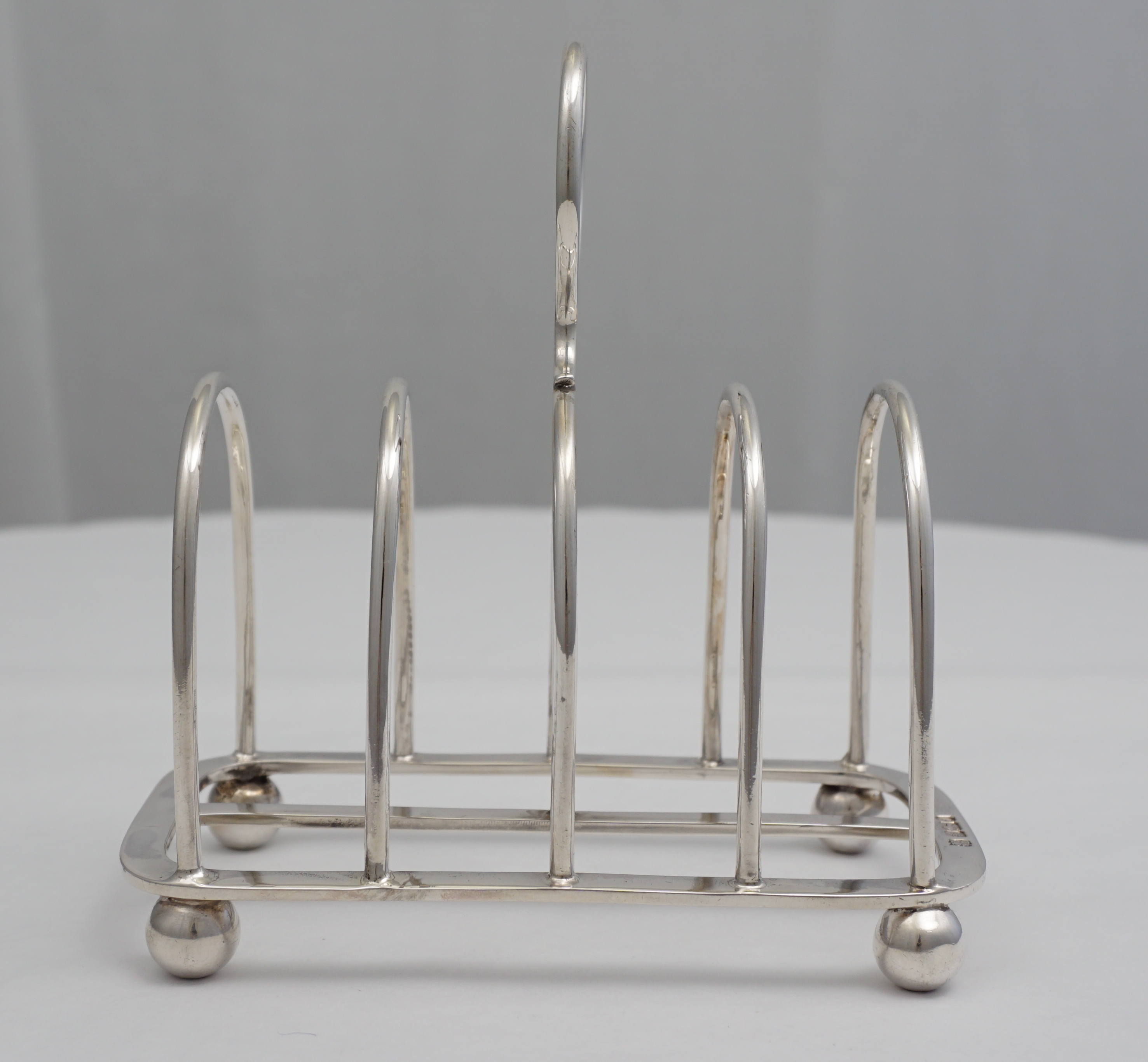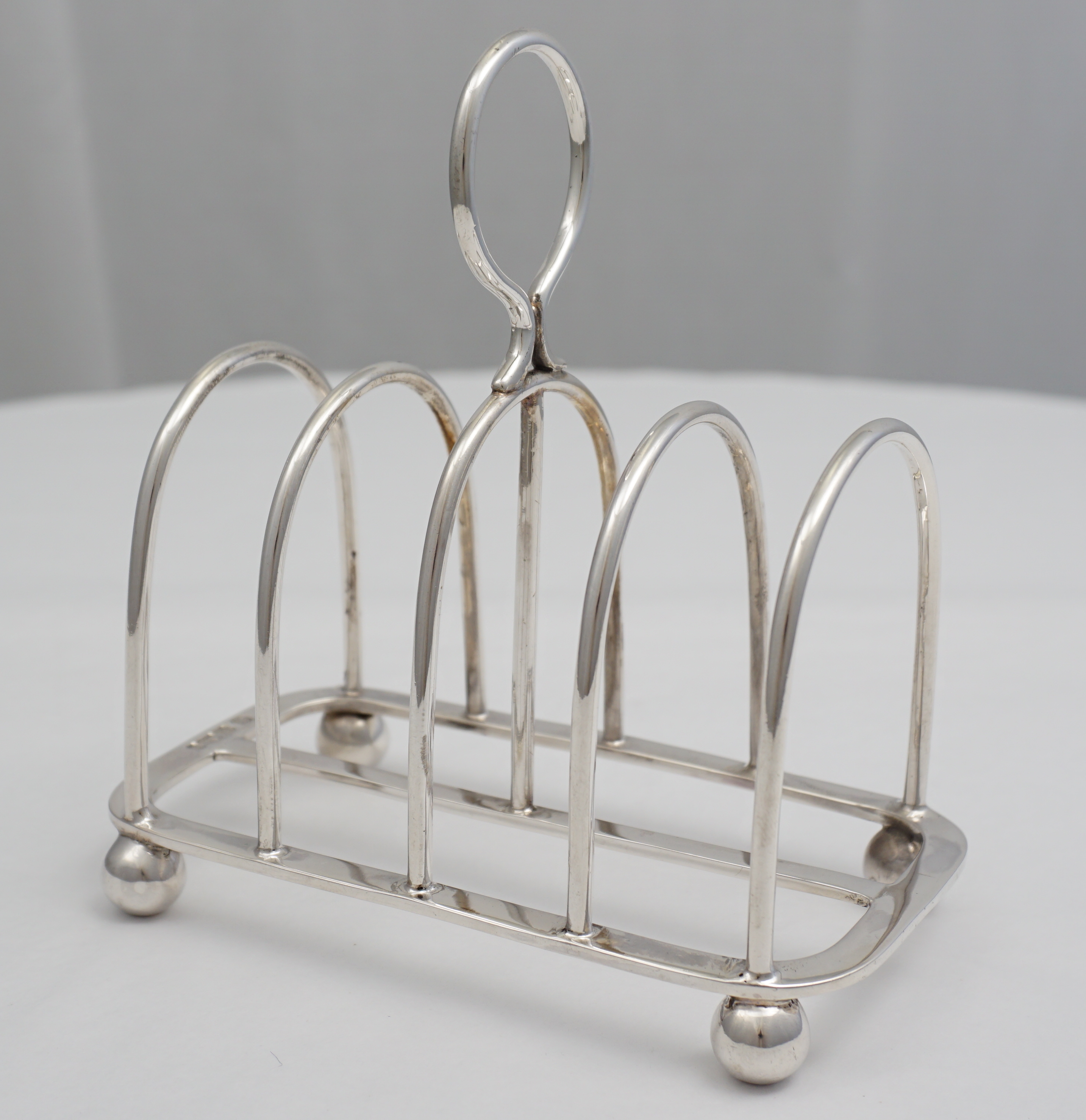 DESCRIPTION | Good quality English Edwardian solid sterling silver 5-bar toast rack on four ball feet and with central carrying handle. |