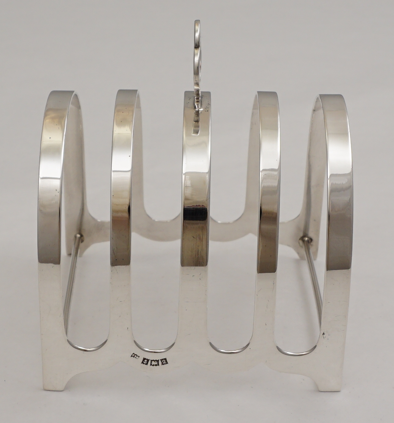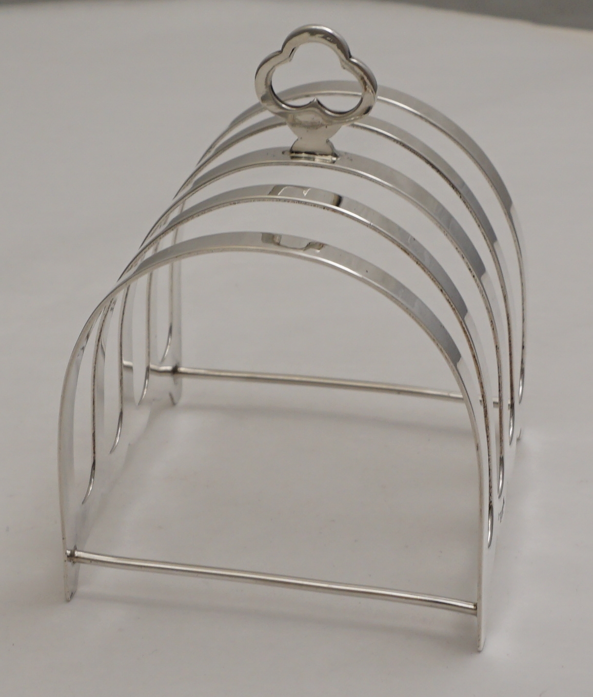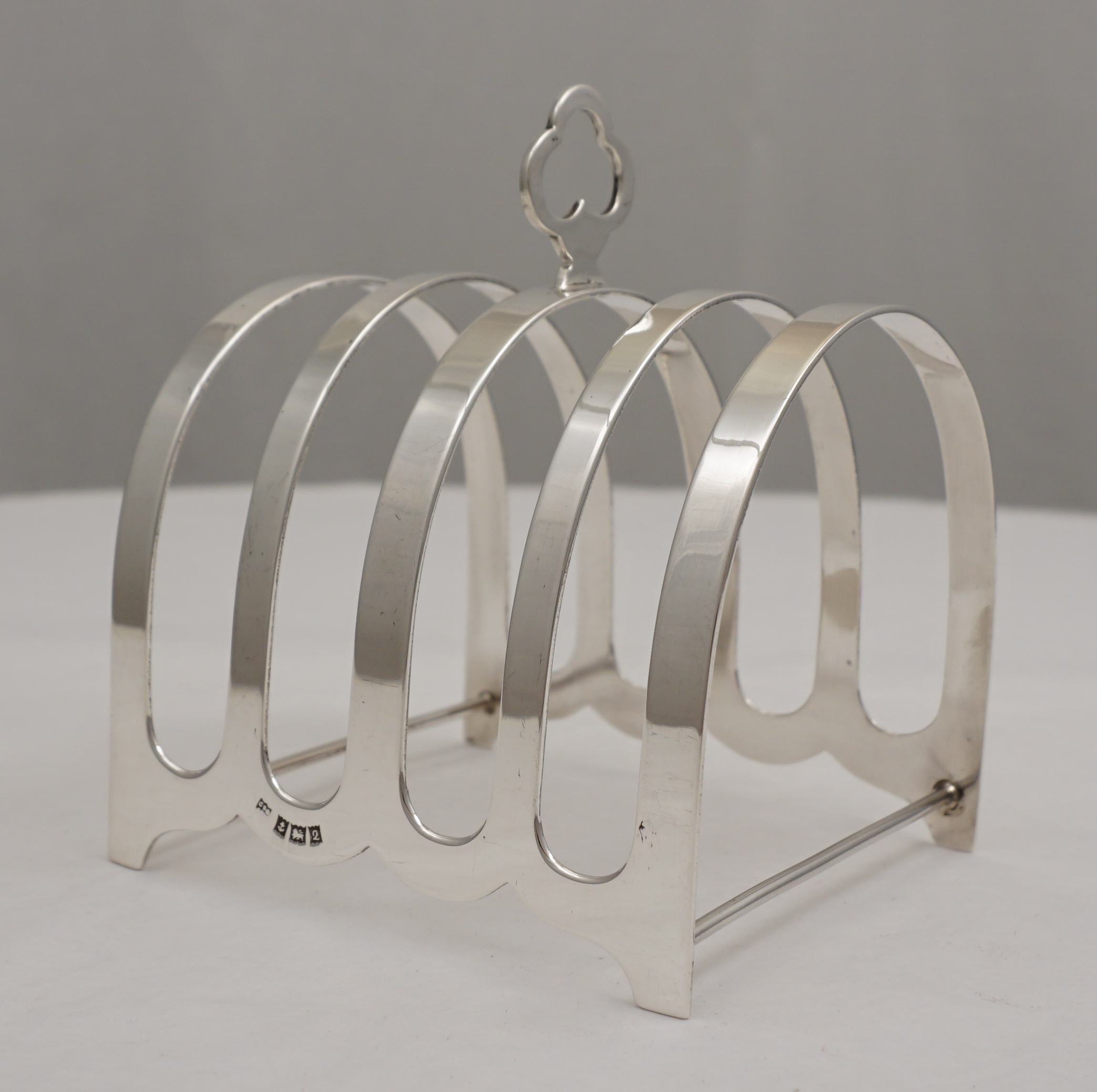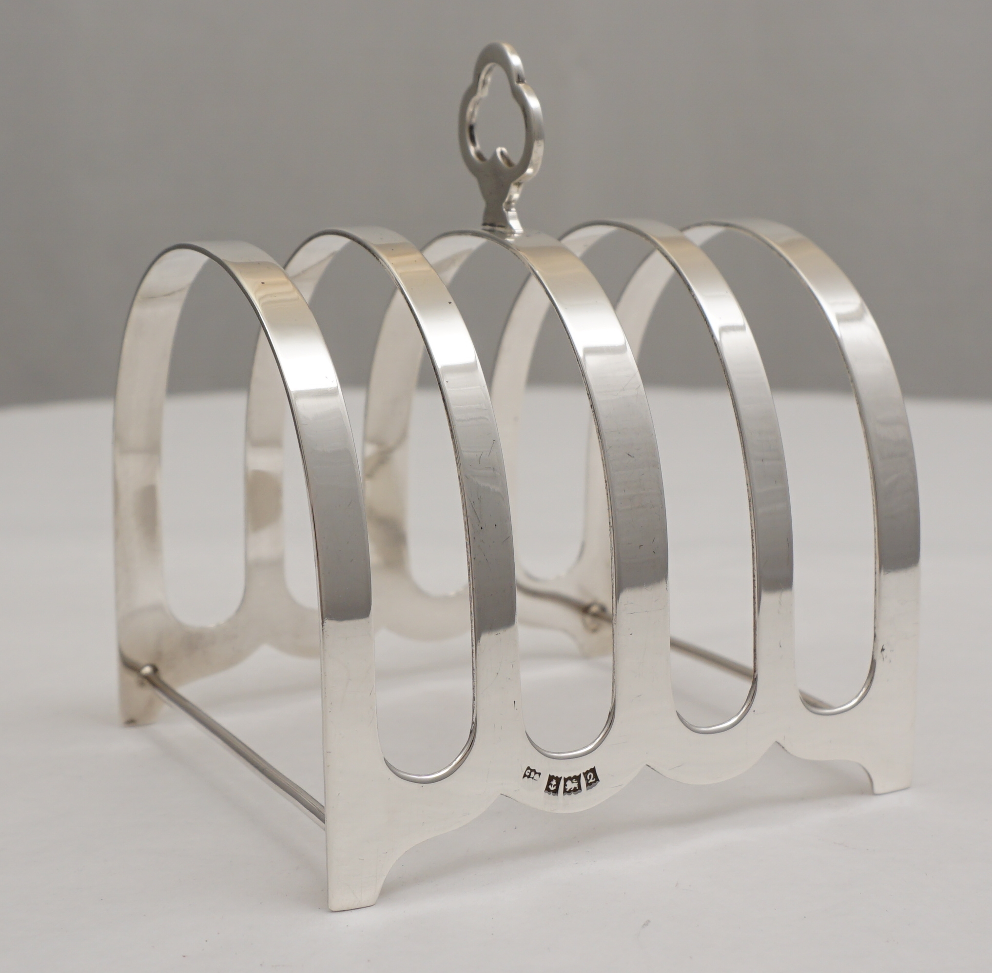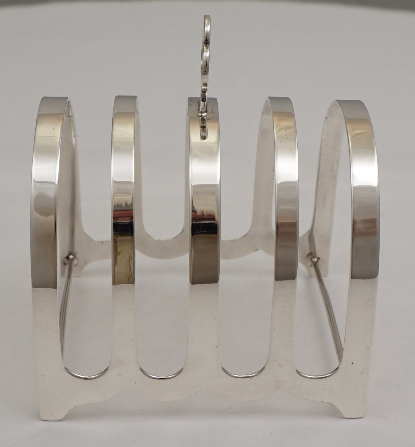 DESCRIPTION | Good and useful vintage English solid sterling silver 5-bar toast rack with central carrying handle. |