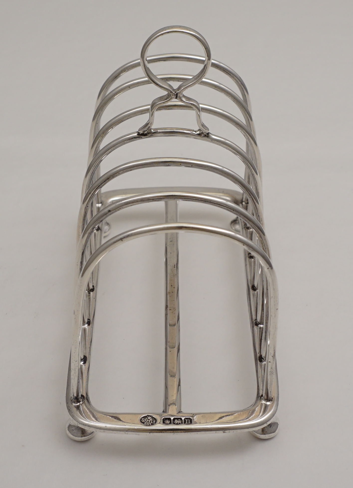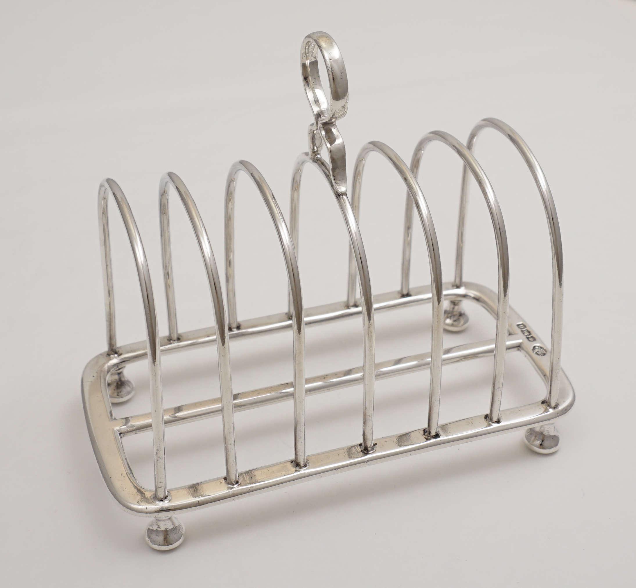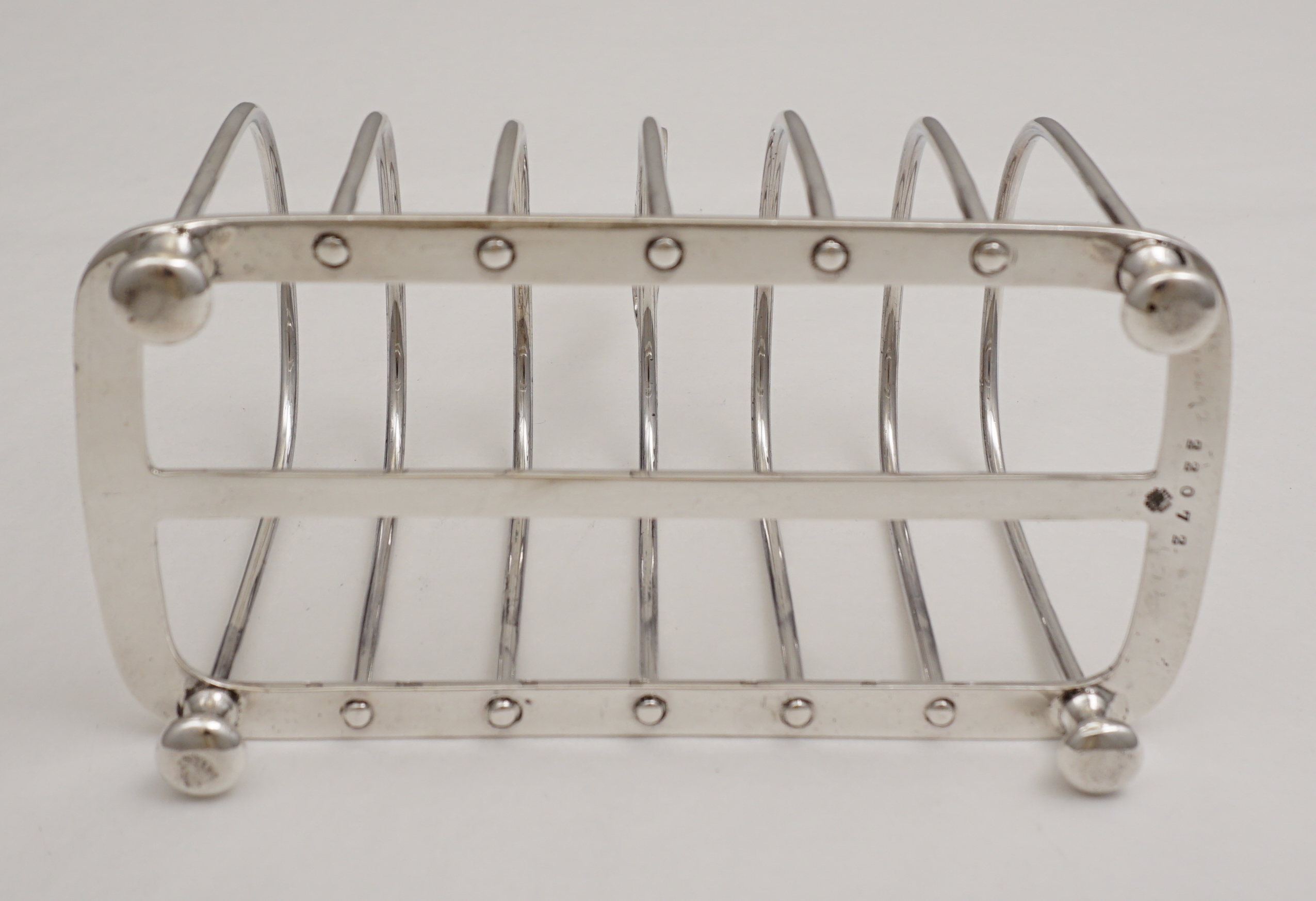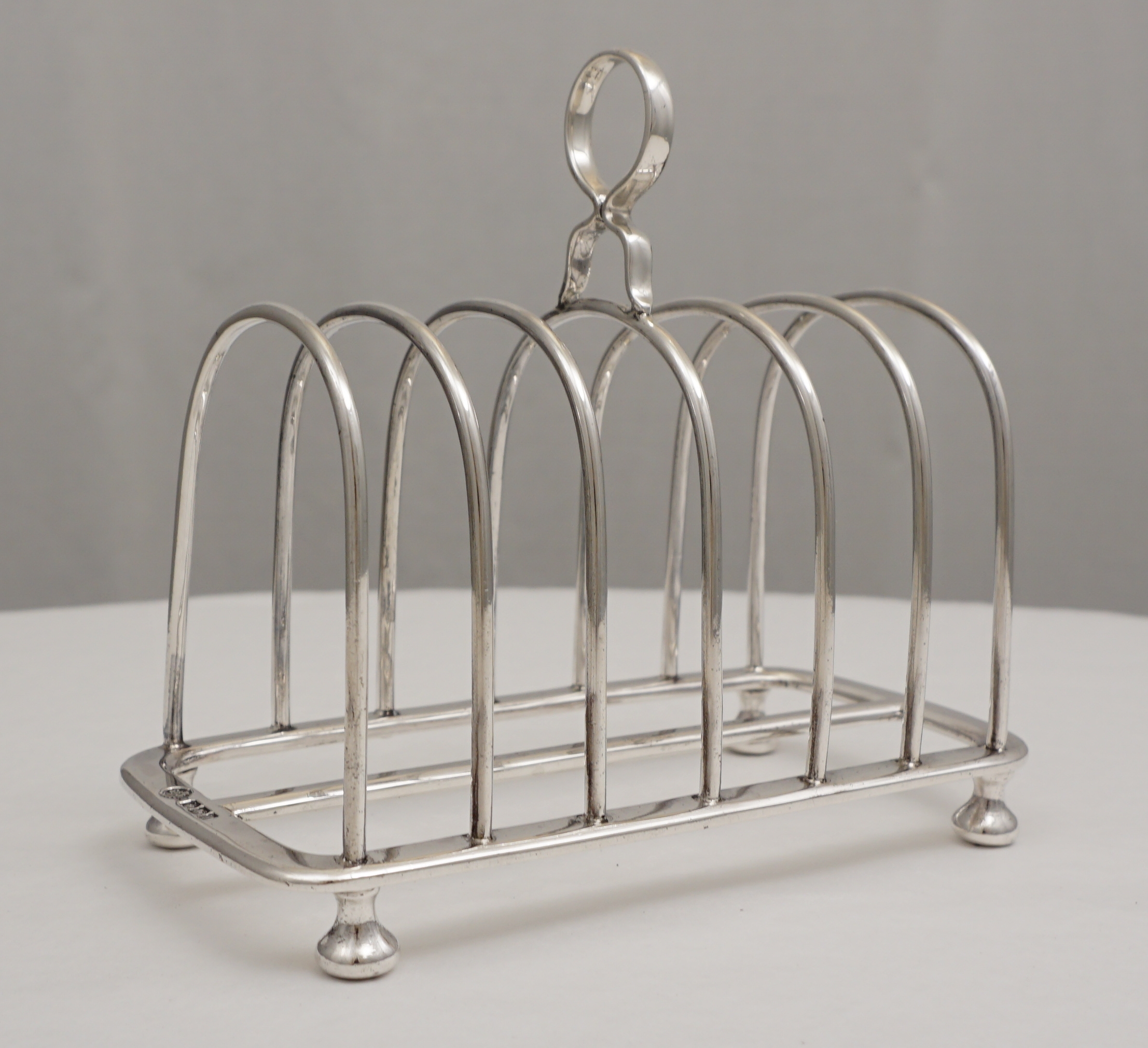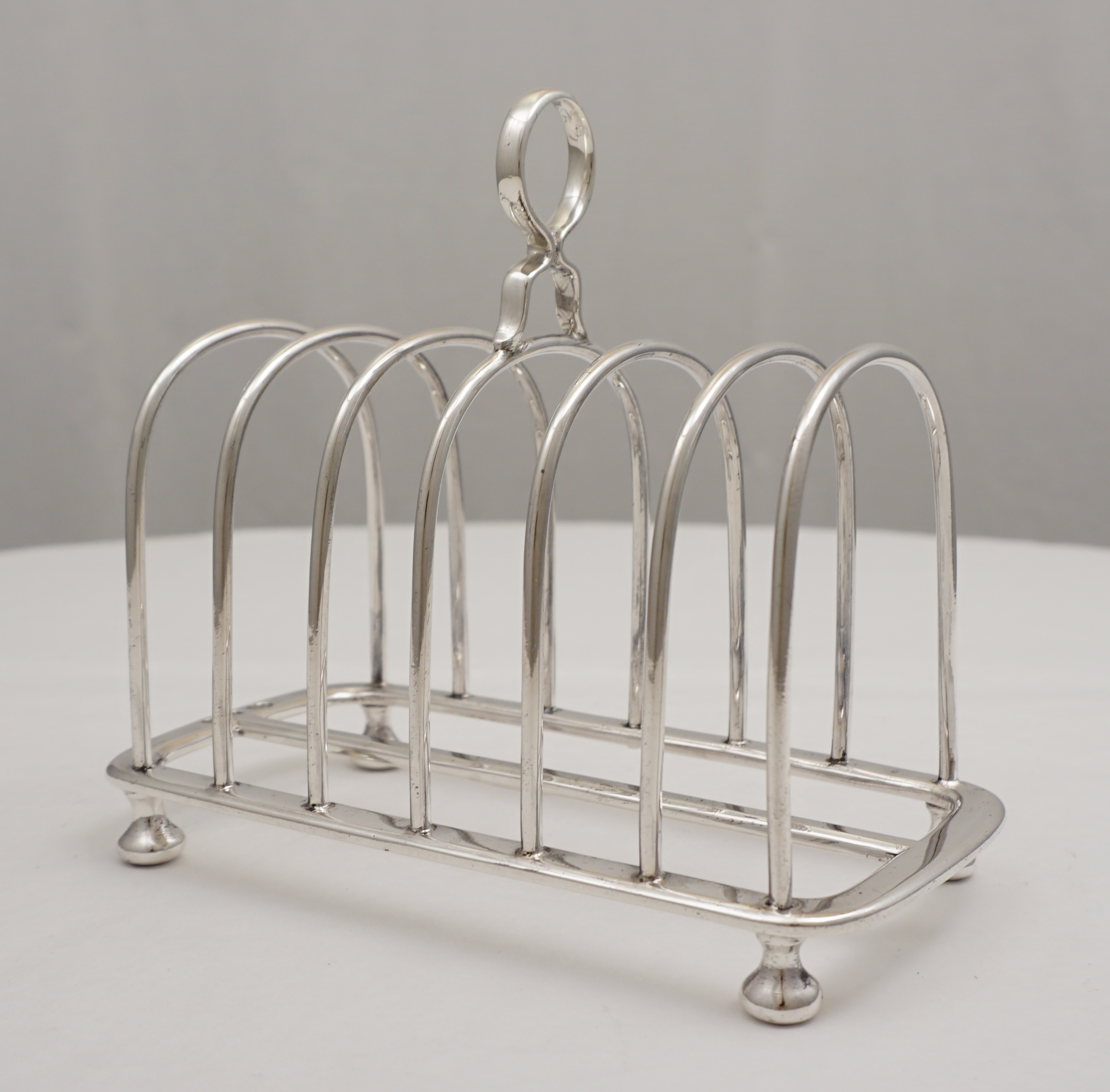 DESCRIPTION | High quality vintage English solid sterling silver 7-bar toast rack with central carrying handle. Heavy, industrial Victorian style, robust construction with thick silver throughout and riveted bars. |