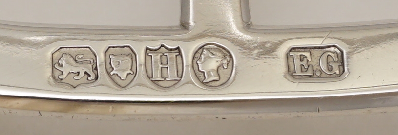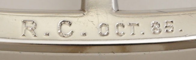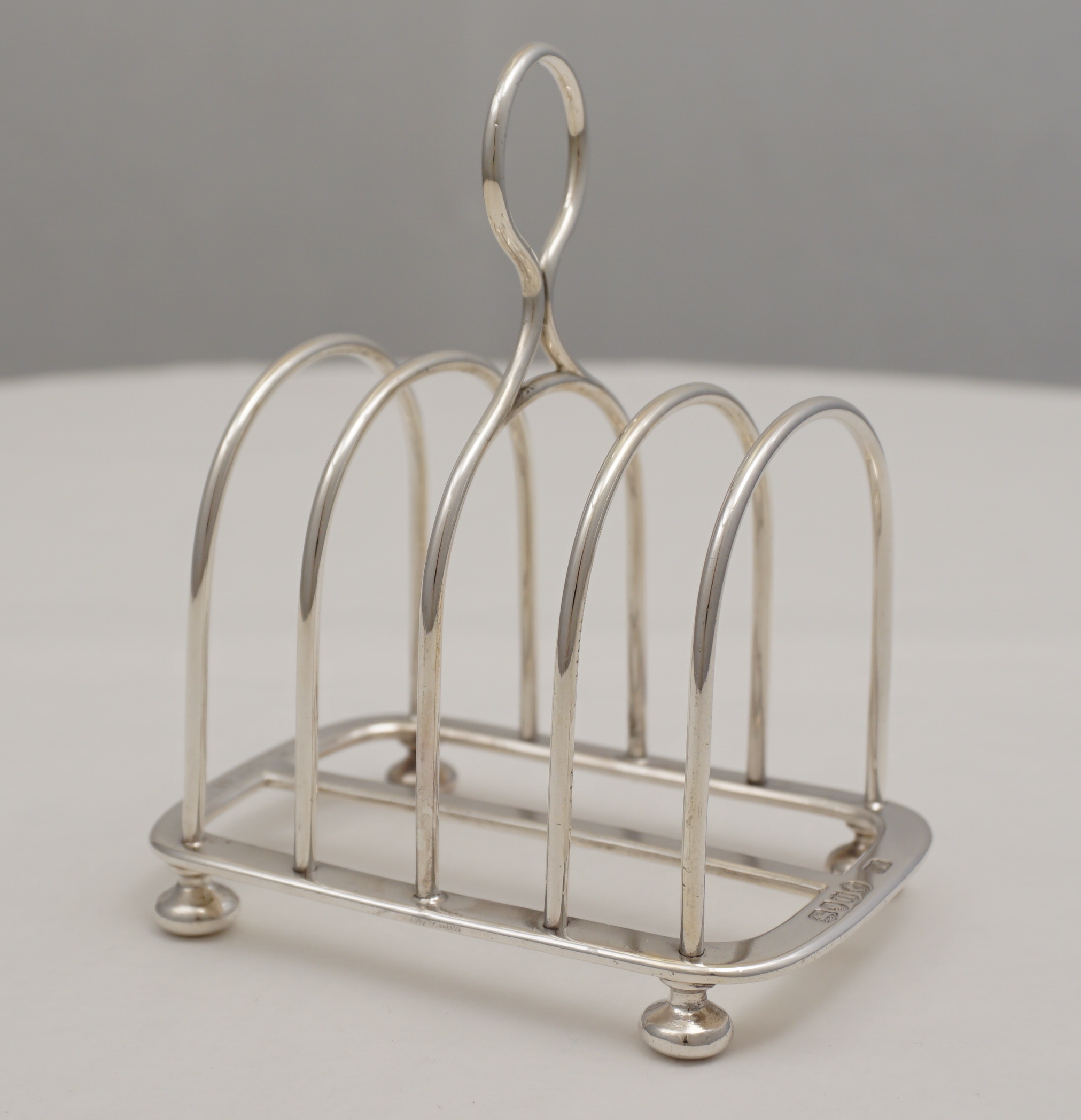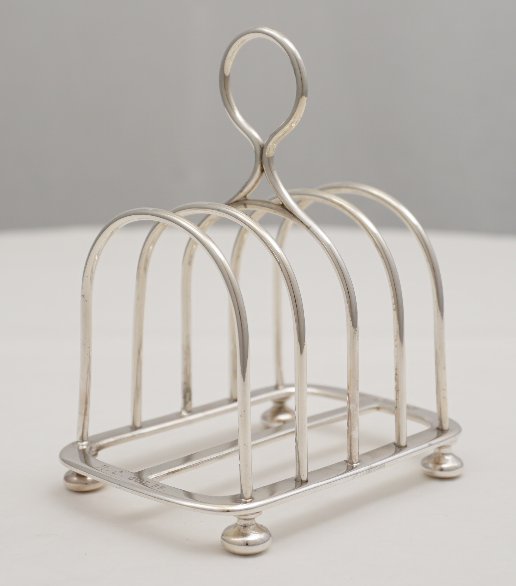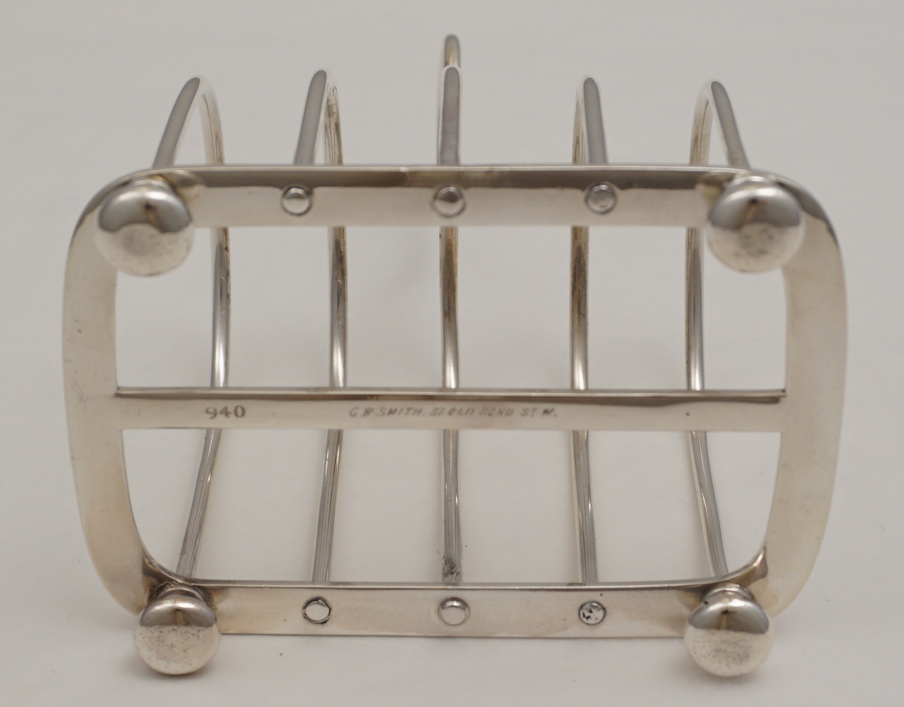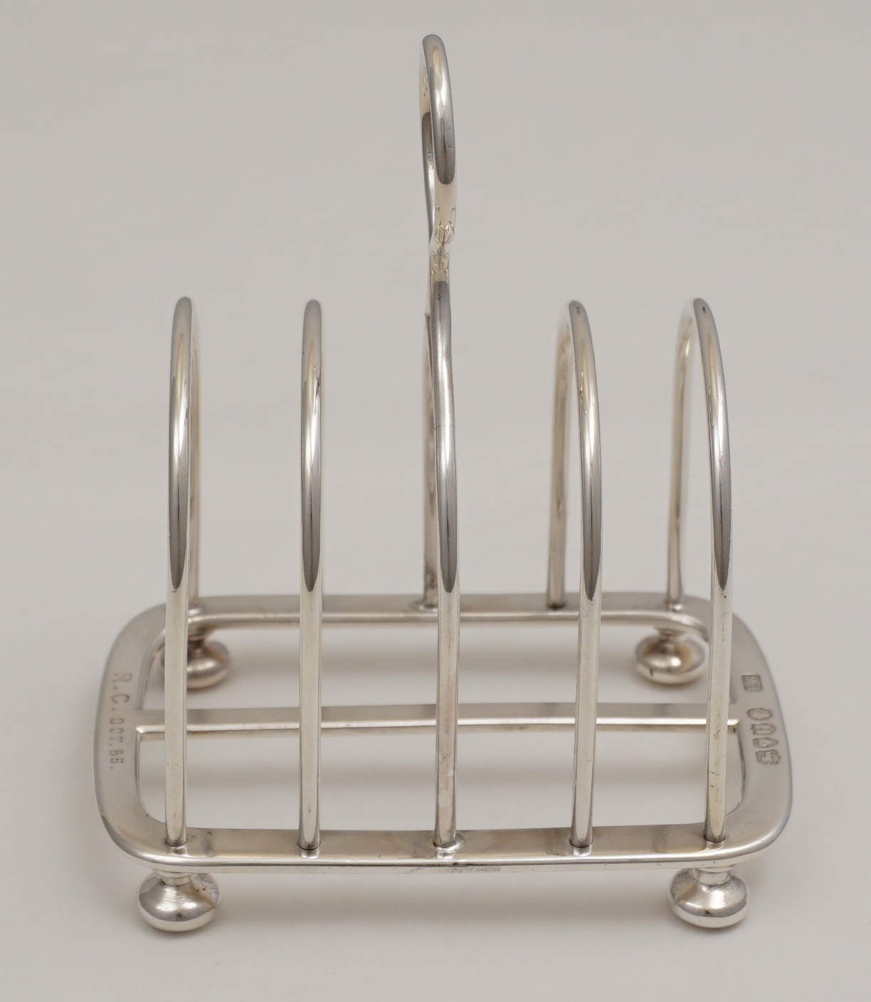 DESCRIPTION | High quality antique English Victorian solid sterling silver 5-bar toast rack with central carrying handle and four bun feet. Discreet engraving 'R.C. OCT.85.' and the retailer's address beneath. |