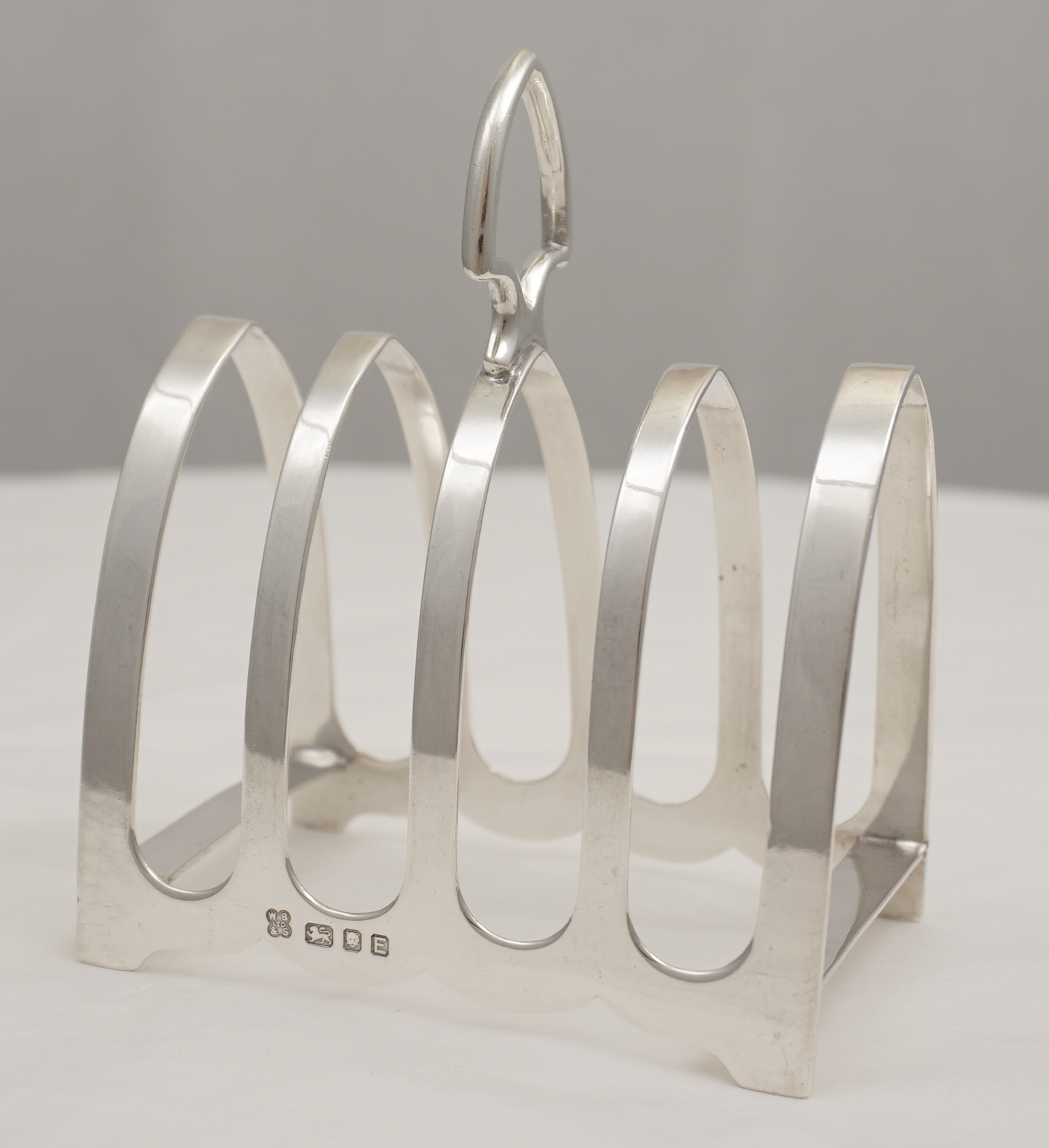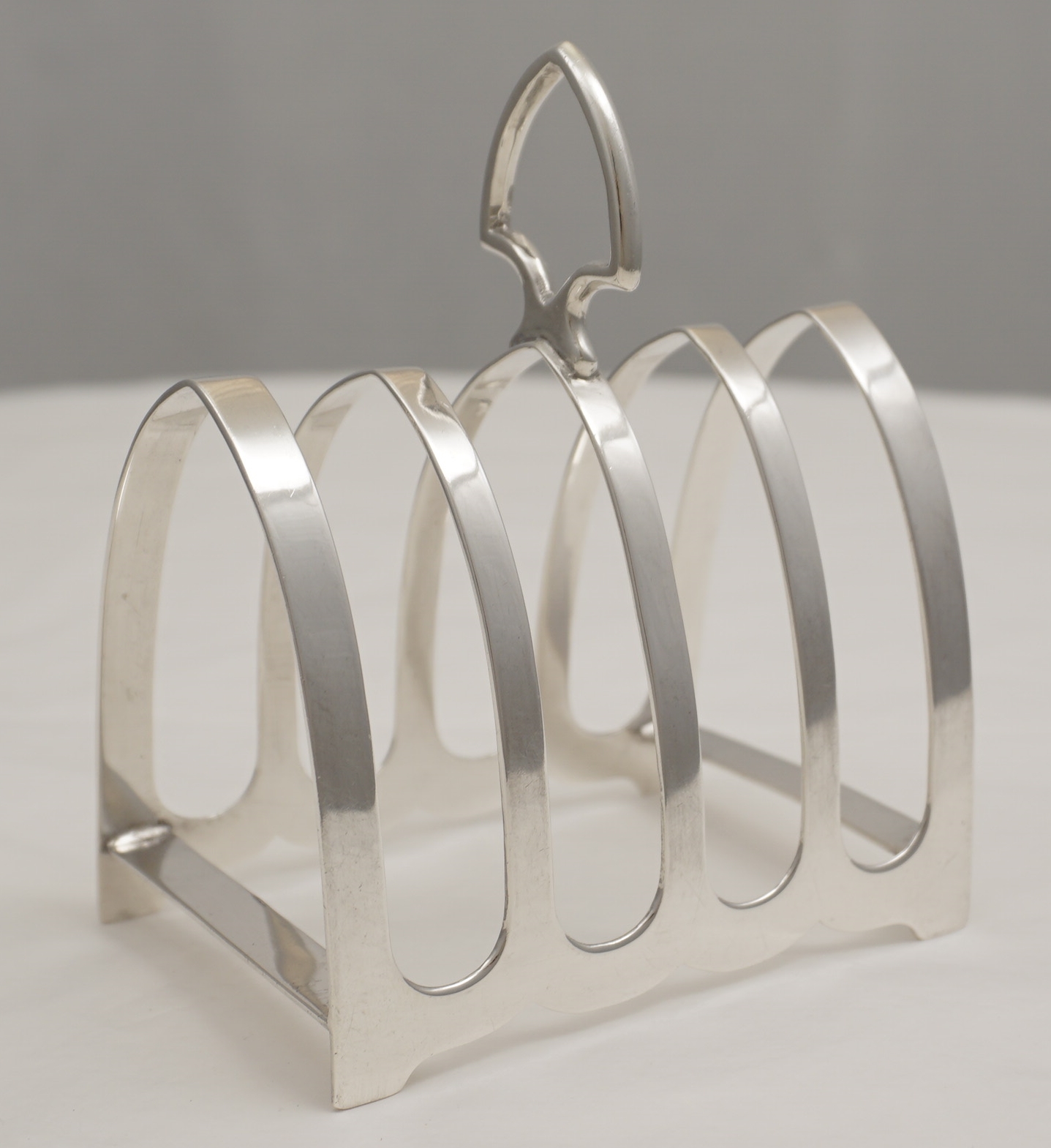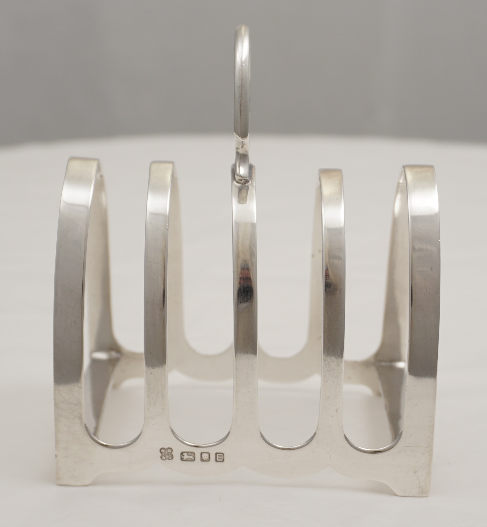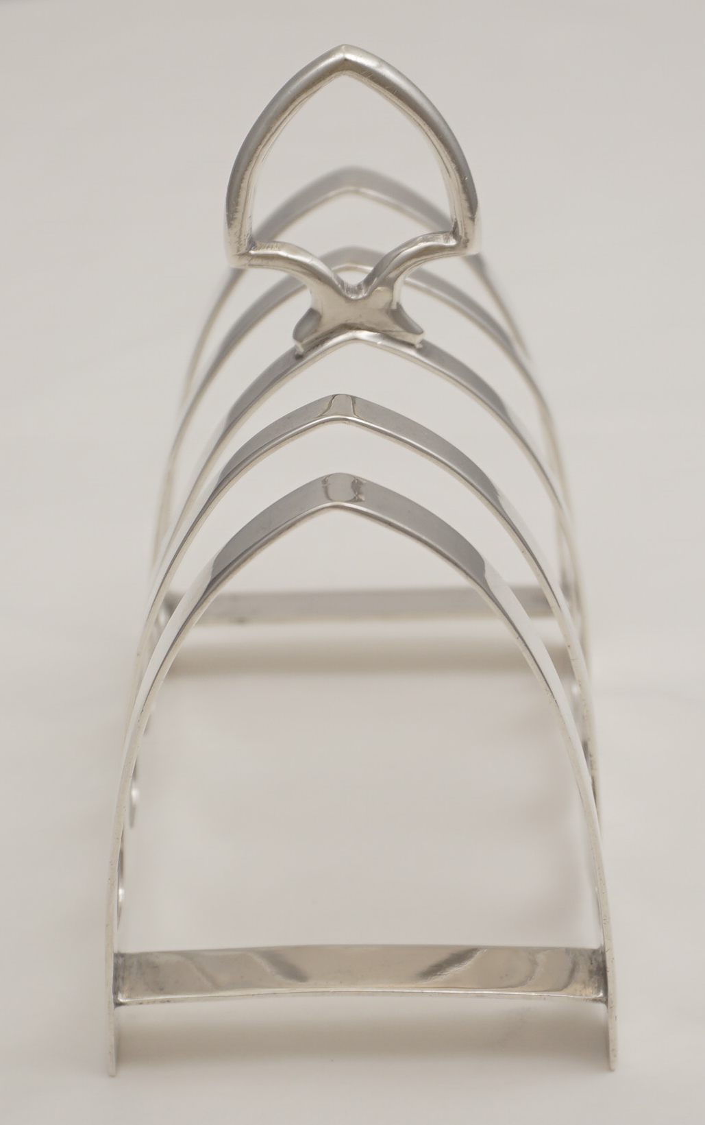DESCRIPTION | Good vintage English solid sterling silver 5-bar gothic arch toast rack with central carrying handle. |