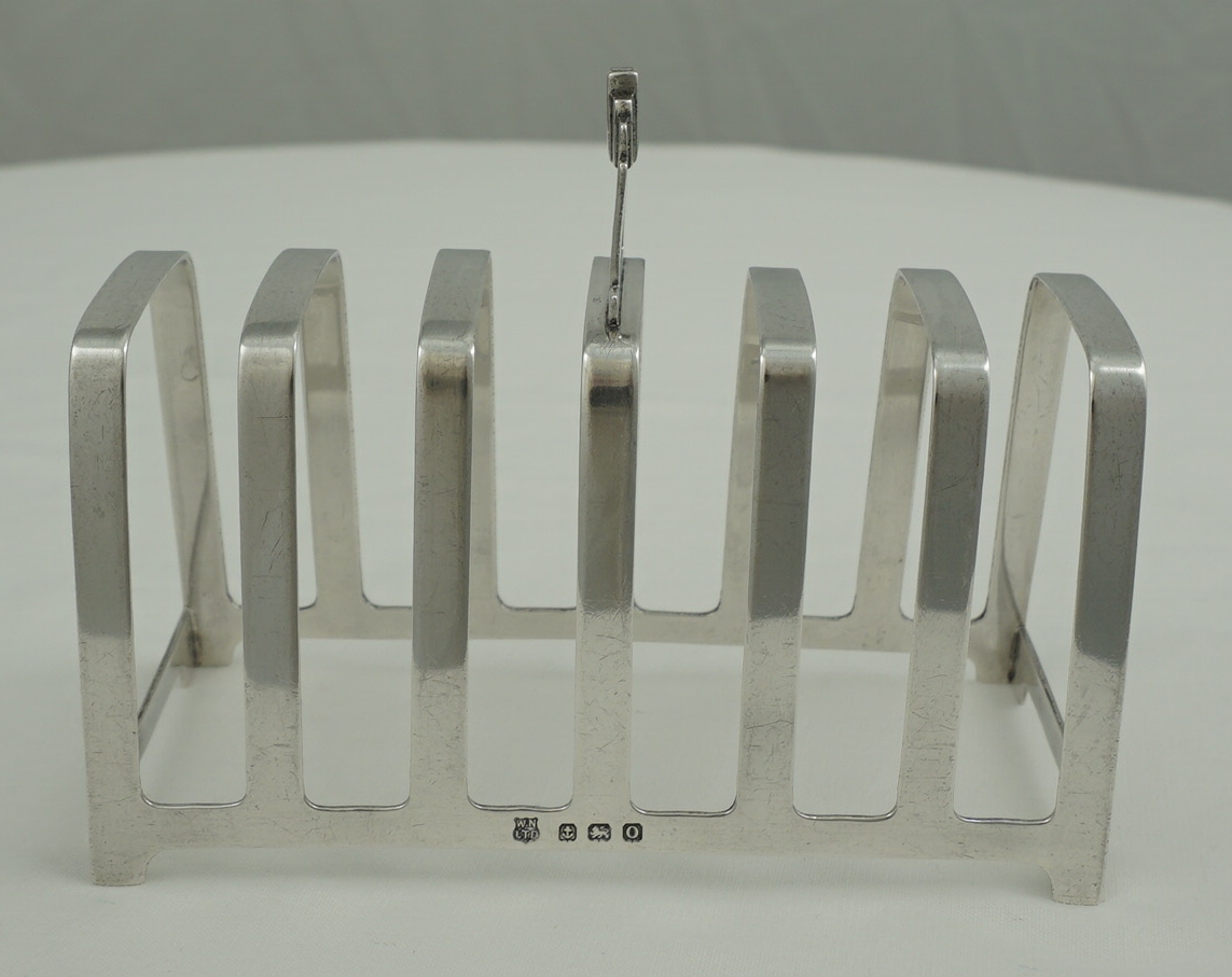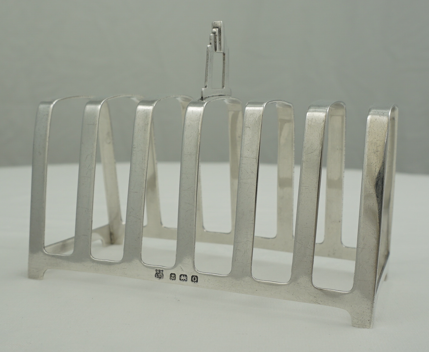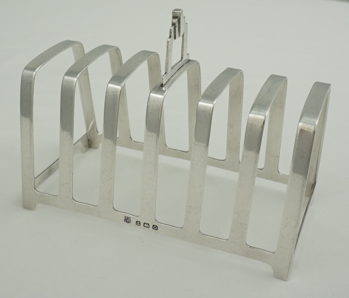 DESCRIPTION | Good quality vintage Art Deco English solid sterling silver 7-bar toast rack with central carrying handle. |
