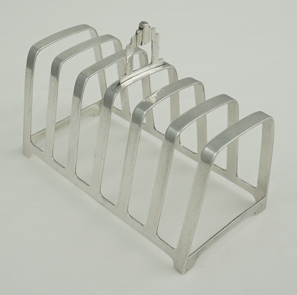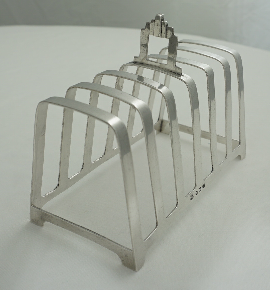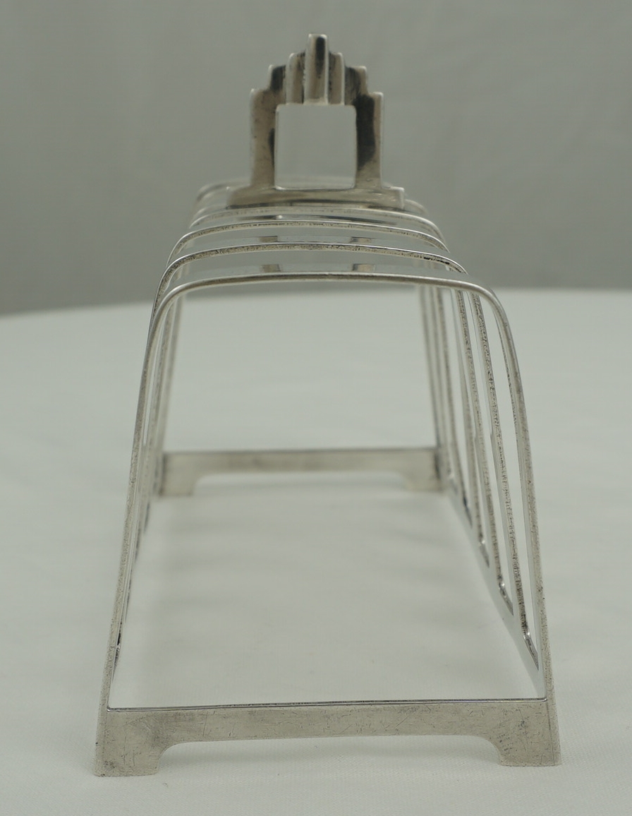 DESCRIPTION | Good quality vintage Art Deco English solid sterling silver 7-bar toast rack with central carrying handle. |