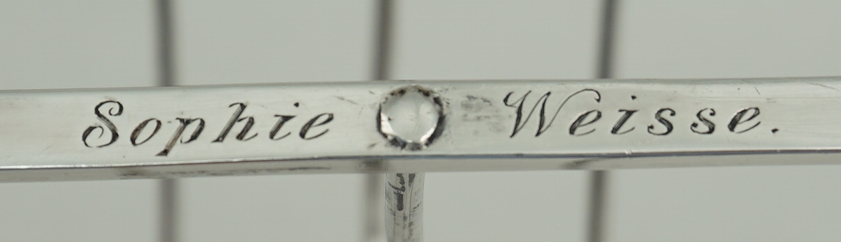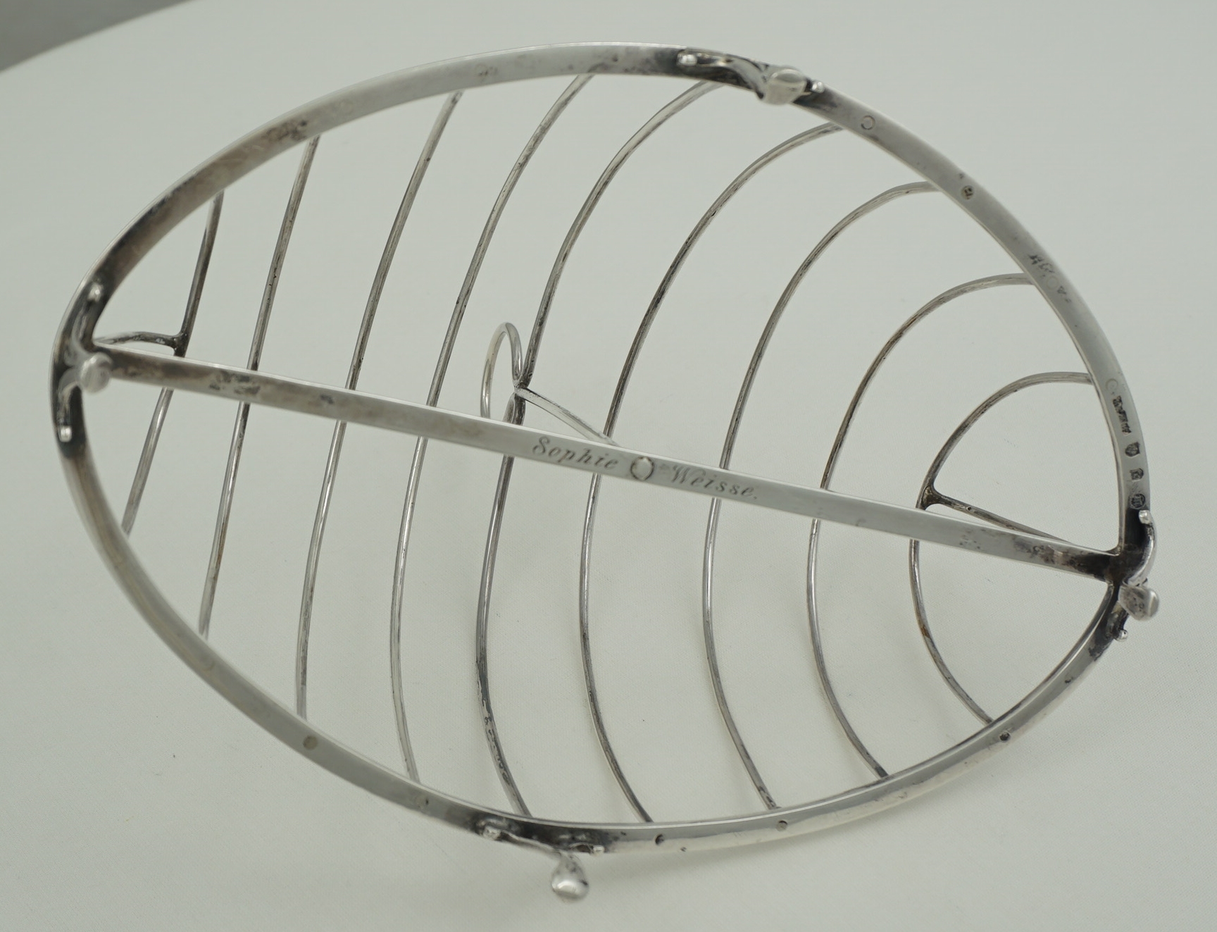DESCRIPTION | The 'Sophie Weisse' antique Victorian Scottish solid sterling silver large 9-bar toast rack with central carrying handle and beautifully name inscribed below the central bar. It is a rare treat to successfully identify the owner of a piece of antique silver but in this instance with the obvious internet search we can not only read her life story but have images too. Is this the same Sophie Weisse I hear you murmur? A Victorian Scottish piece that I bought near Guilford, Surrey, England. It would be too weird for it not be this Sophie's. |