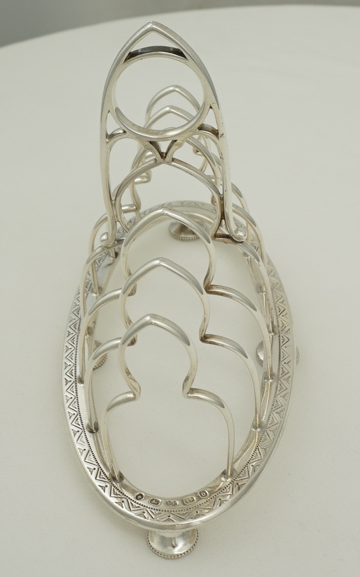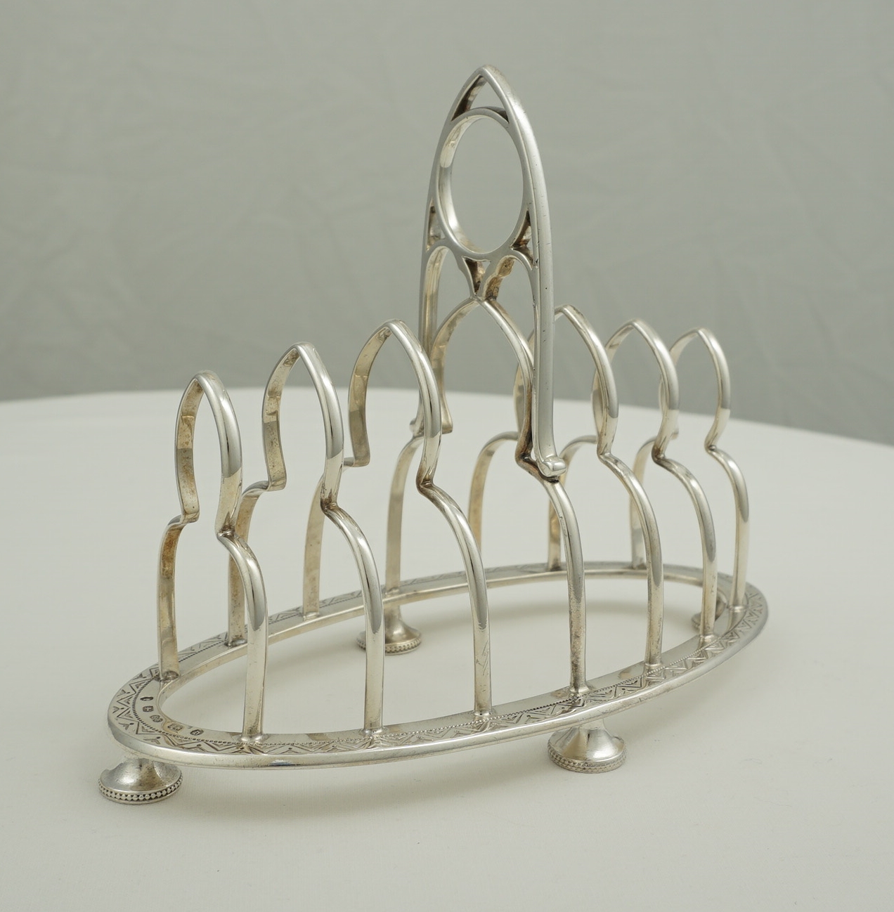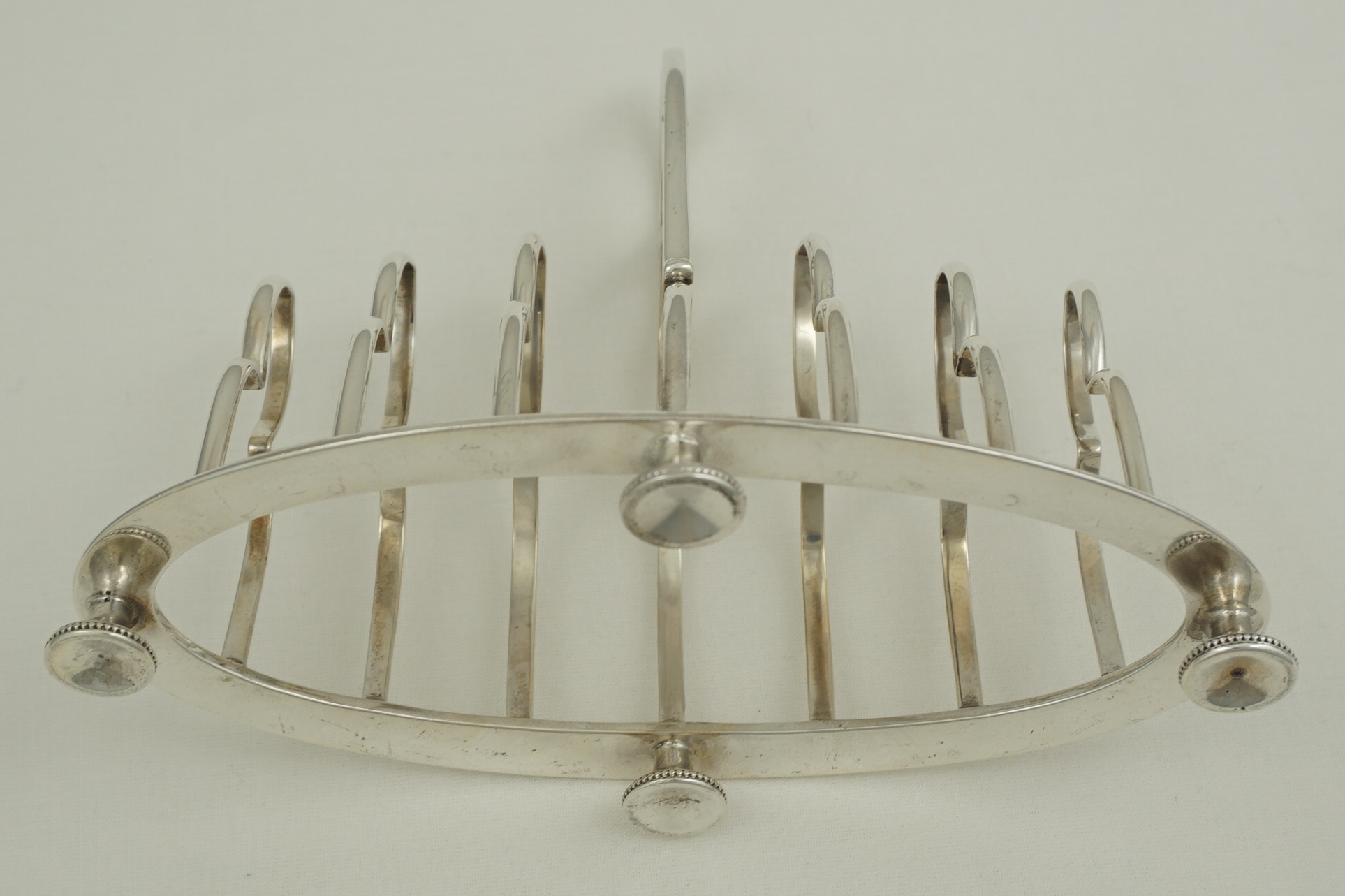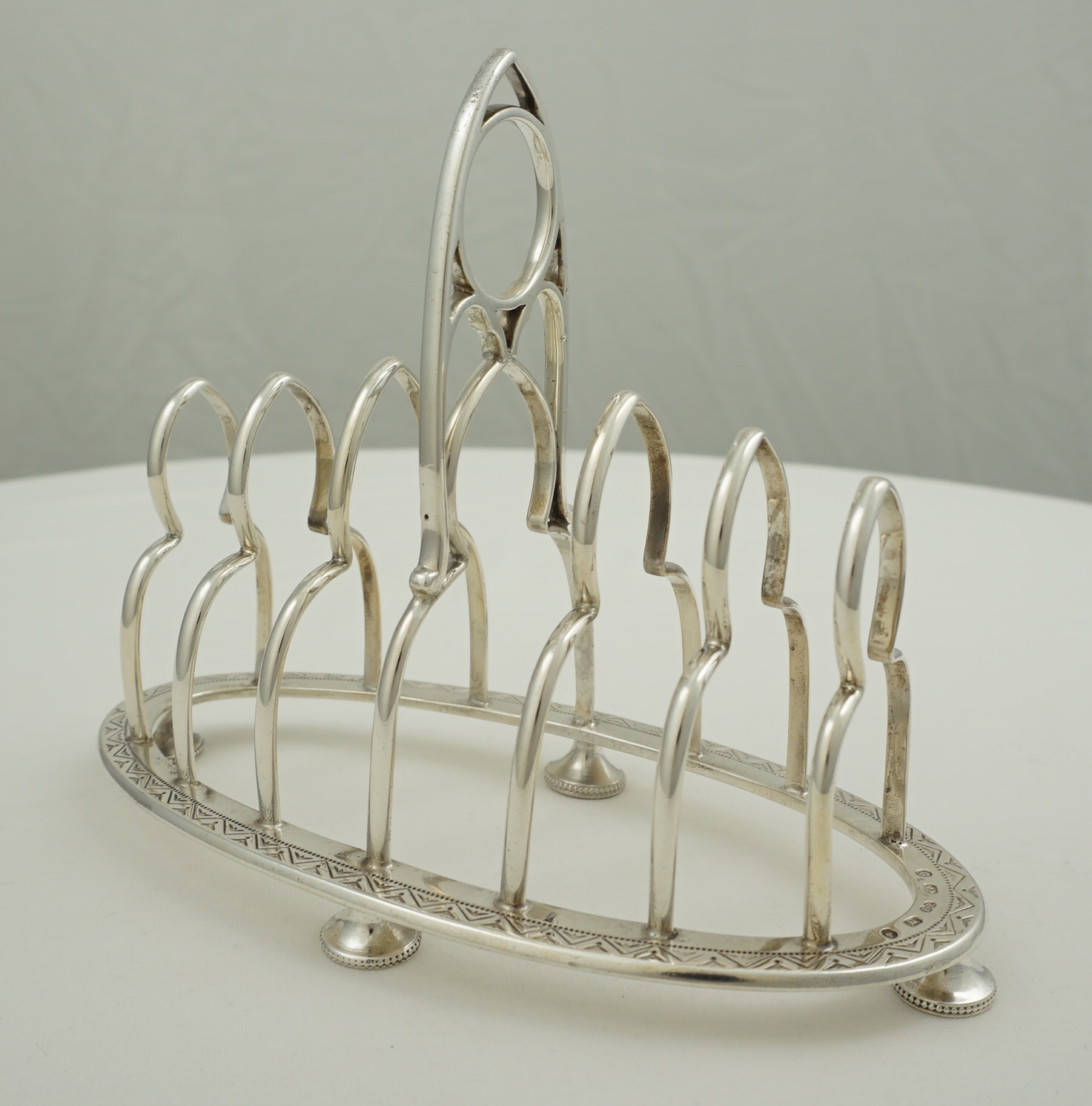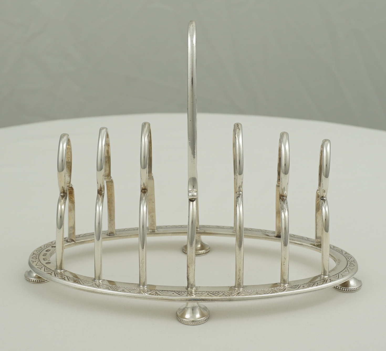 DESCRIPTION | Magnificent, high quality, large and heavy antique English Victorian solid sterling silver 7-bar toast rack with engraved decoration to the oval base plate. |