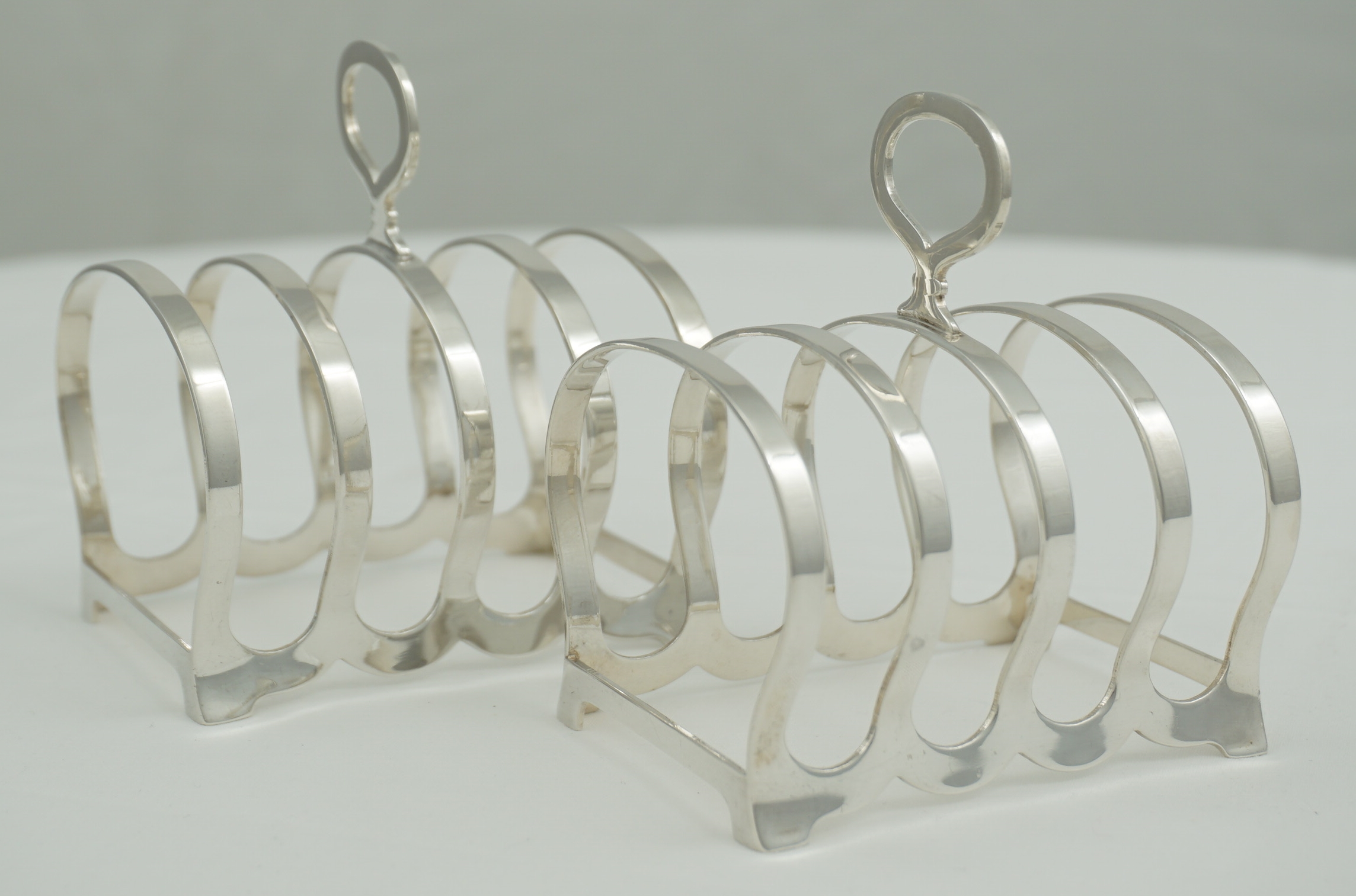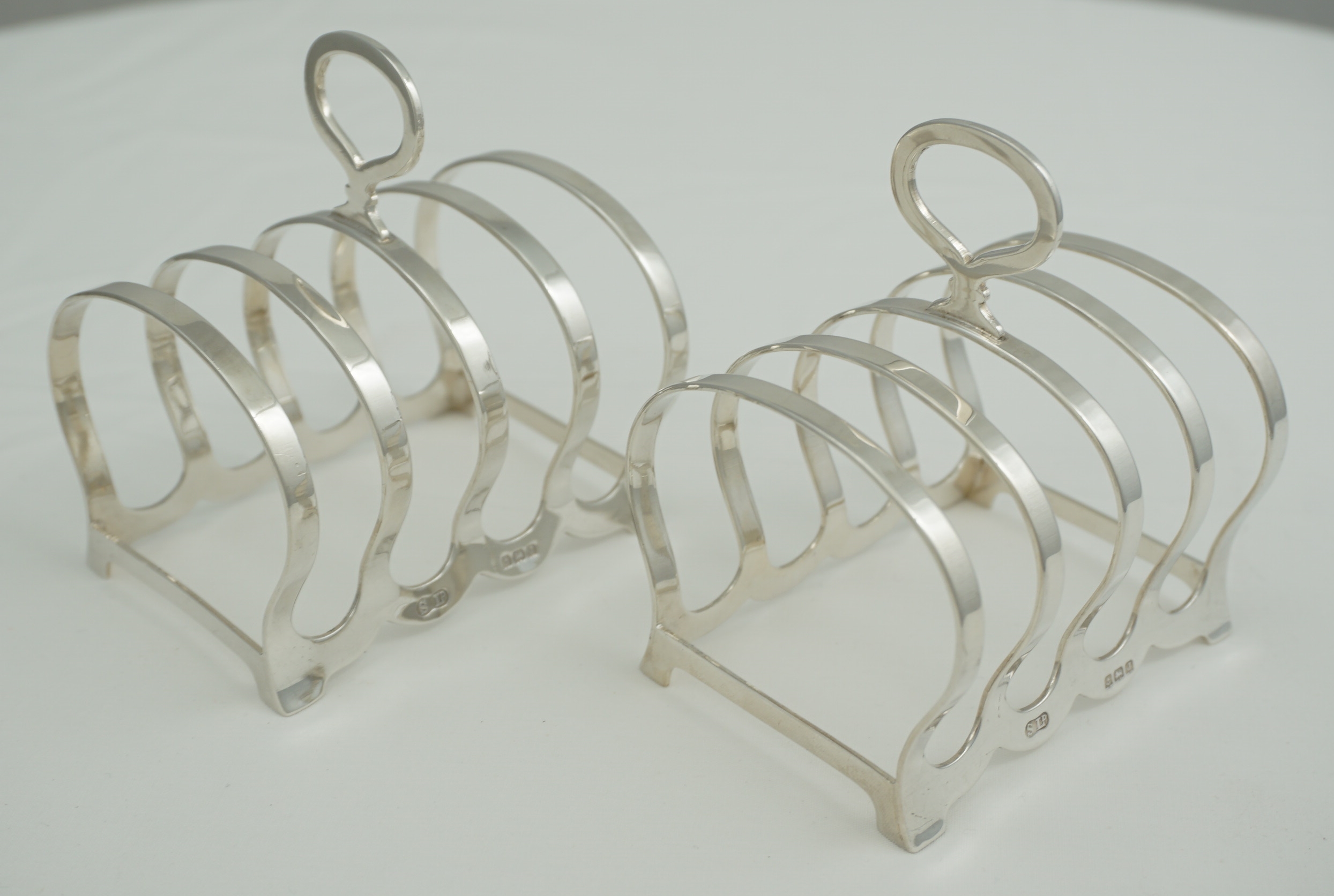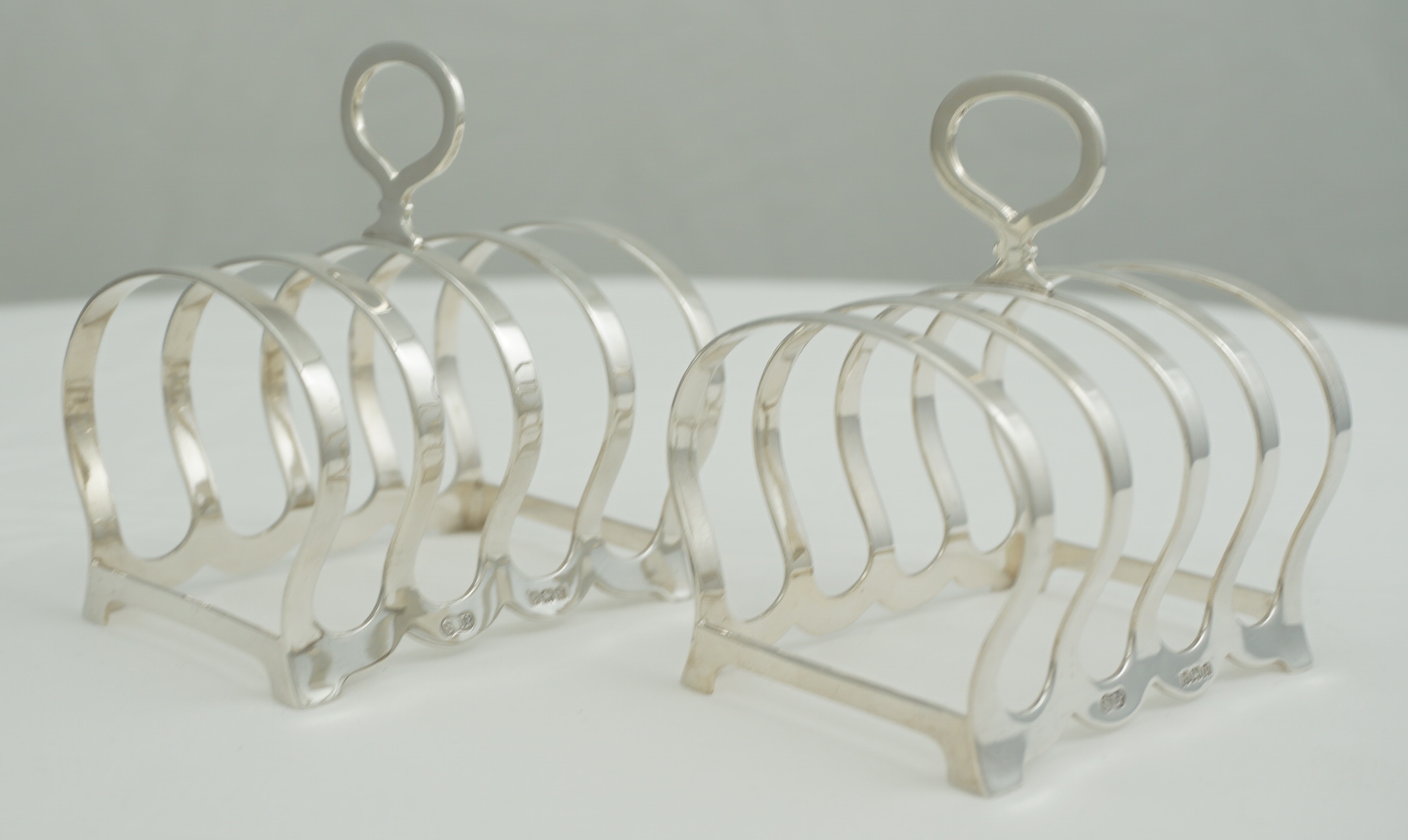 DESCRIPTION | Very good pair of vintage English solid sterling silver 5-bar toast racks within fully fitted original case. |