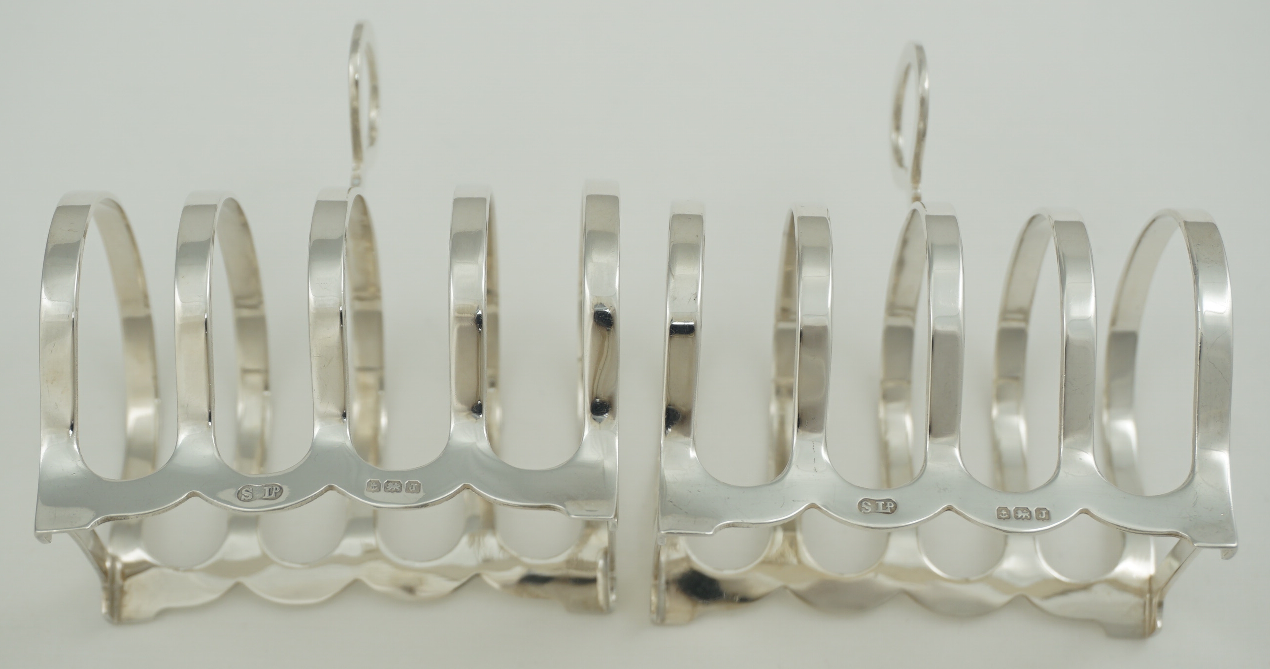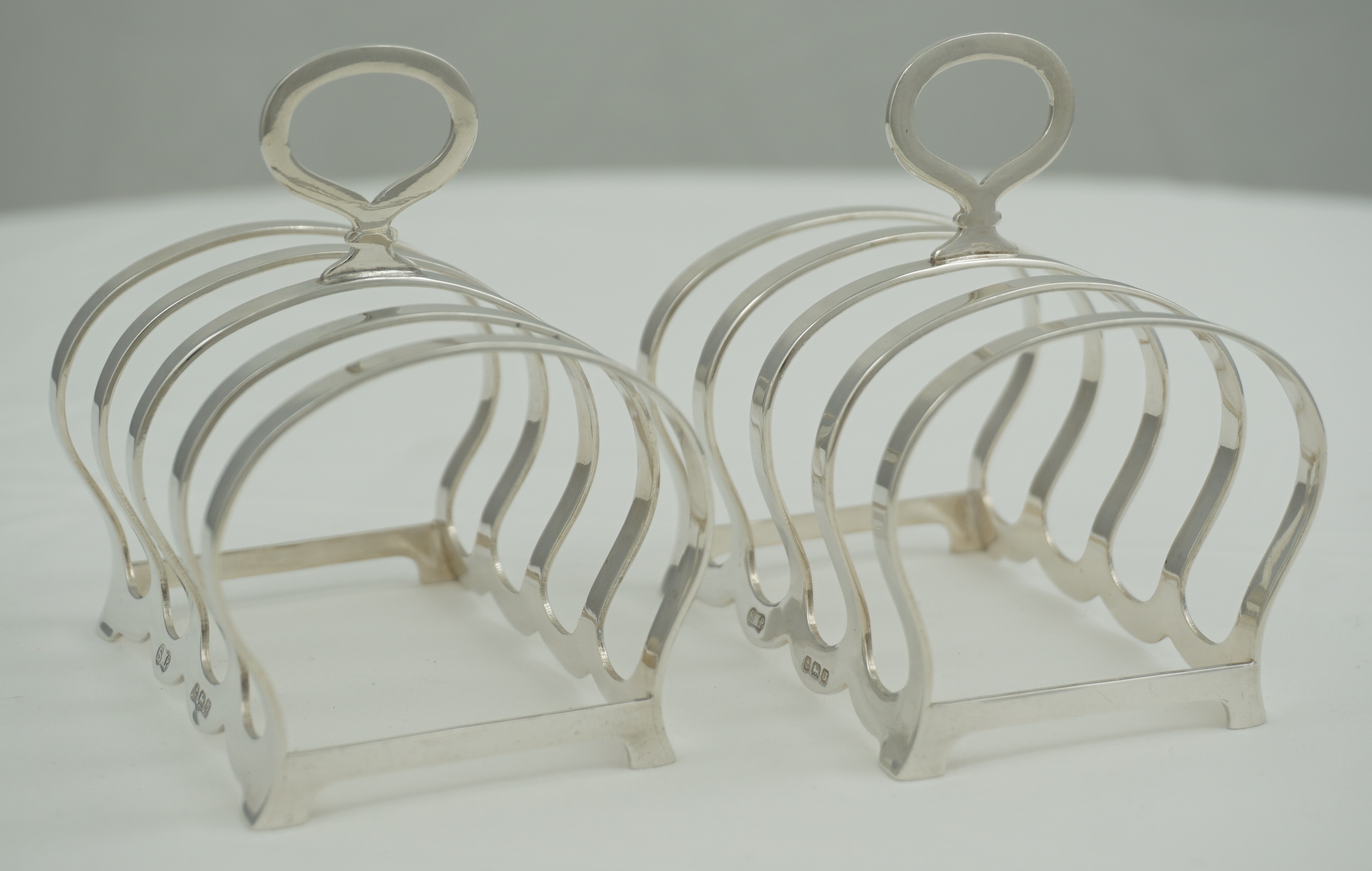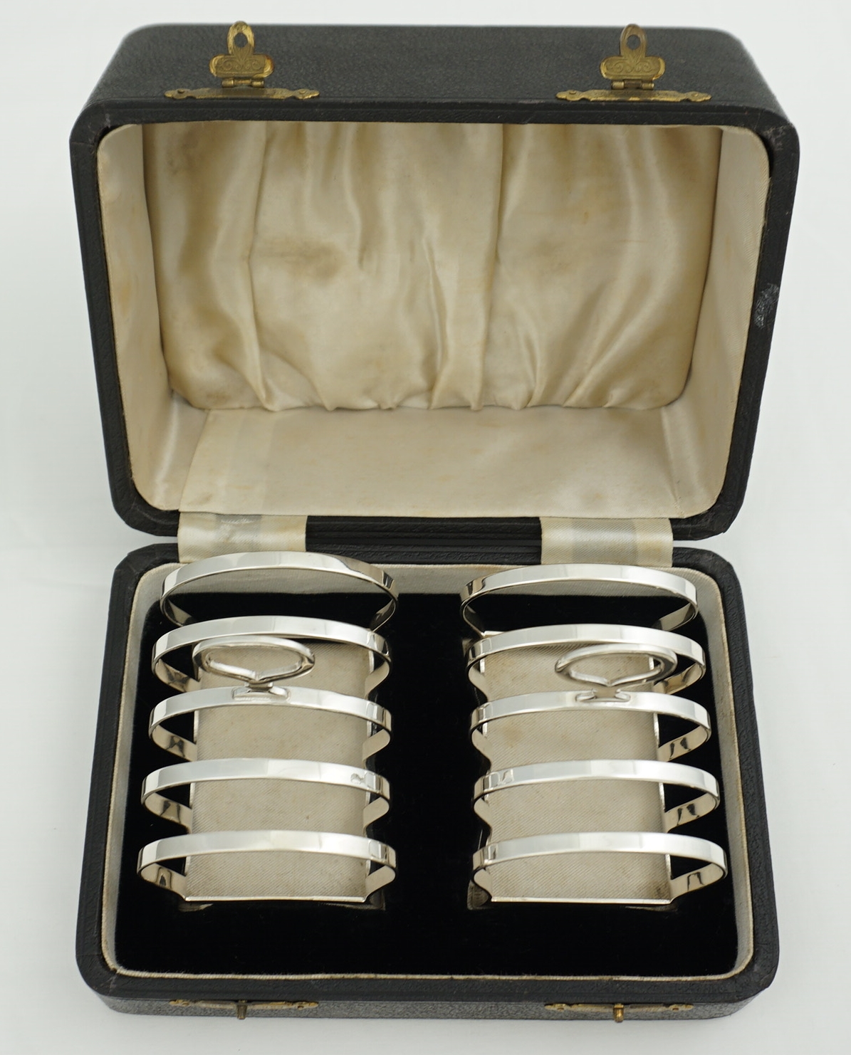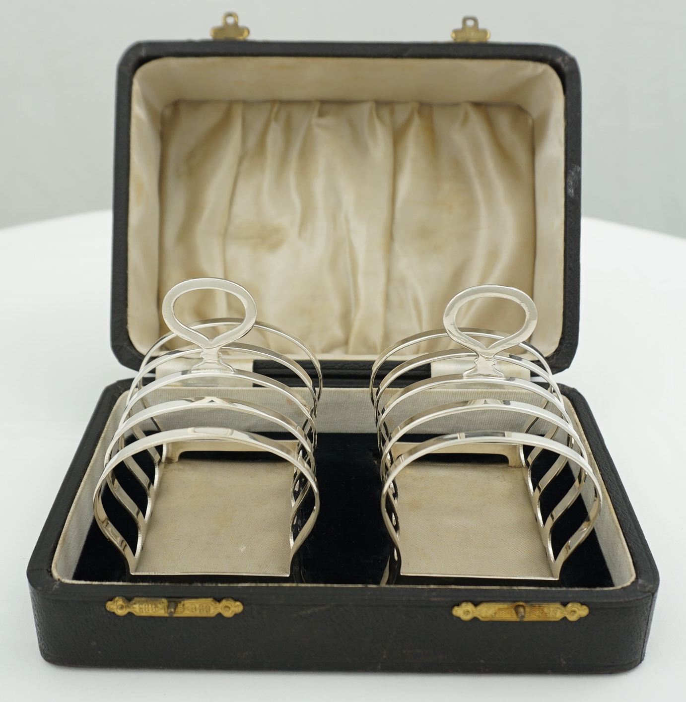 DESCRIPTION | Very good pair of vintage English solid sterling silver 5-bar toast racks within fully fitted original case. |