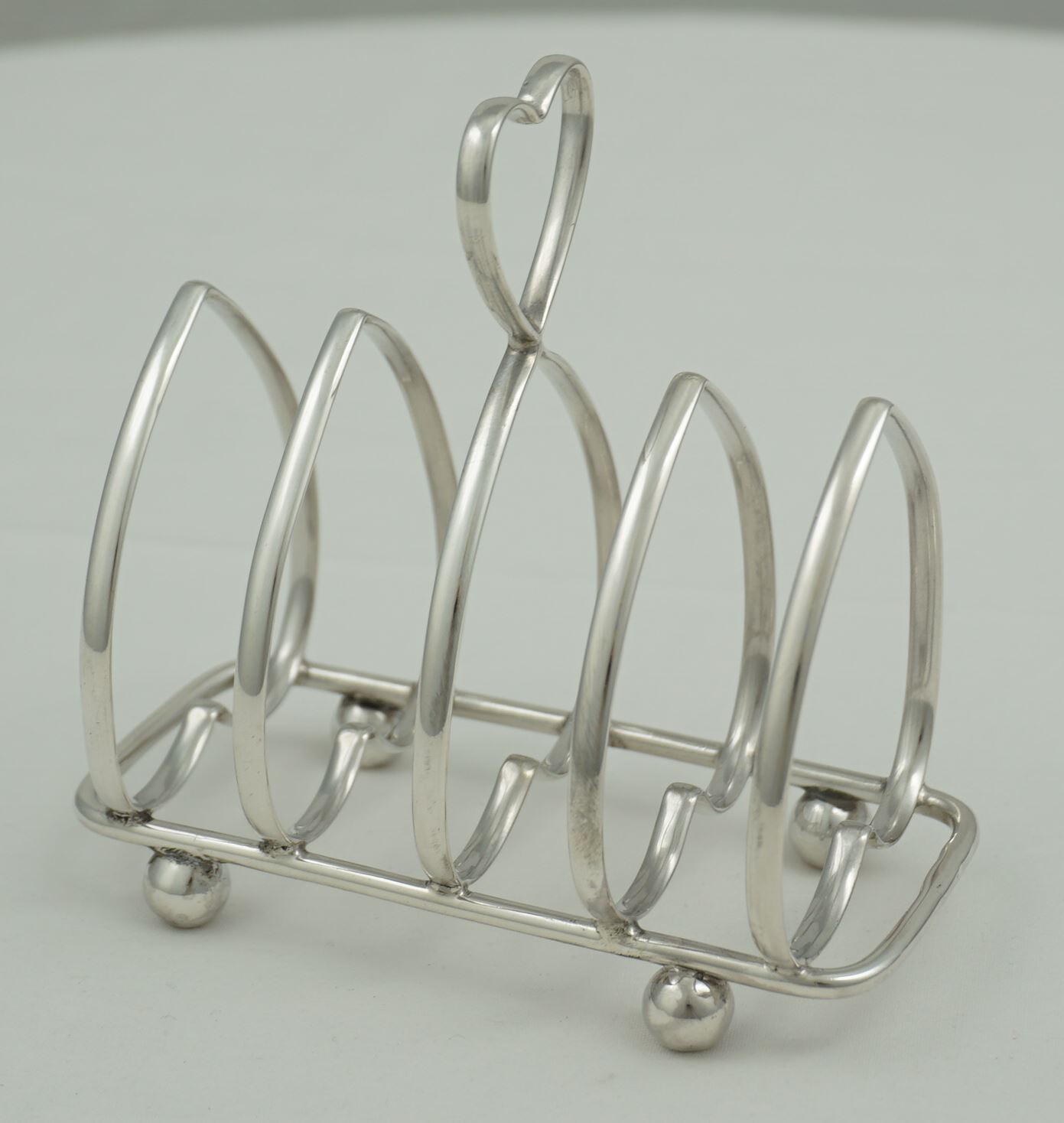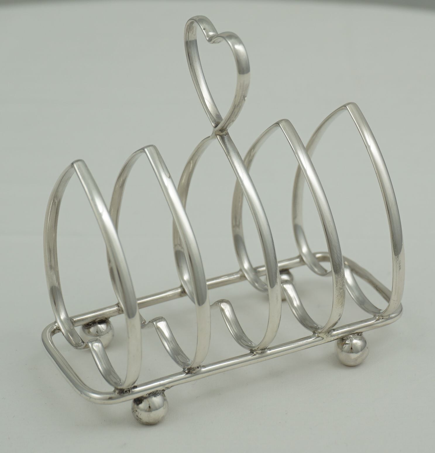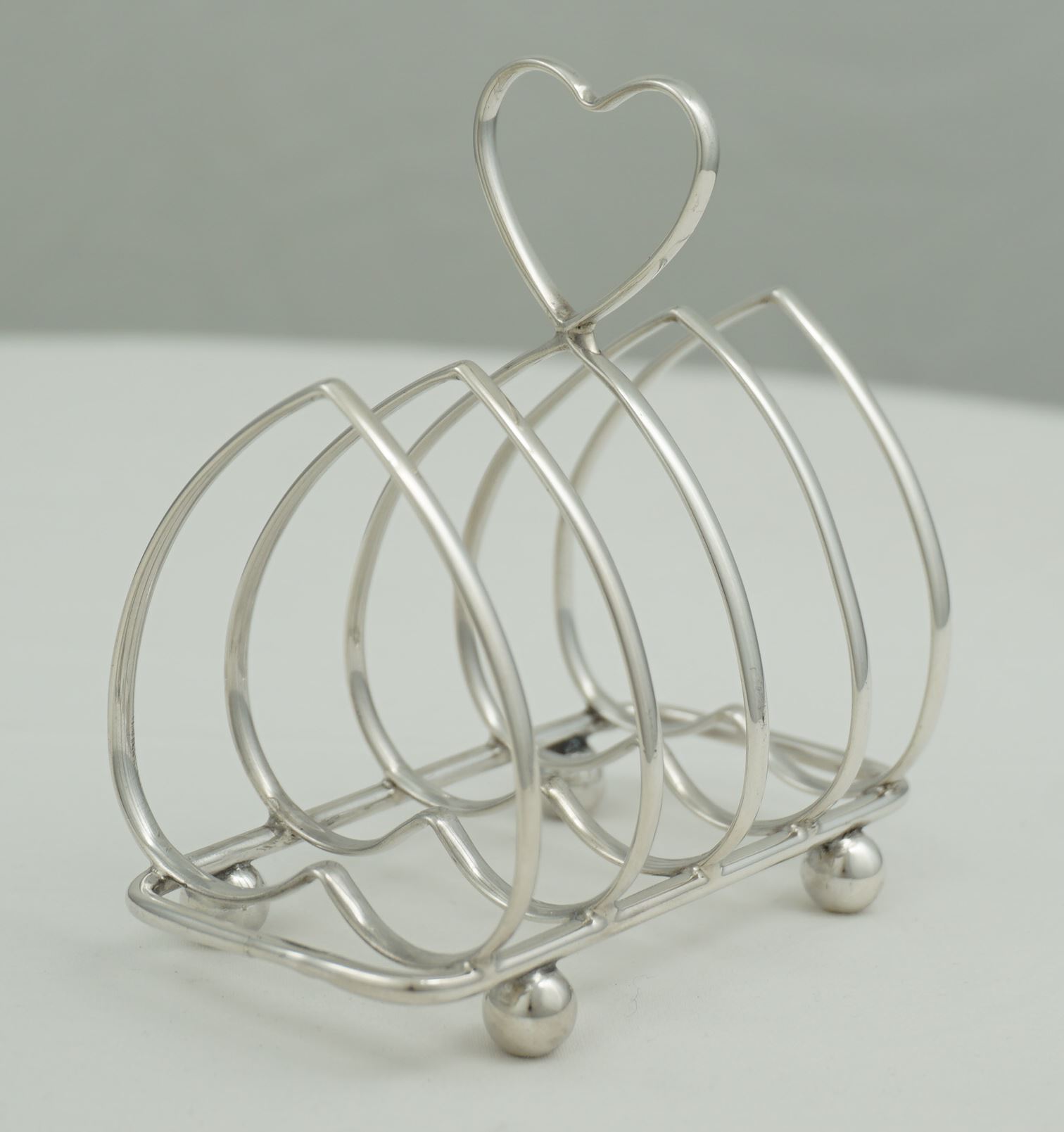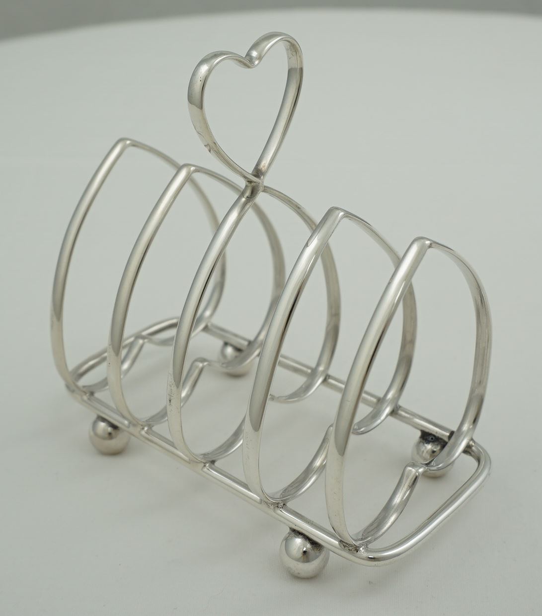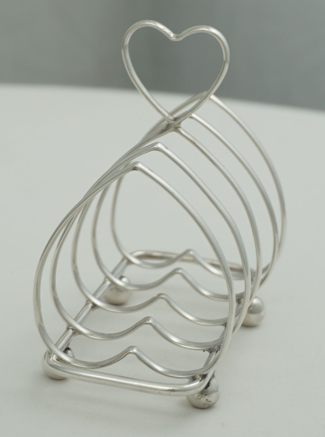 DESCRIPTION | High quality and charming antique English solid sterling silver hearts 5-bar toast rack on four ball feet and with heart form central carrying handle. |