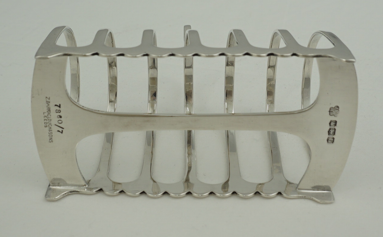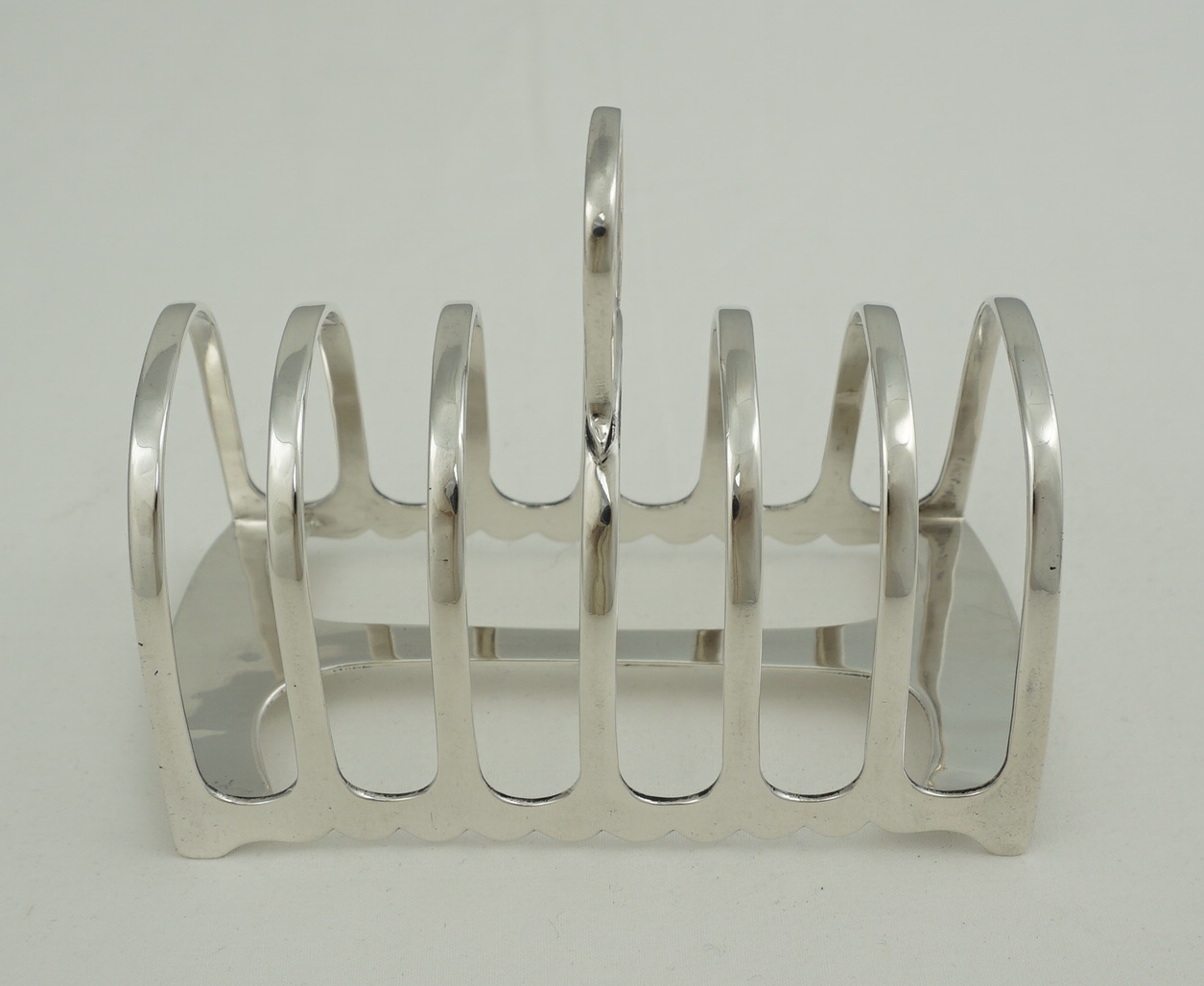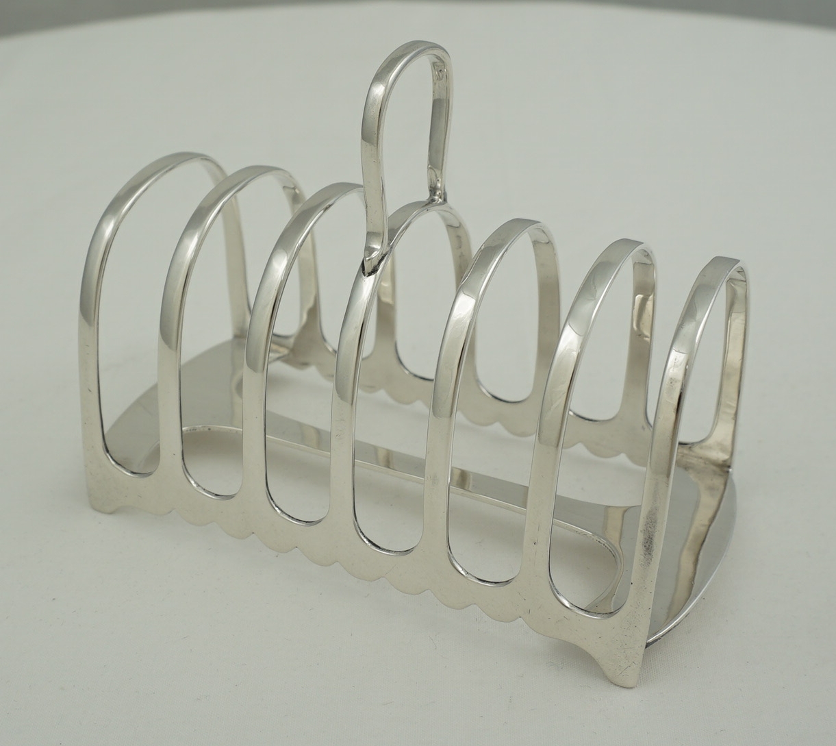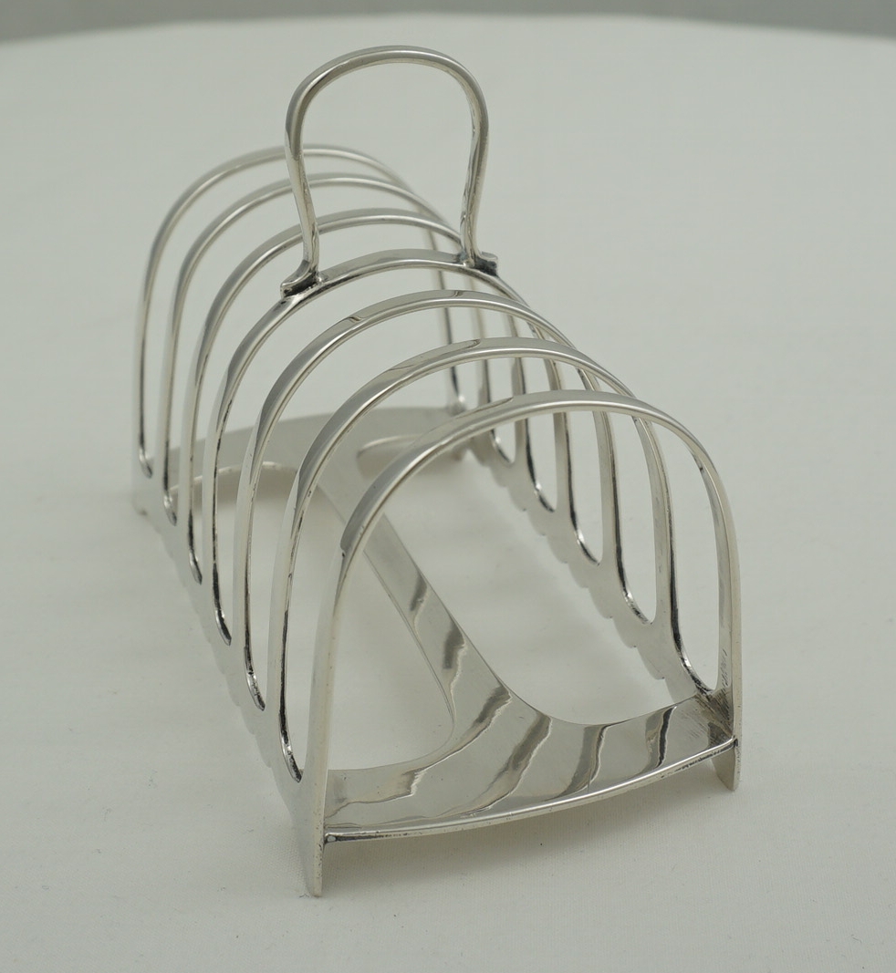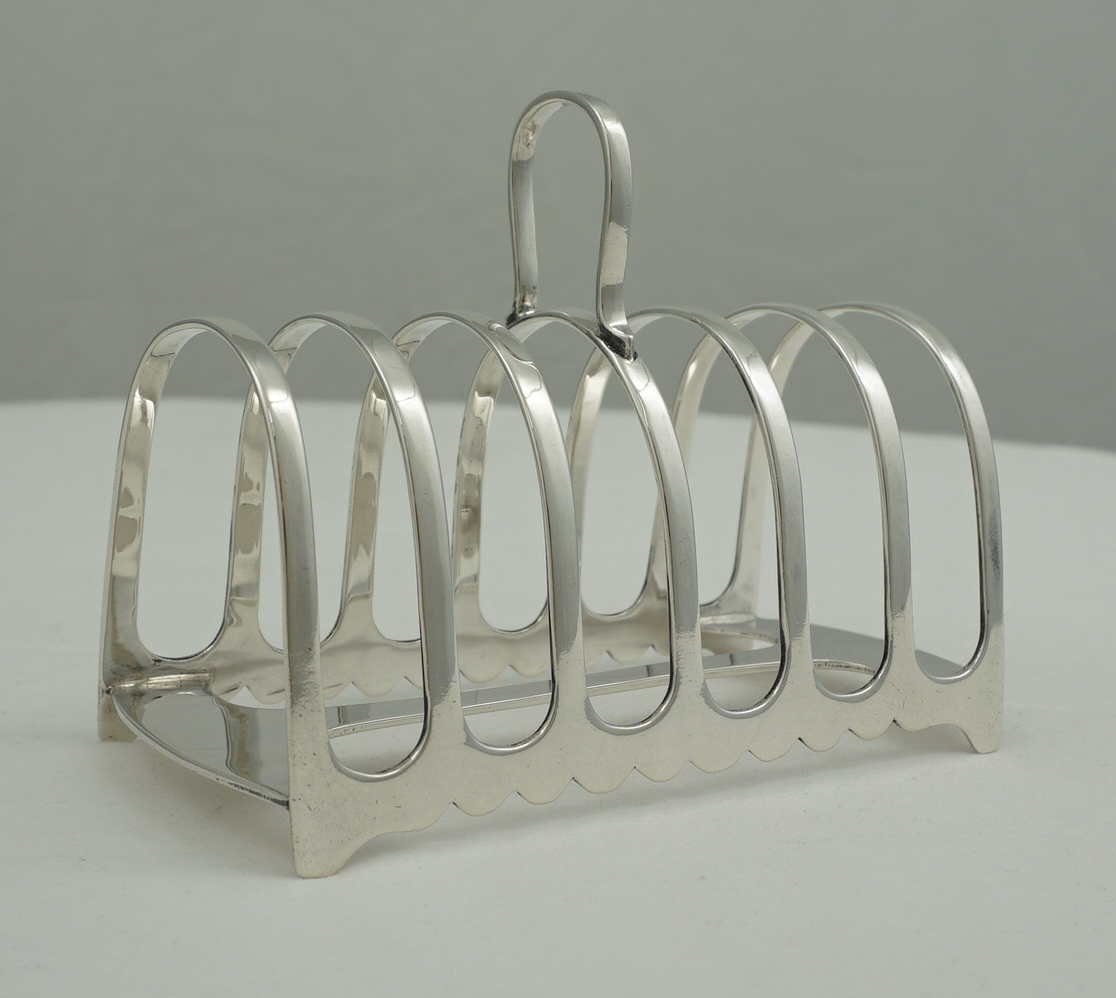 DESCRIPTION | Sturdy antique English solid sterling silver 7-bar toast rack with central carrying handle. |