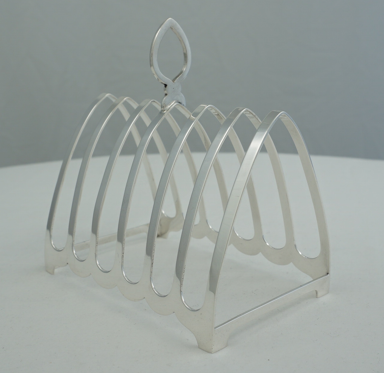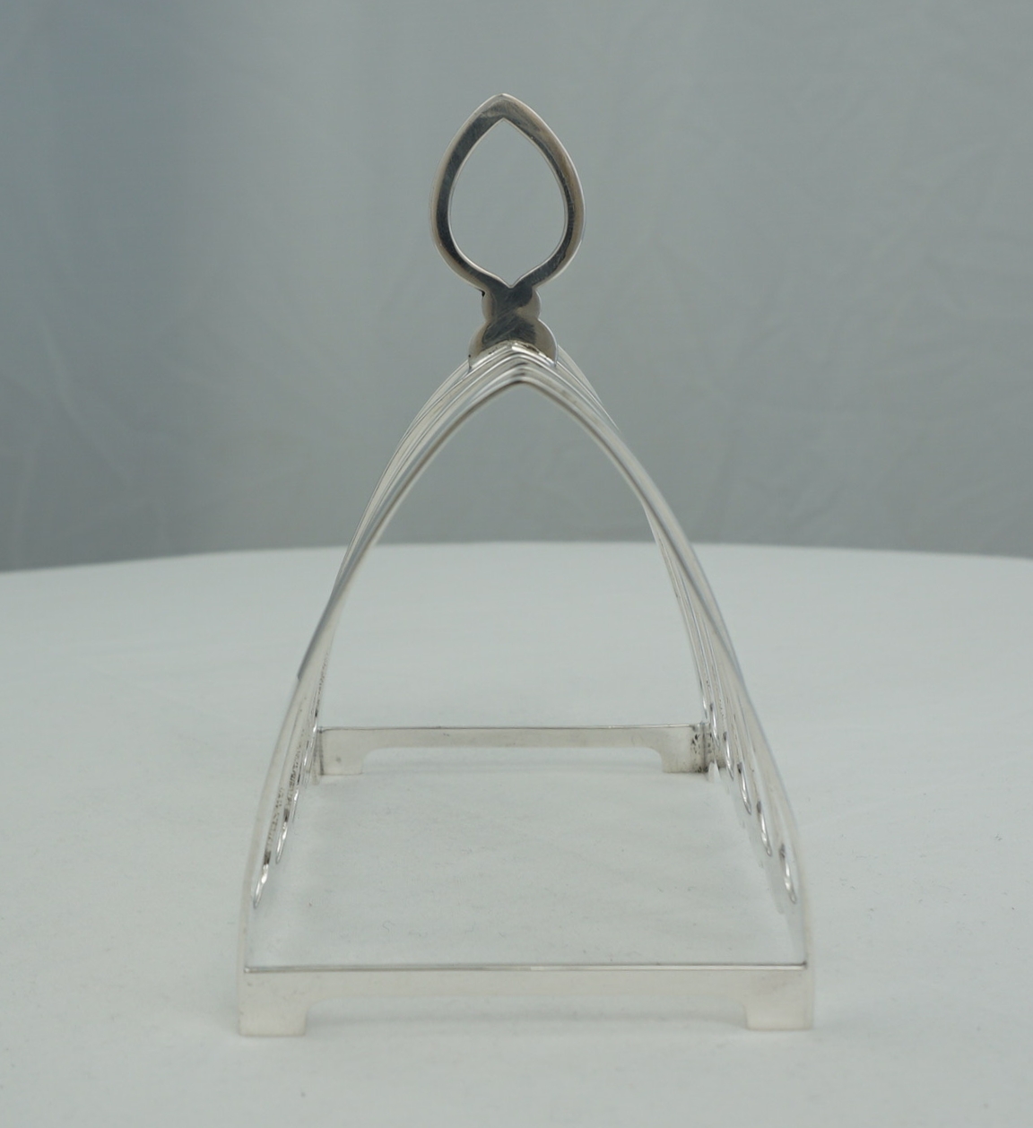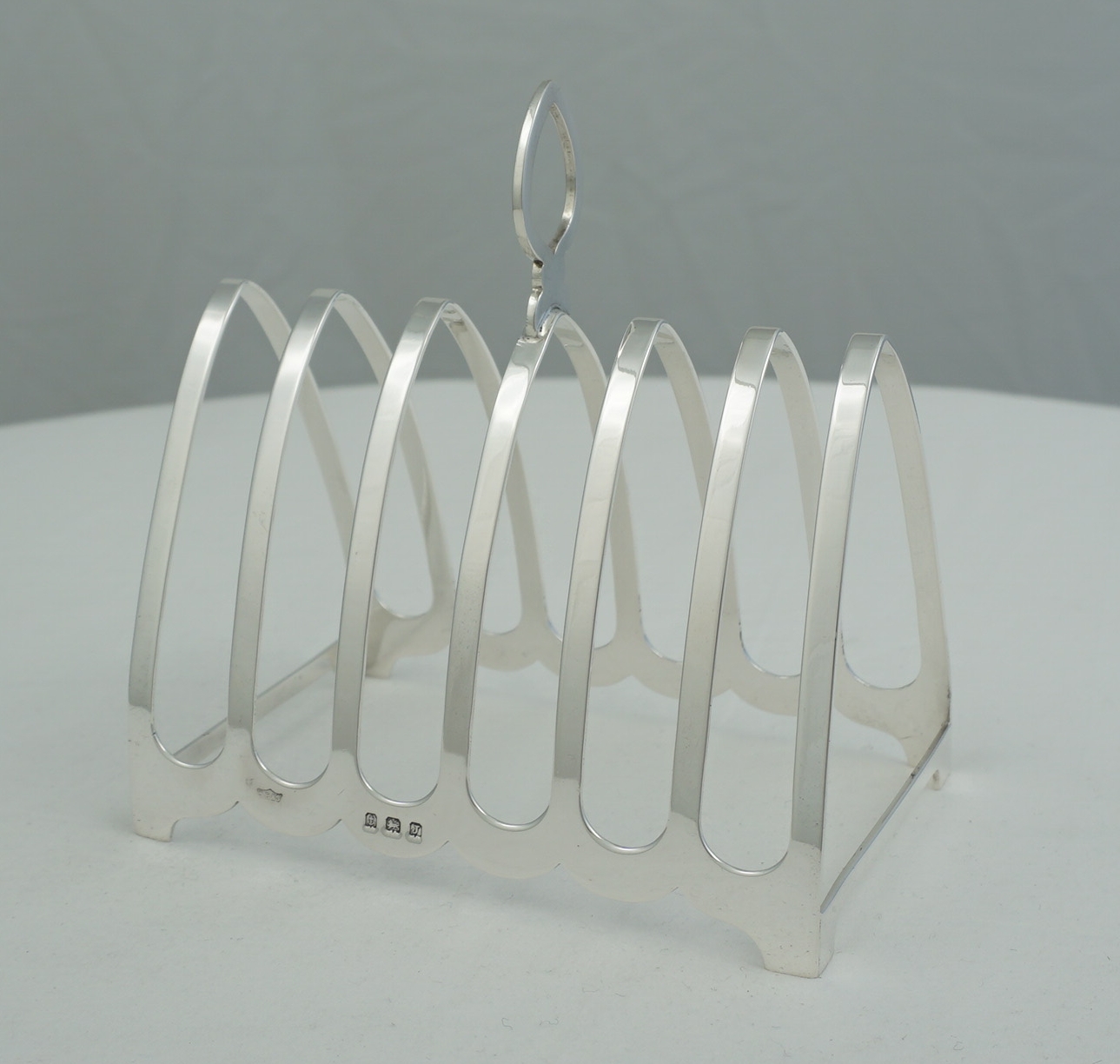 DESCRIPTION | Large vintage English solid sterling silver 7-bar toast rack with central carrying handle. |