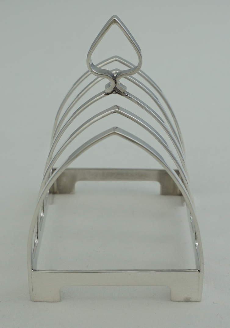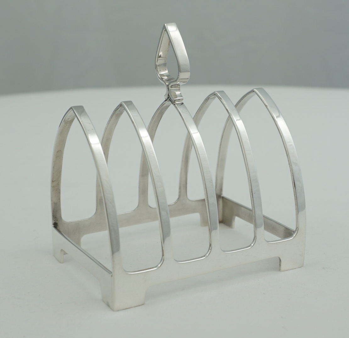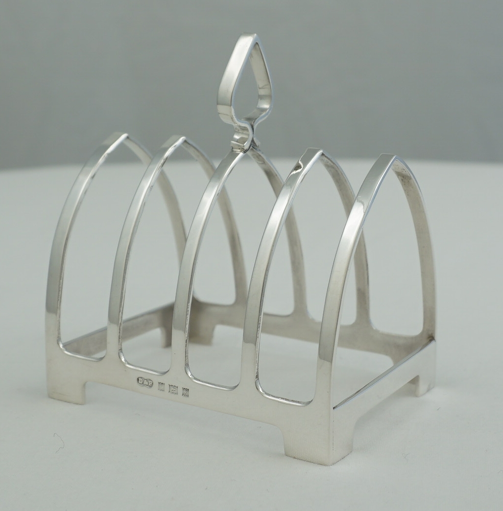 DESCRIPTION | Cute little vintage English solid sterling silver 5-bar toast rack with central carrying handle. |