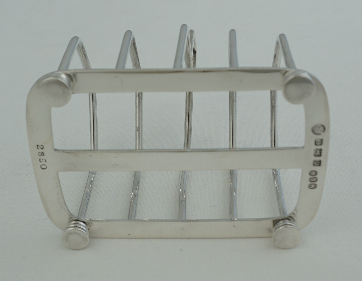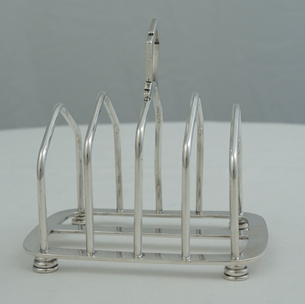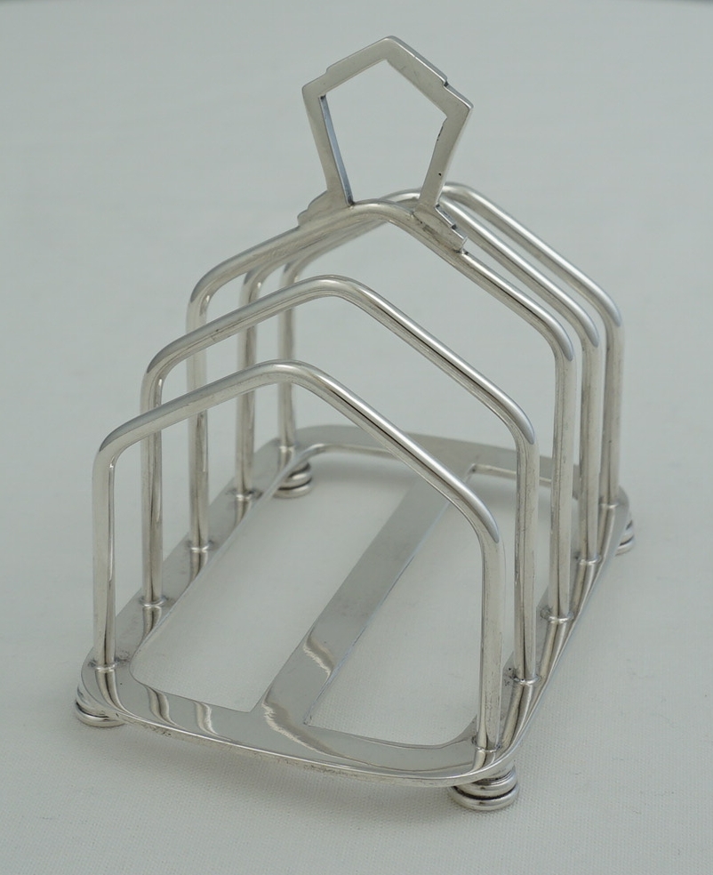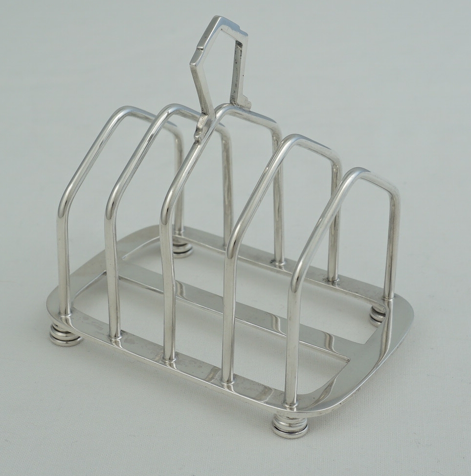 DESCRIPTION | High quality vintage Art Deco English solid sterling silver 5-bar toast rack with central carrying handle. |